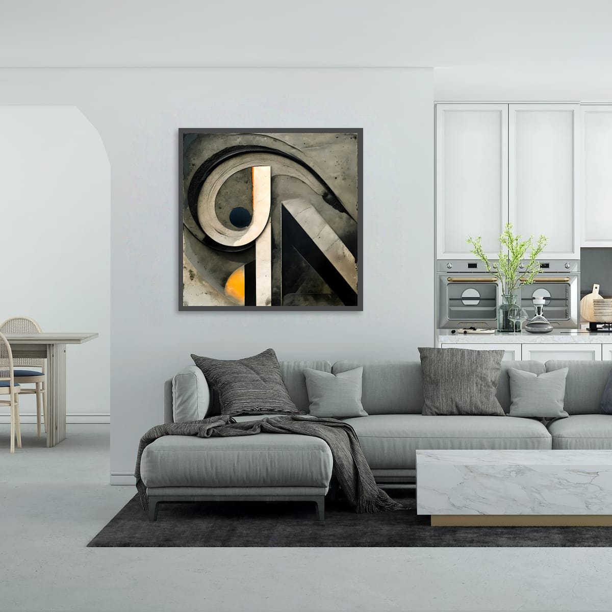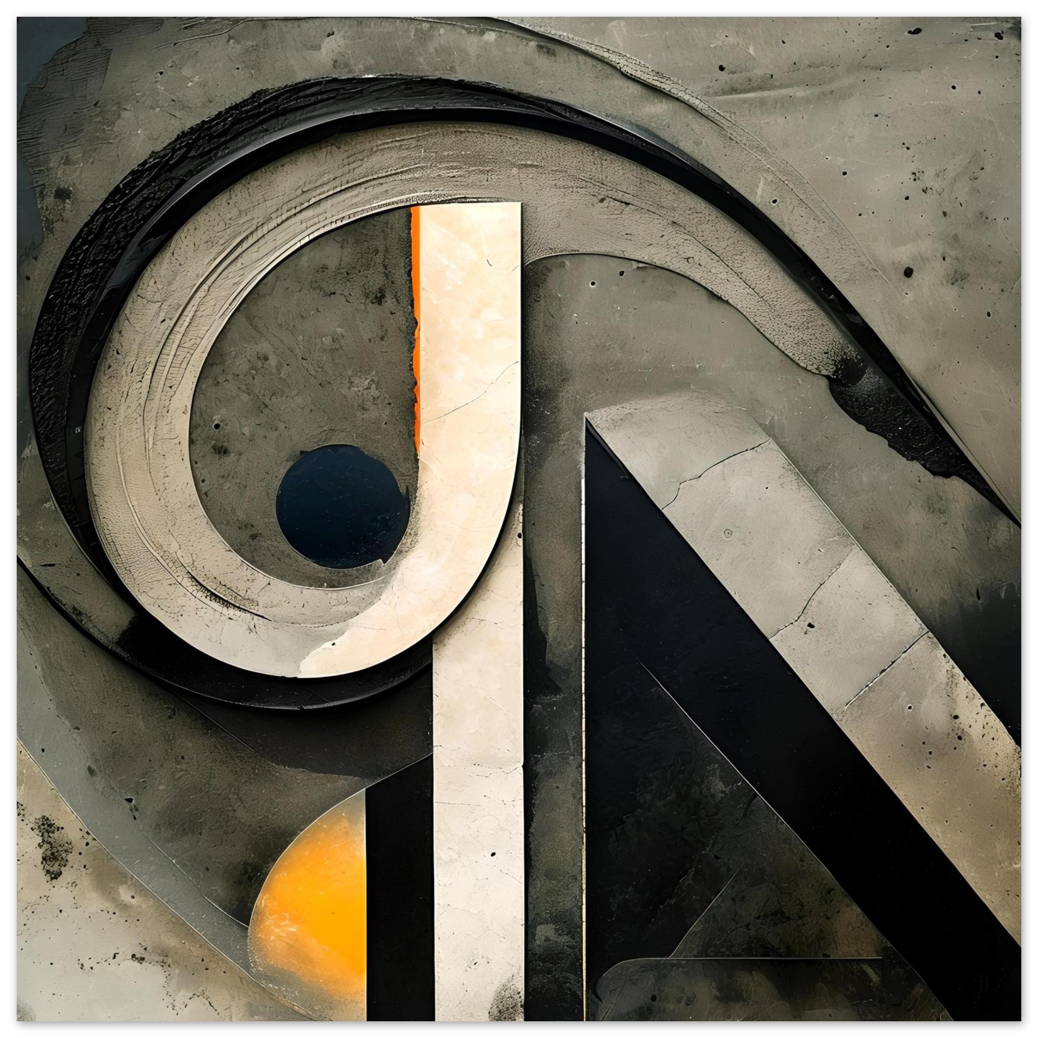This work is built from restrained, architectural forms that feel carved and uncovered rather than assembled. A dominant curved sweep arcs across the surface with weight and deliberation, intersecting a vertical spine that anchors the composition in place. The geometry is firm, but never pristine — edges are weathered, surfaces marked, and transitions carry visible abrasion.
