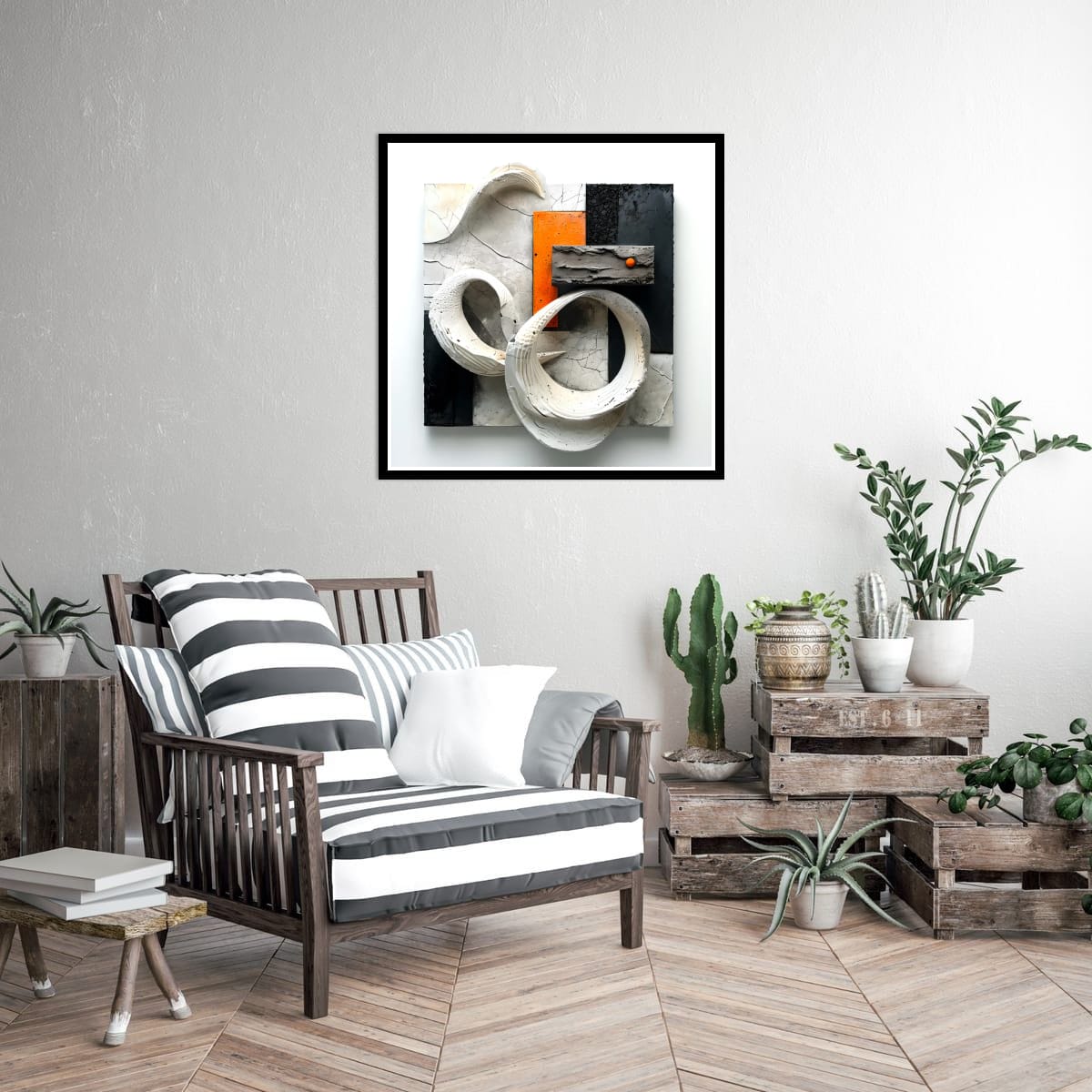 The palette is restrained and architectural, dominated by off-white, charcoal black, soft grey, and concrete tones, punctuated by a vivid orange accent that draws the eye to the centre-right of the work.