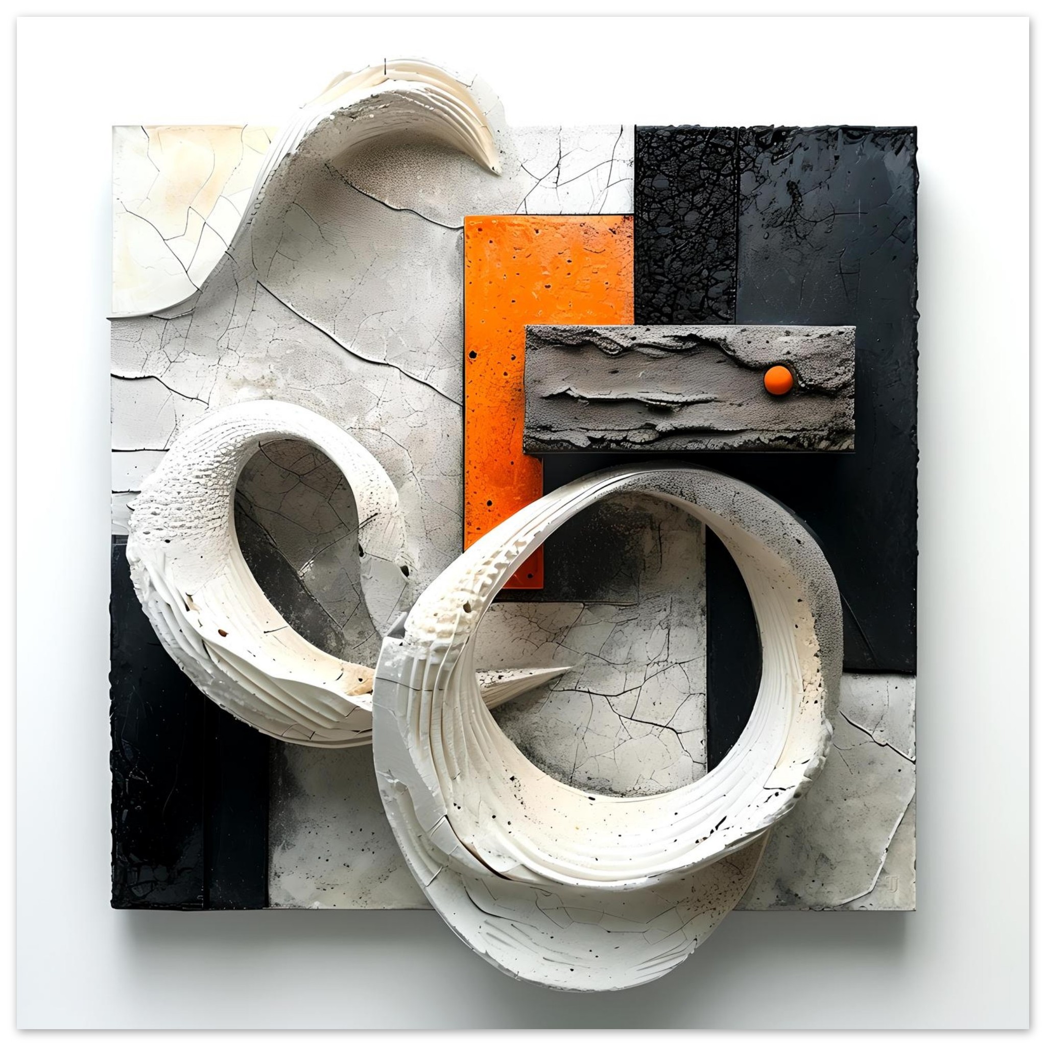 This abstract composition presents a sculptural arrangement of geometric forms layered within a square format. Curved white ring-like structures intersect with rigid rectangular panels, creating a dialogue between fluid motion and structural restraint. The composition is anchored by contrasting surfaces, including cracked textures, matte fields, and raised relief elements that introduce depth and physical presence.