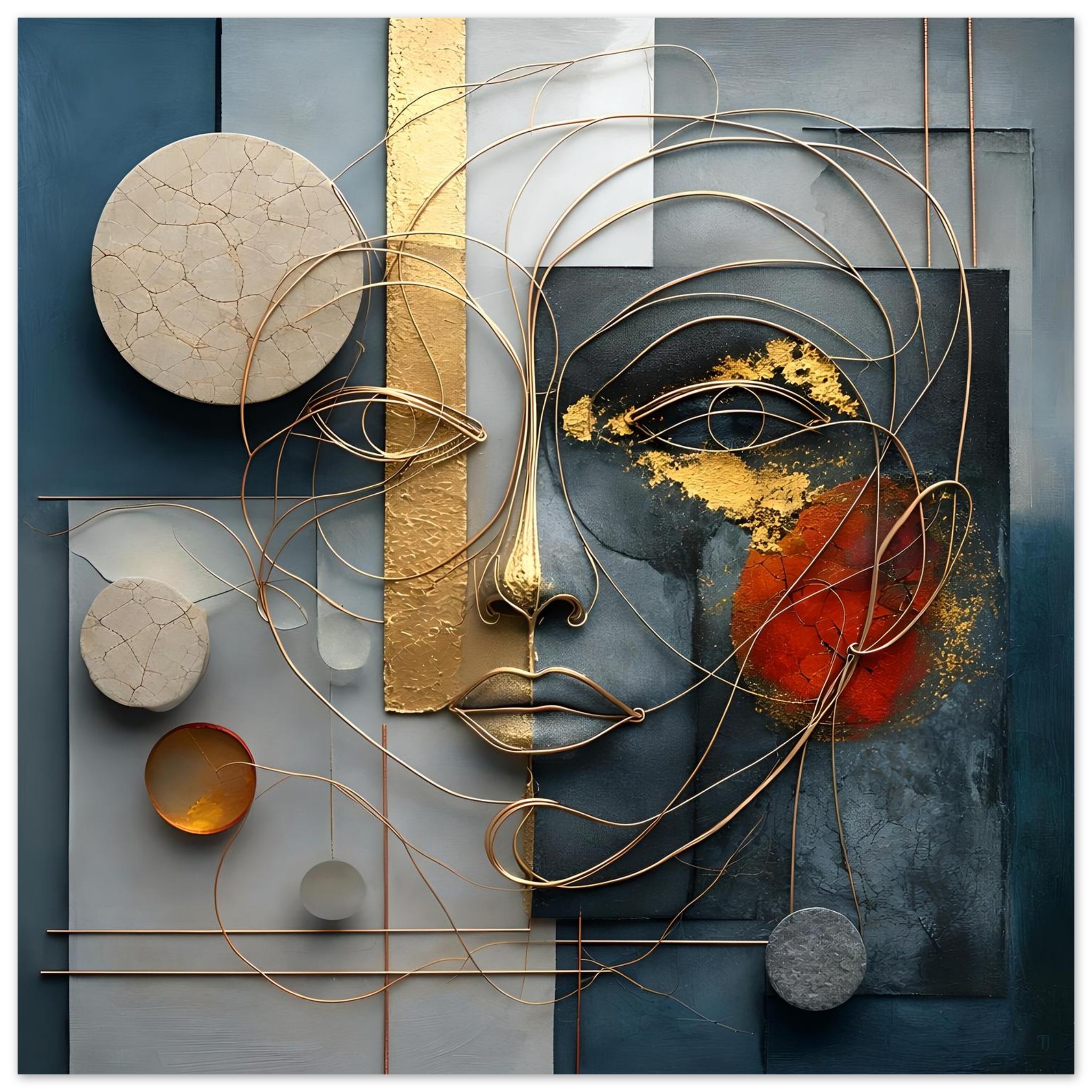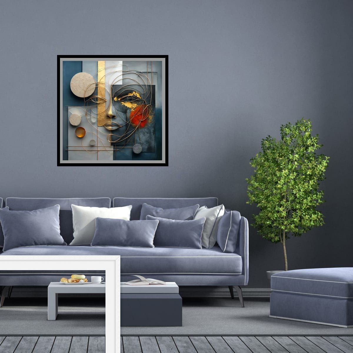 Muted greys, slate blues, and chalked neutrals form a restrained ground, interrupted by restrained but deliberate accents of gold and rusted orange. These moments do not soften the composition; instead, they act as stress points—markers of imbalance within an otherwise ordered framework.