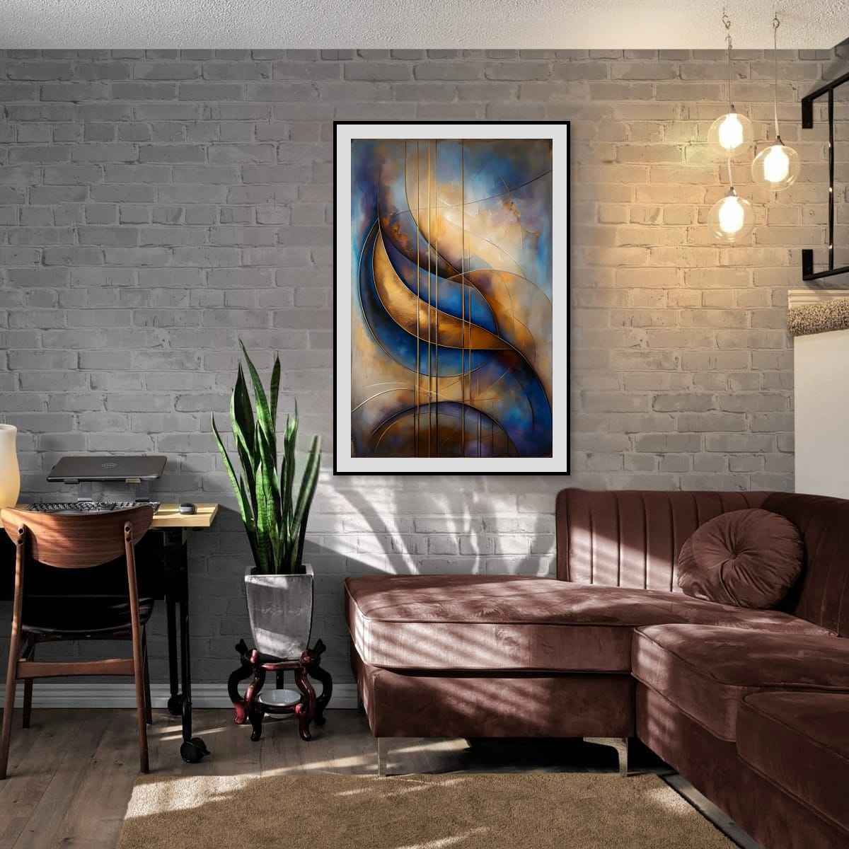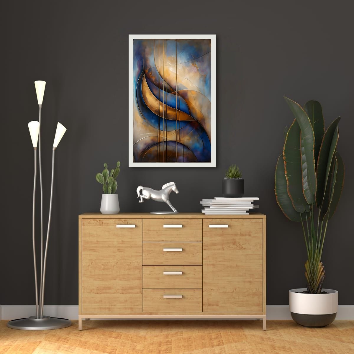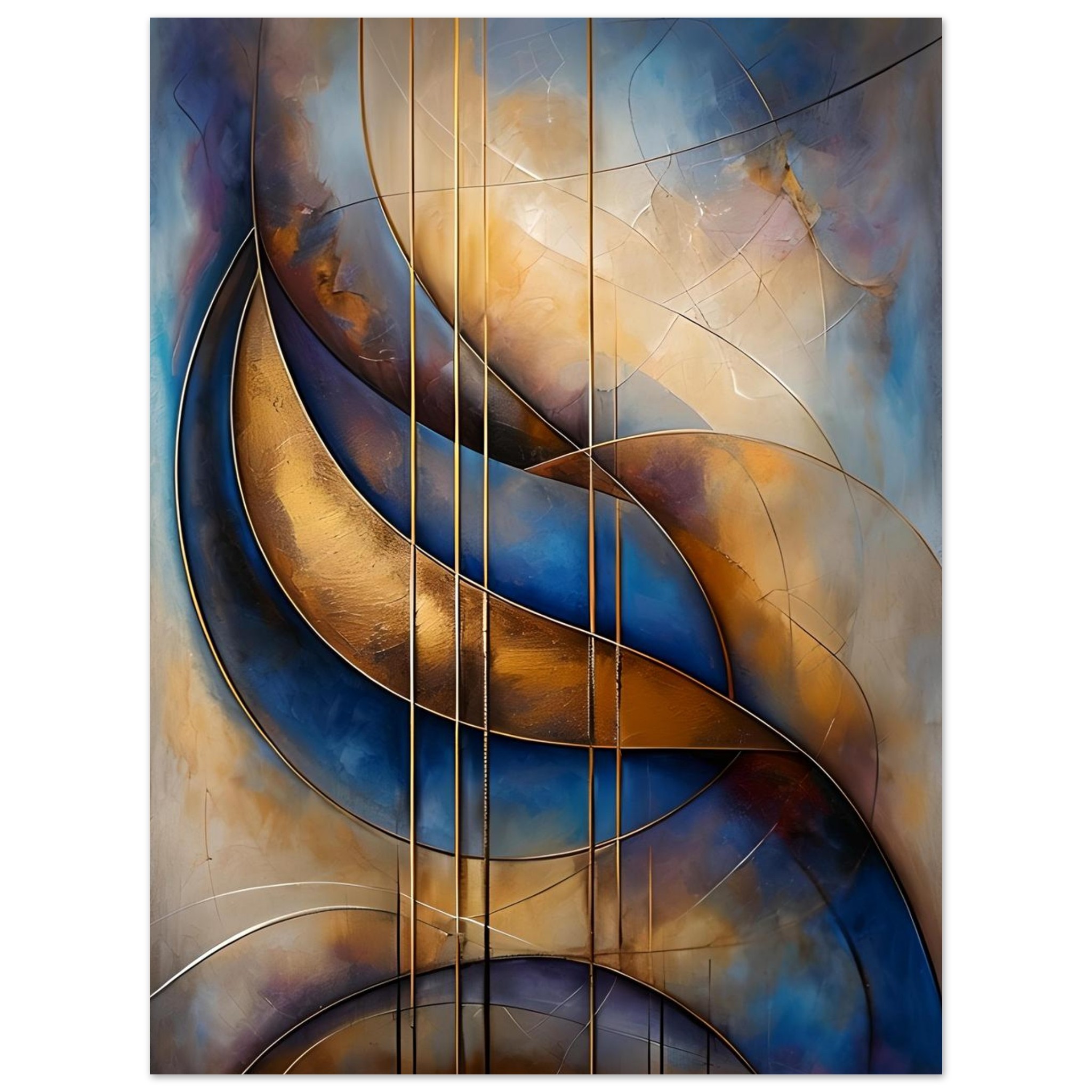 Sweeping blue and gold structures dominate the composition, their edges clean yet not polished, bearing subtle abrasion and evidence of reworking. These forms feel bound together rather than freely moving, as though motion has been channelled through a predefined path. Gold operates as a structural binder, stitching the movement together and preventing fracture or collapse.
