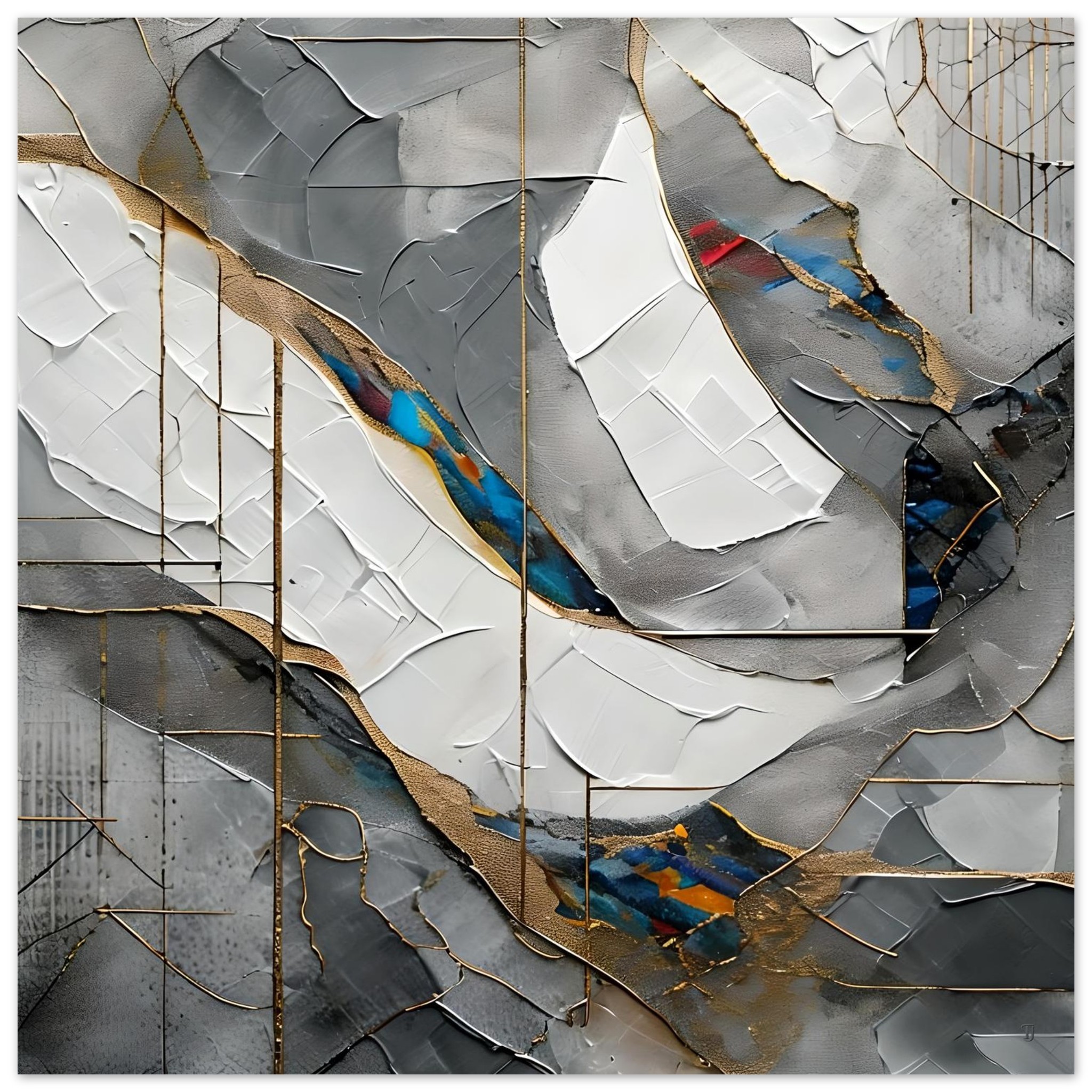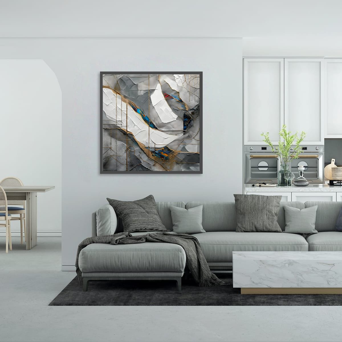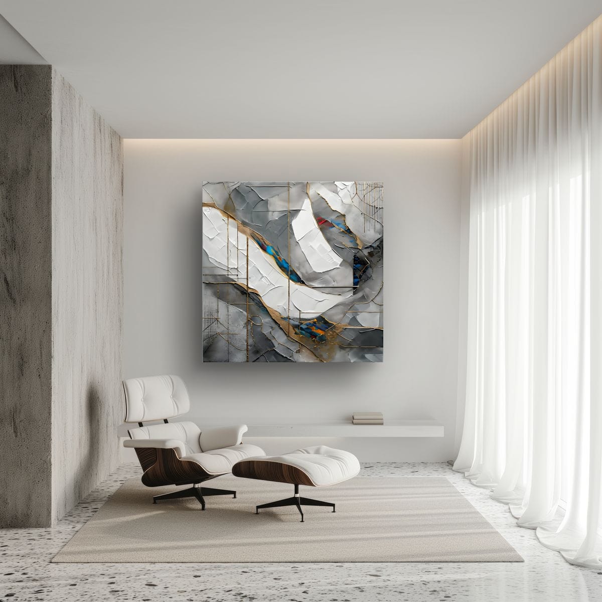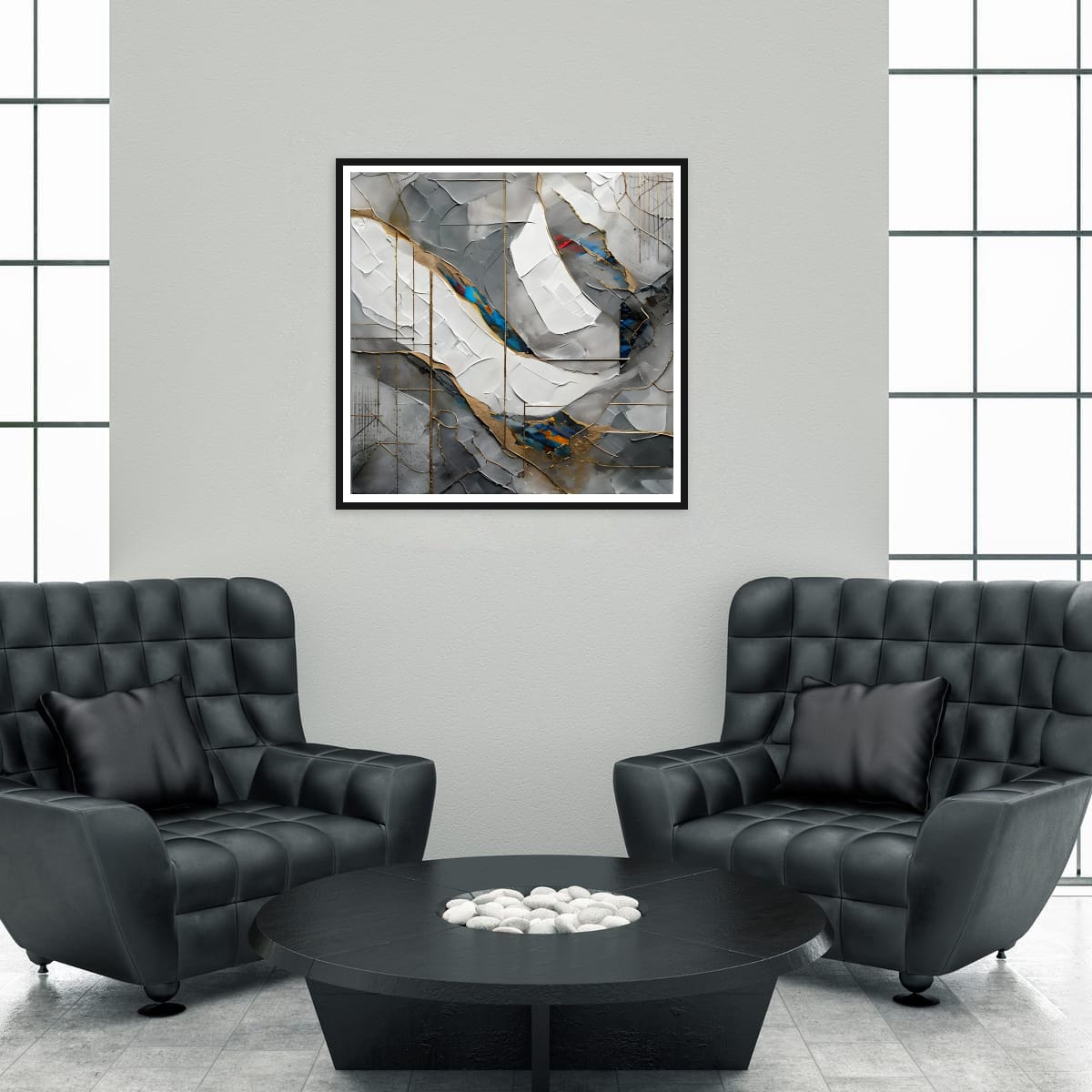 Muted blue accents appear sparingly, introducing quiet movement without breaking the overall composure. These interruptions prevent sterility while preserving balance, ensuring the work remains engaging without becoming visually demanding.
