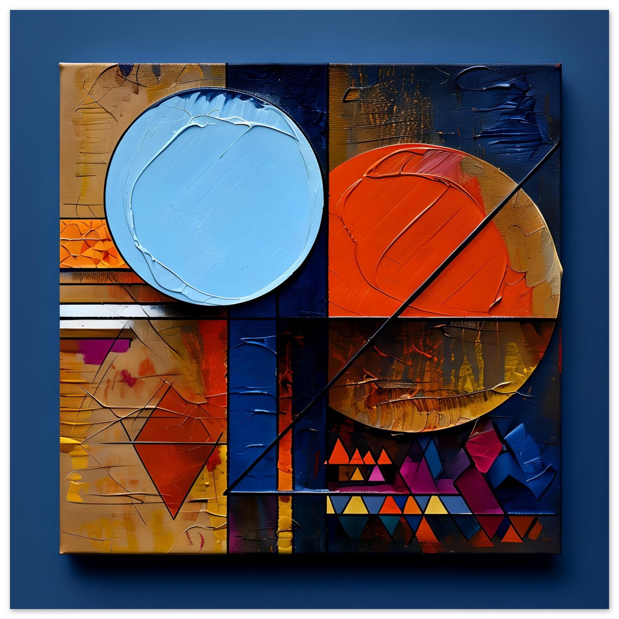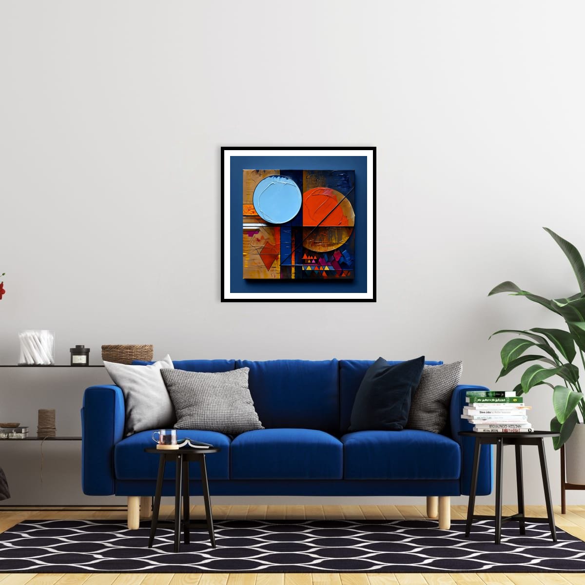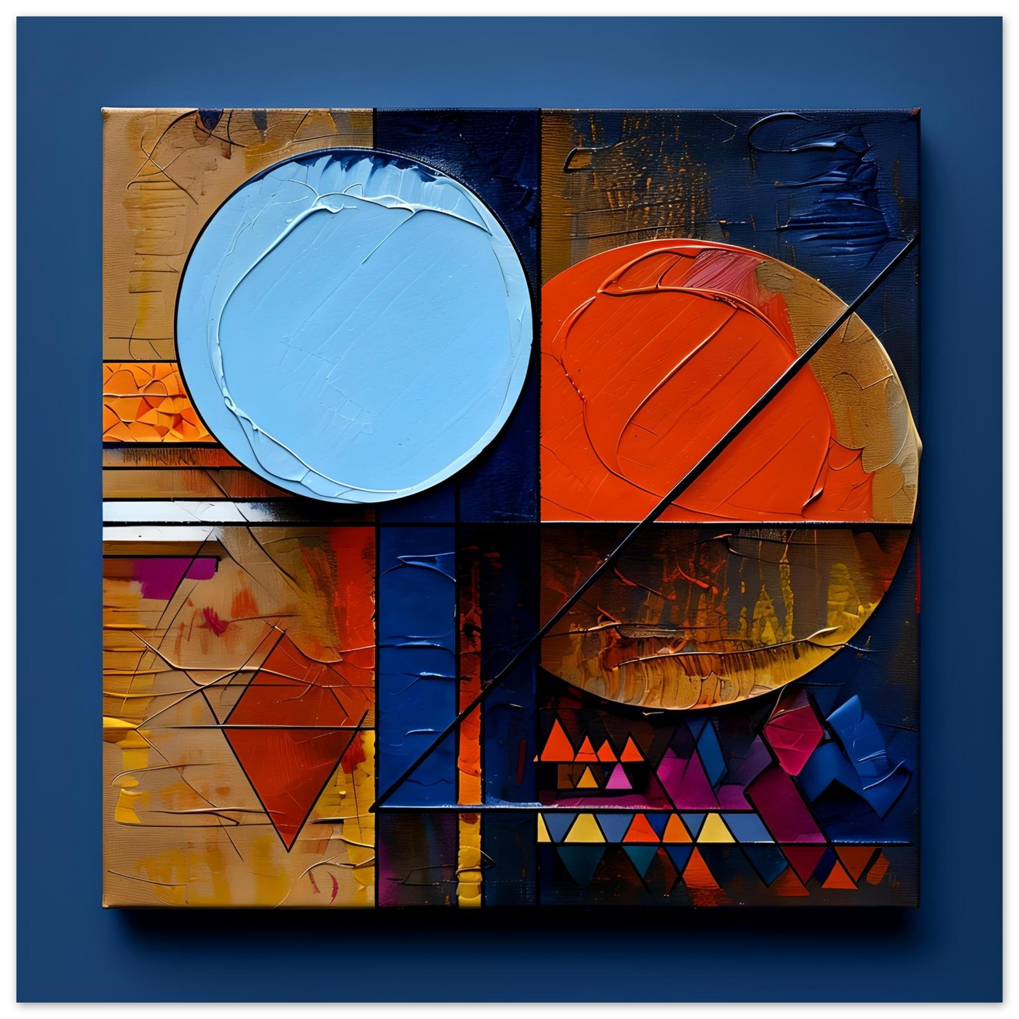 The colour palette combines cool blues with warm oranges, ochres, and muted gold tones. These contrasts are carefully distributed to maintain balance rather than dominance.