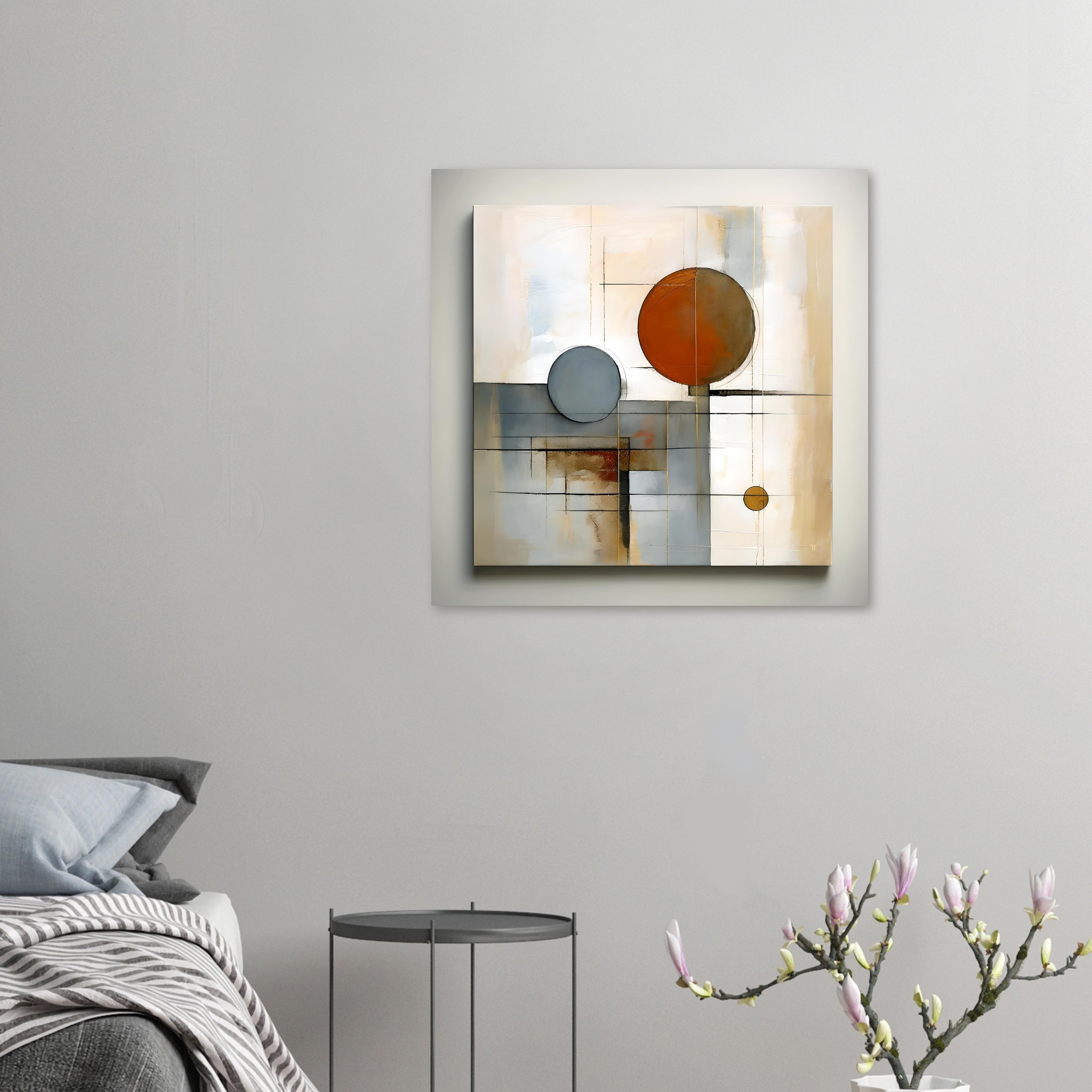 Circular forms anchor the structure with deliberate weight. The larger ochre disc is positioned with authority, its surface dulled and scuffed rather than polished, while the smaller grey circle counters it quietly, stabilising the field without symmetry. Thin horizontal and vertical lines cut through the space like measured interventions, some broken, some fading, none asserting dominance. They suggest alignment systems that have been adjusted, interrupted, and left exposed.
