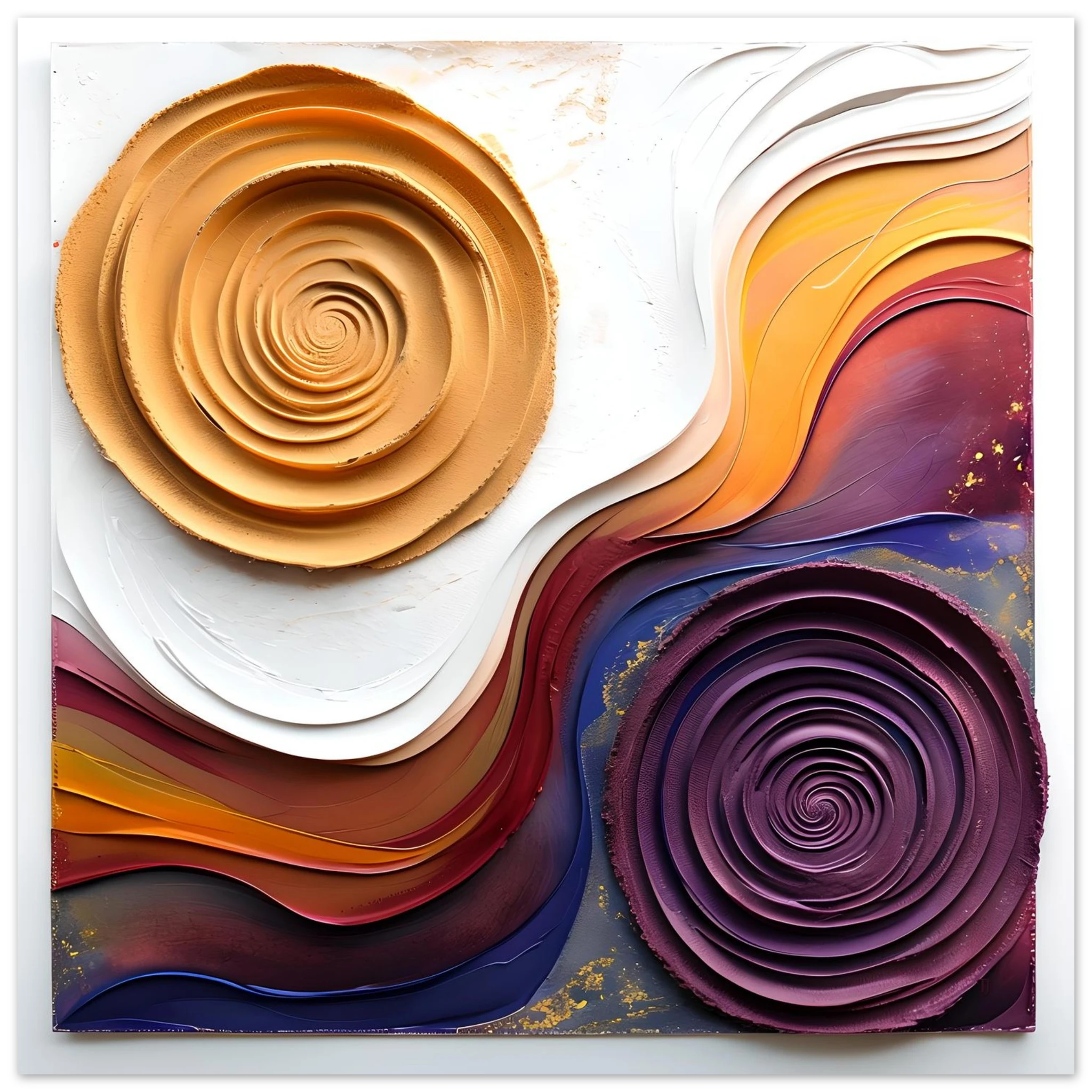 This work is defined by thick, spiralling forms pressed into the surface with visible resistance. Layered ridges coil inward and outward, leaving pronounced edges, compressed bands, and uneven transitions that record force rather than fluidity. The surface reads as carved and worked, with each turn carrying weight and friction.