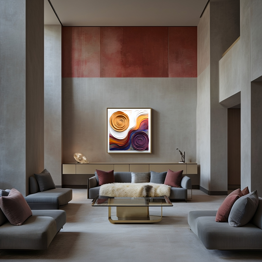 Sweeping bands of colour intersect and collide, creating areas where movement is redirected rather than released. The spirals do not flow freely; they tighten, thicken, and push back against themselves. Subtle abrasions, scuffed passages, and irregular edges prevent the composition from resolving into ornament, keeping the energy contained and grounded.
