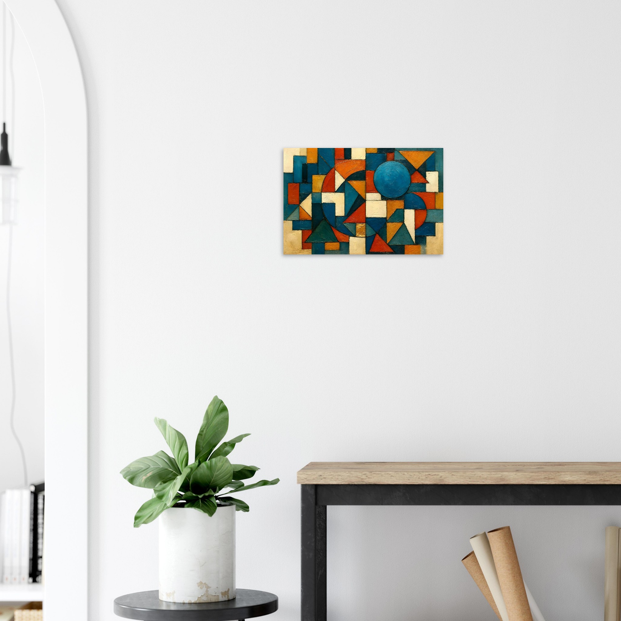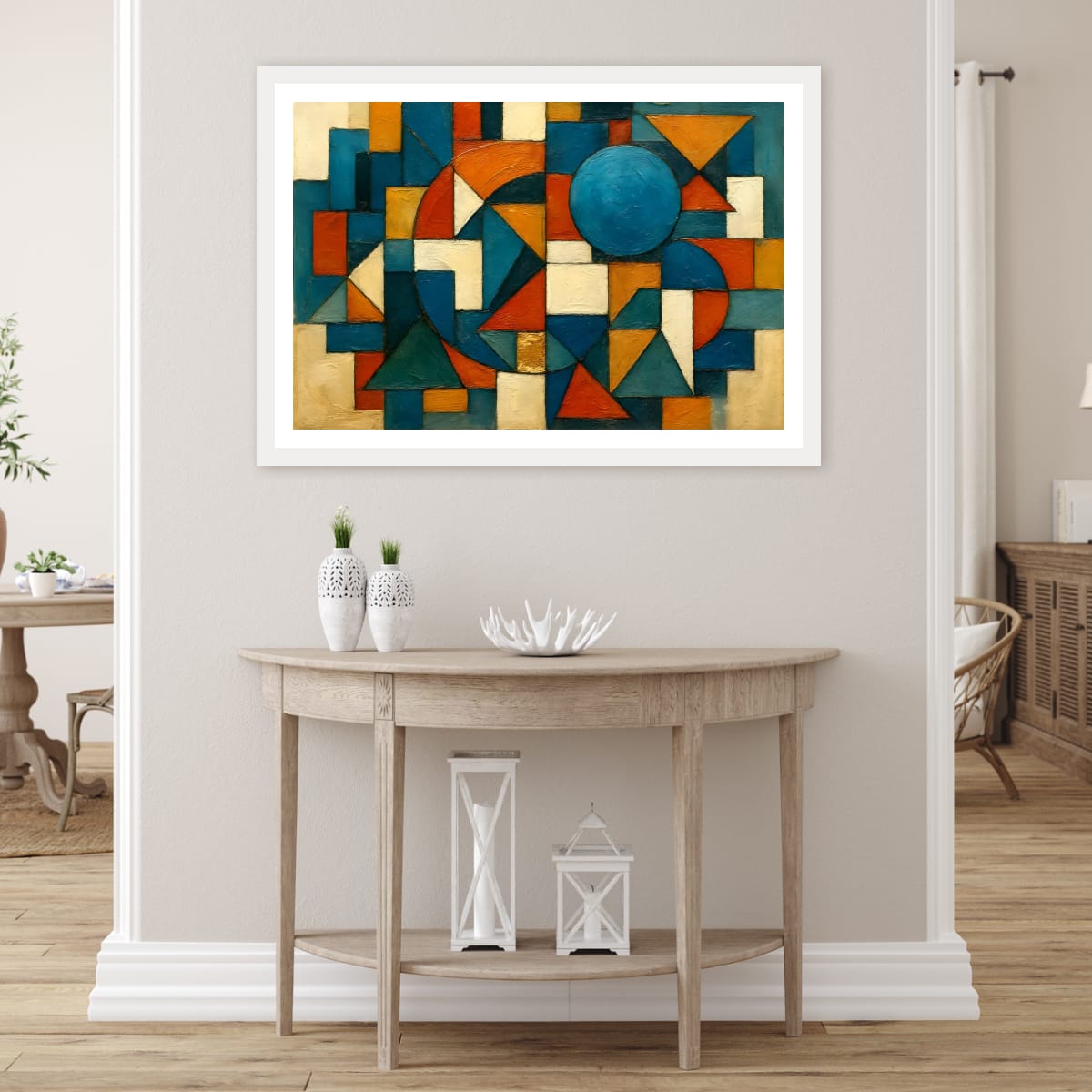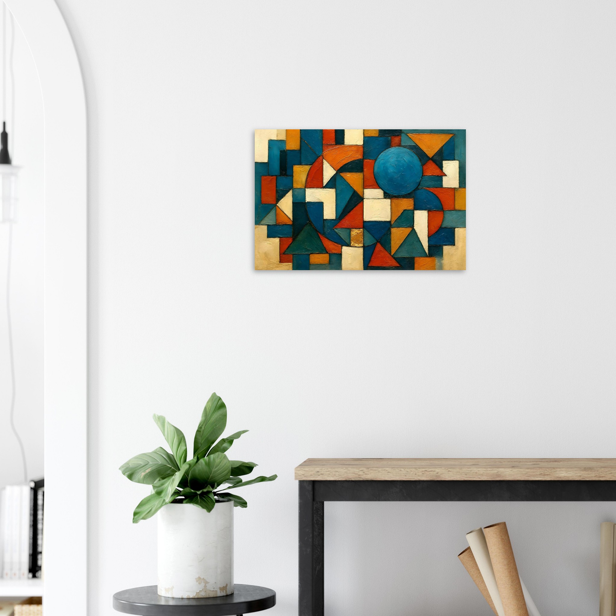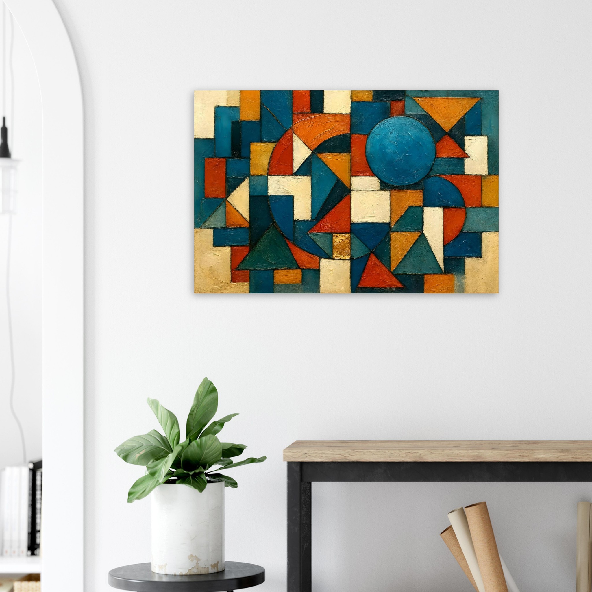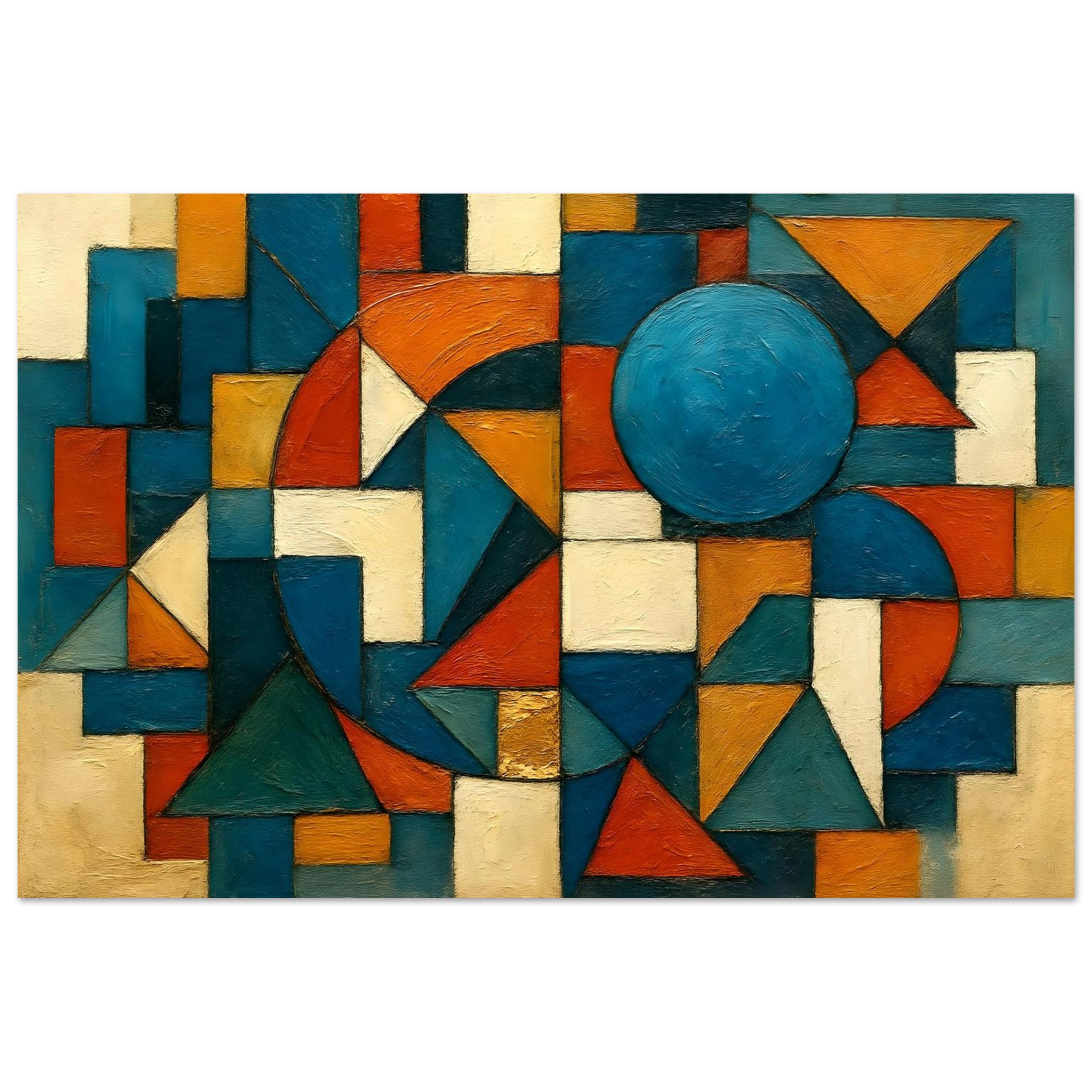 Geometric Sonata is a bold, structured composition built from interlocking triangular, circular, and rectangular forms. Clean lines, layered textures, and a modern palette of deep teal, warm ochre, ivory, burnt orange, and slate blue give the piece a balanced energy that suits both contemporary and classic interiors.