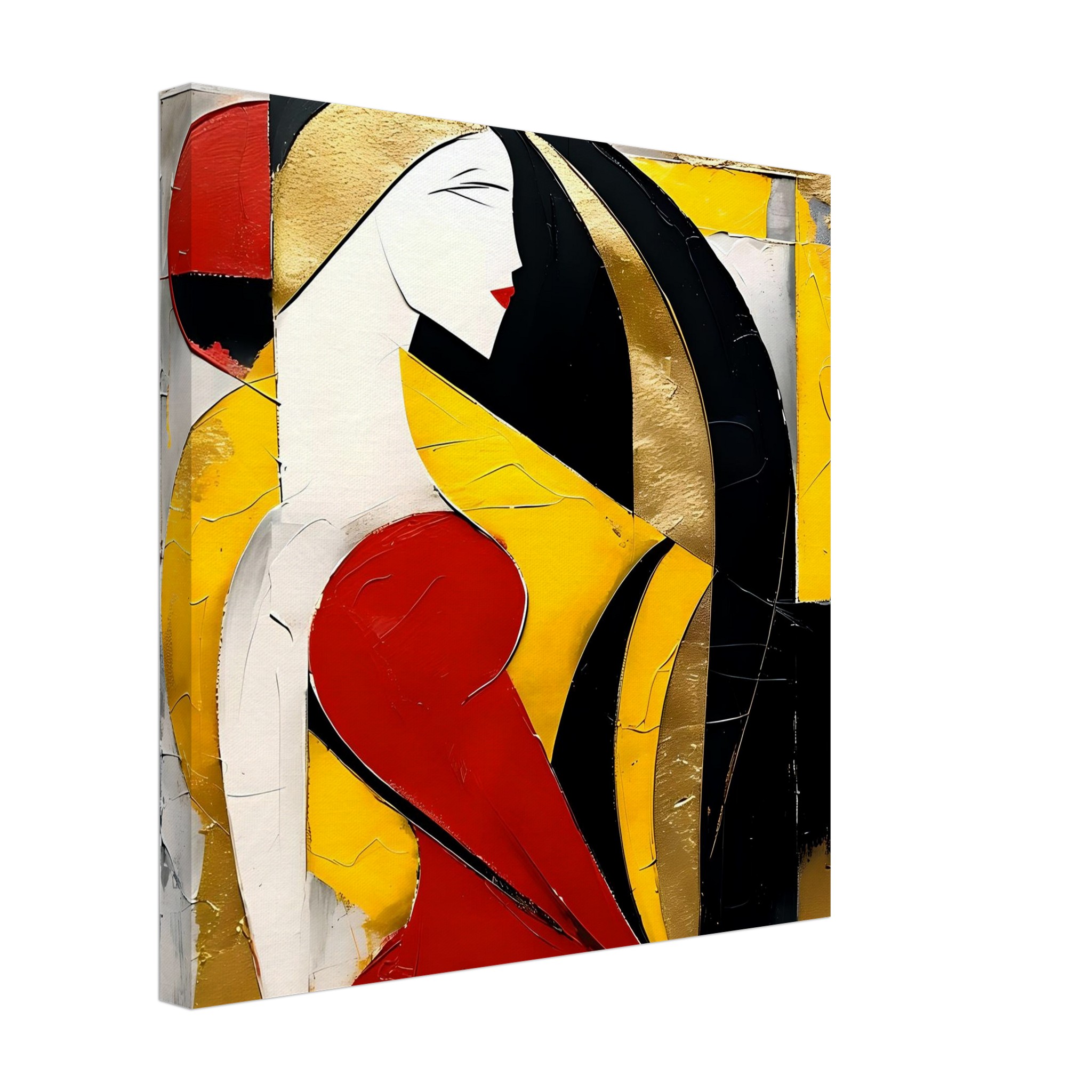A stylised figure is formed from sharply defined planes and layered colour blocks, its surface built through scraping, fracture, and visible correction. Pale, chalked flesh tones are set against dense black arcs and saturated fields of yellow and red, creating a composition that feels both compressed and deliberate.