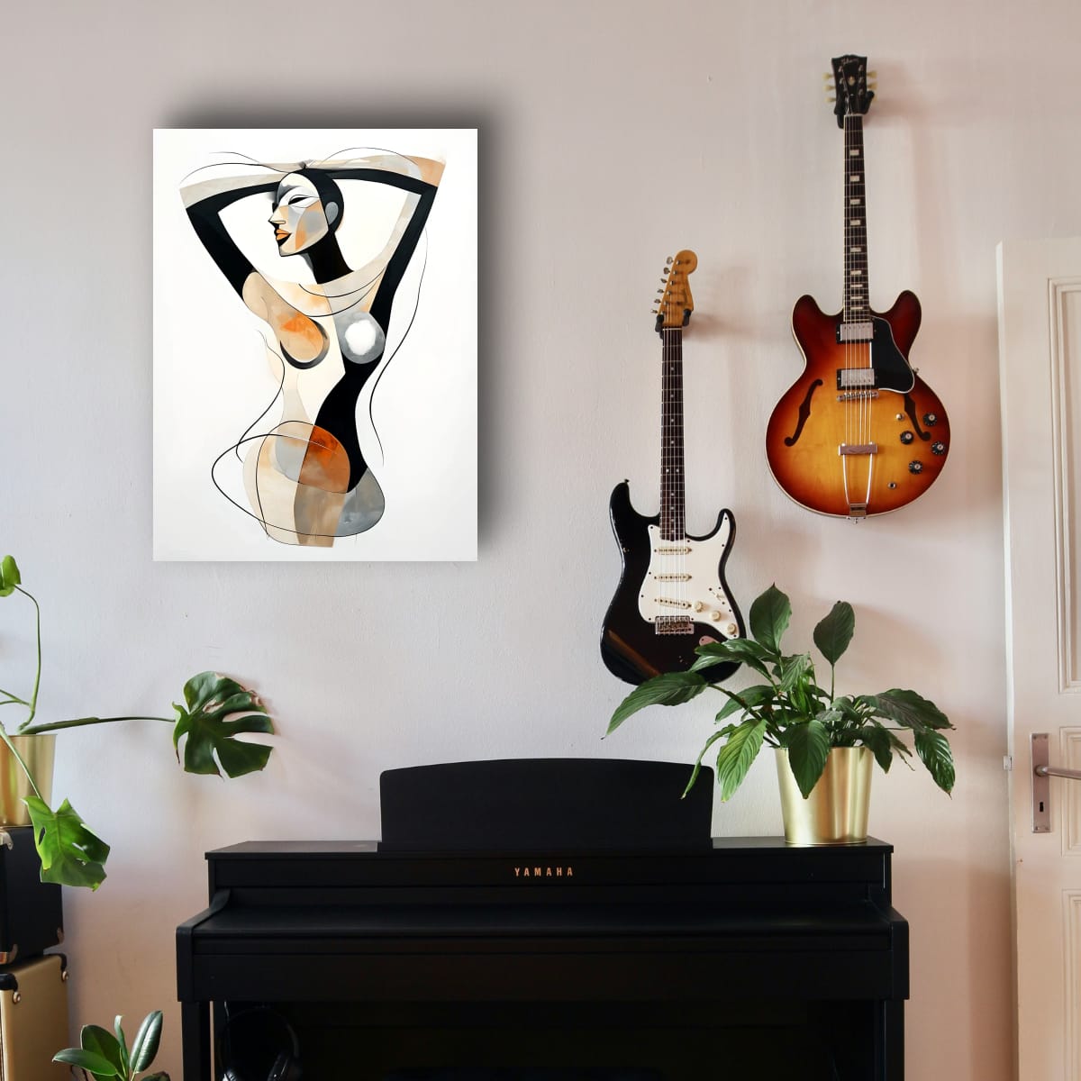 Colour is applied sparingly and deliberately. Warm accents appear in the torso and lower form, offset by cool greys and neutral creams. The black structural shapes provide clarity and rhythm, guiding the eye vertically through the composition without overwhelming the figure’s softness.