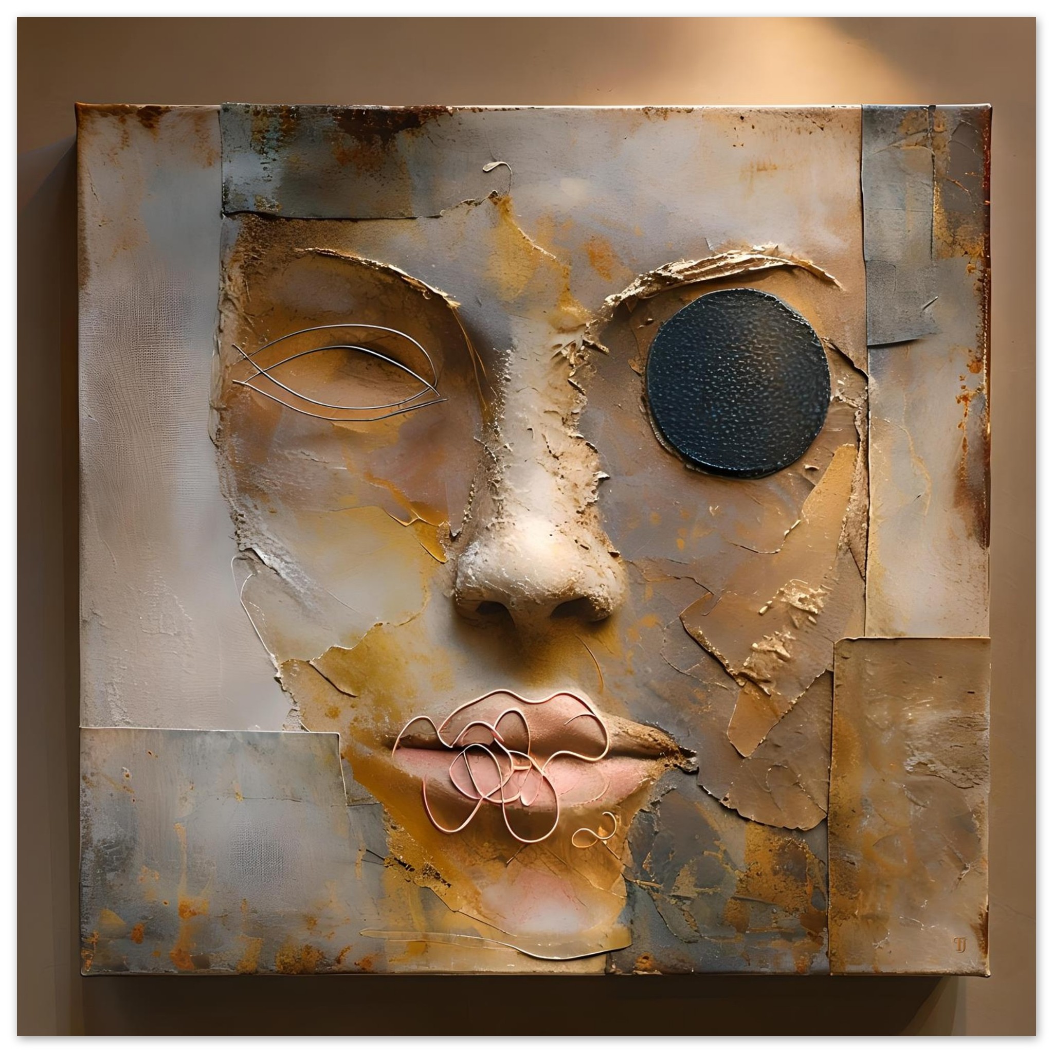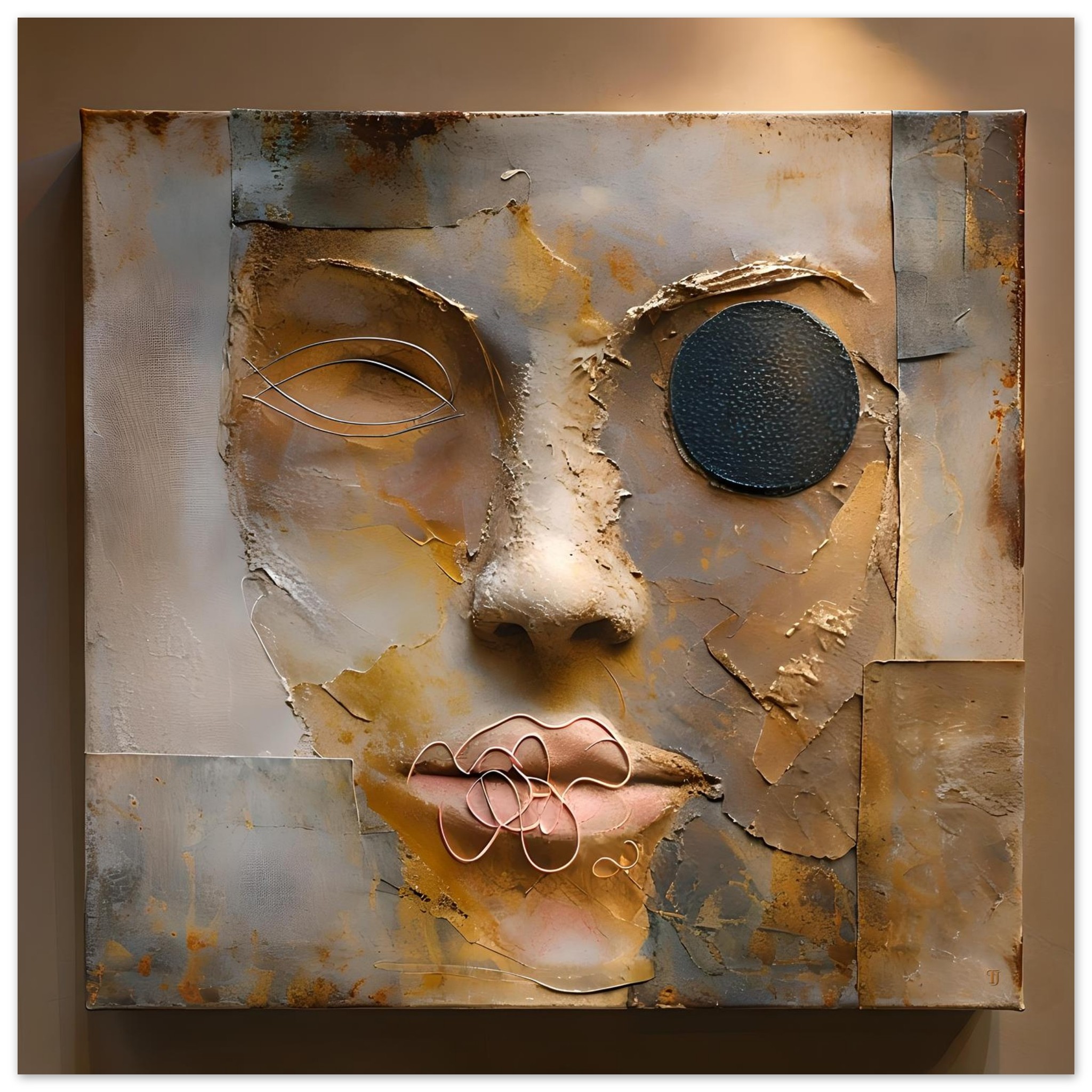 This work presents a face assembled from worn surfaces, fractured planes, and patched fragments that refuse to fully resolve. Layers appear scraped back and re-applied, with visible seams, abrasions, and uneven joins left deliberately exposed. The surface carries the evidence of revision — areas that look repaired rather than refined, as though stability has been negotiated rather than achieved.