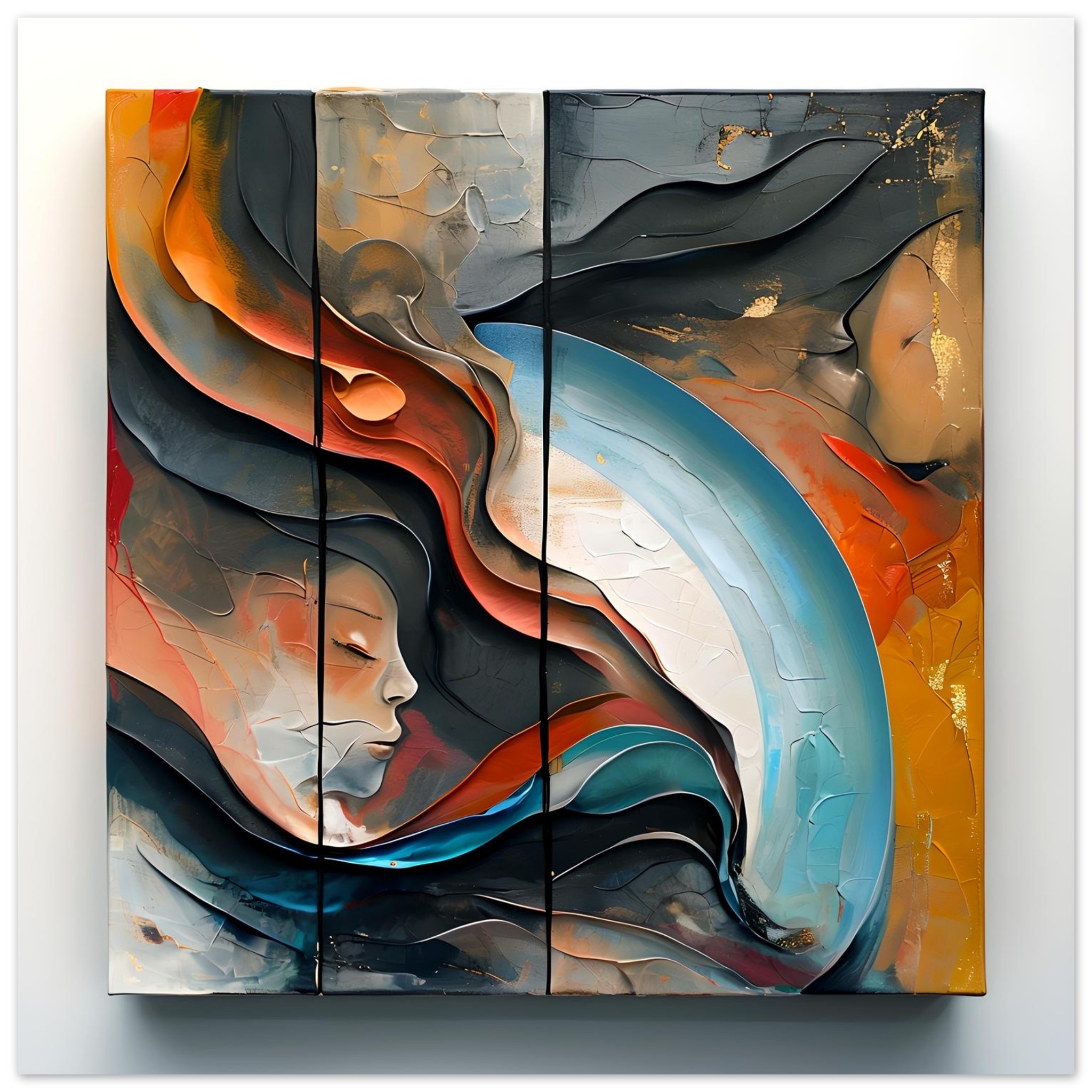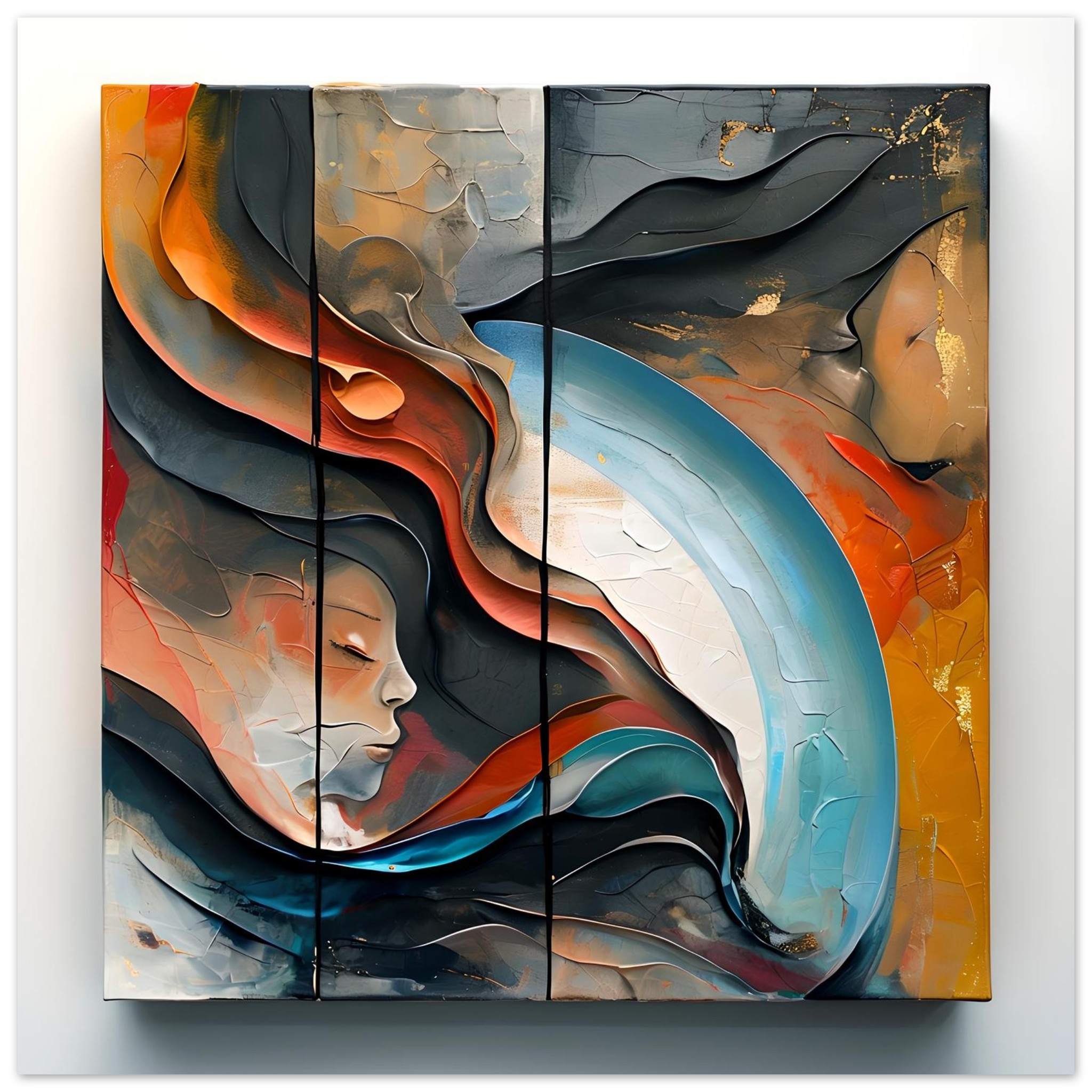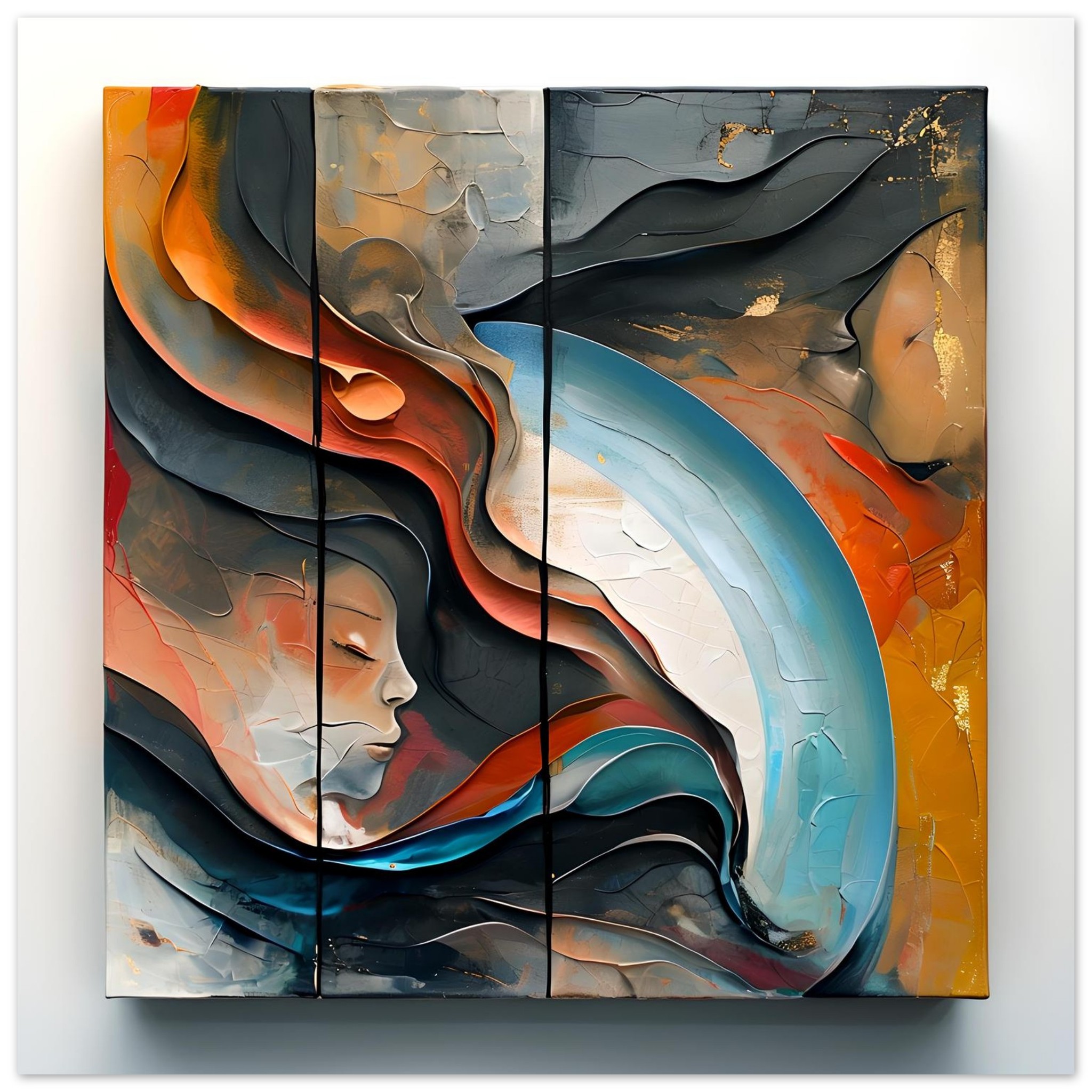 Held in the Current brings figurative presence into a layered abstract field without breaking structural discipline. Flowing bands of colour and texture move laterally across the surface, carrying a softly rendered face that appears embedded within the motion rather than placed upon it.