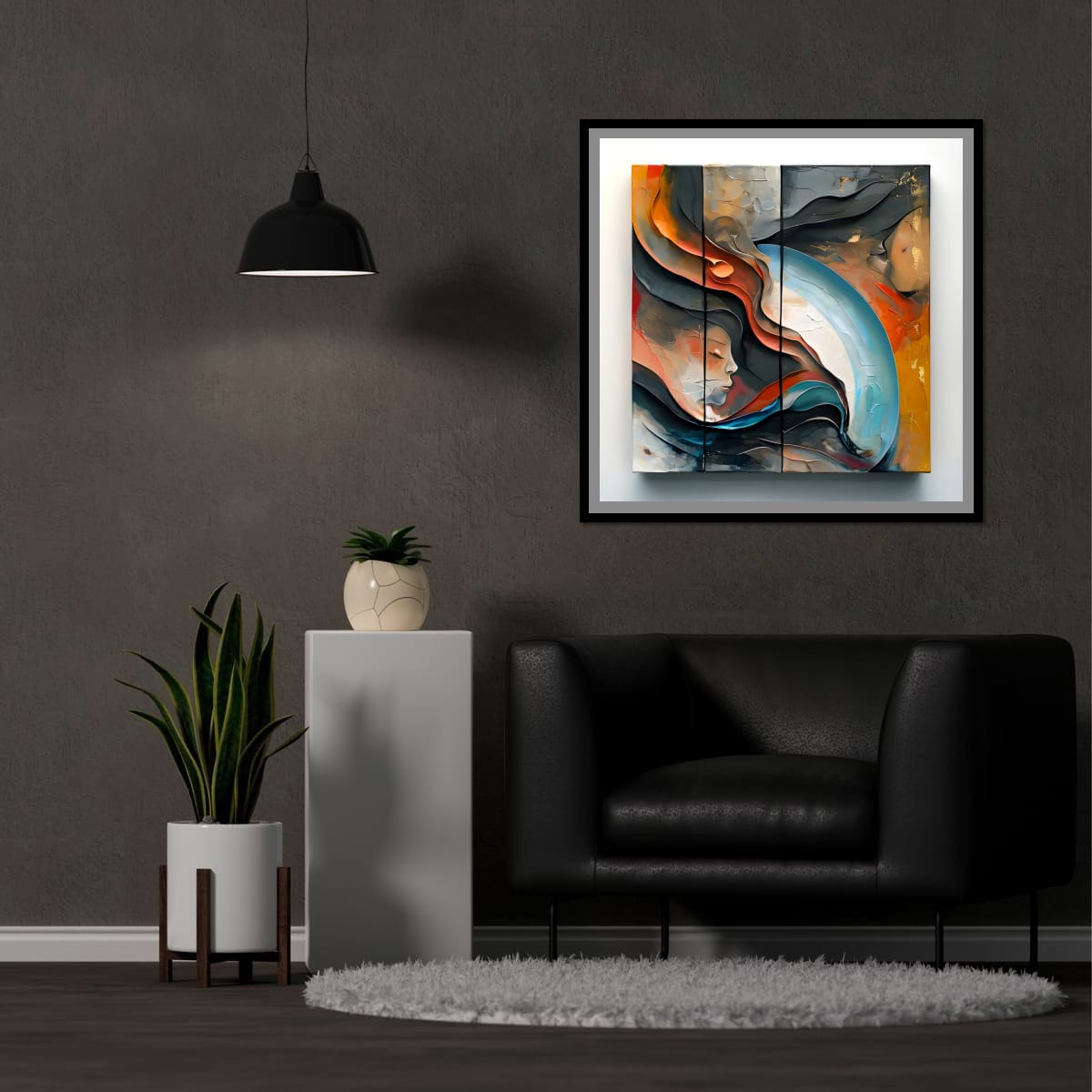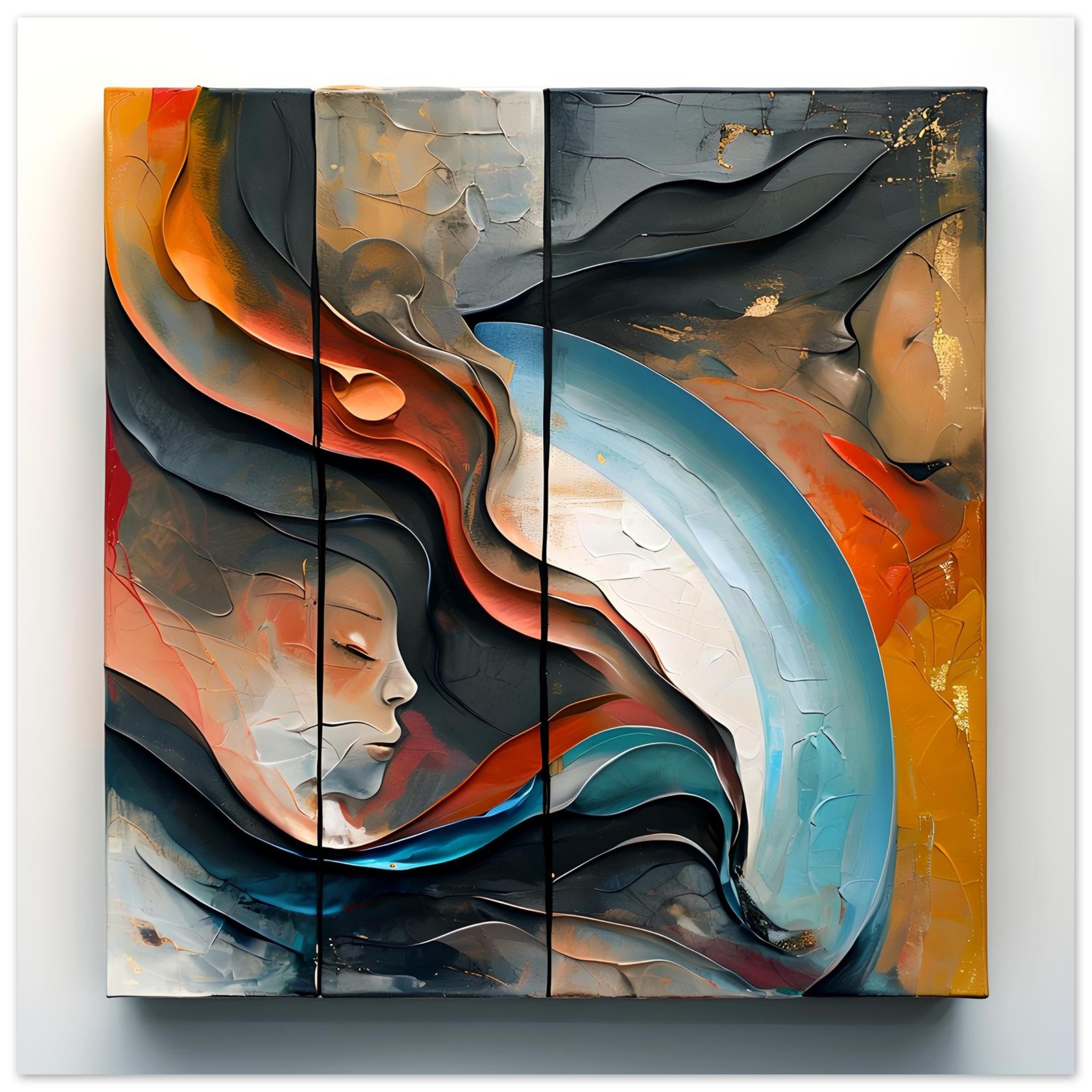 Warm ochres and reds are counterbalanced by cool blues and deep charcoal tones, creating a visual rhythm that feels continuous and contained. Panel divisions introduce a measured interruption, reinforcing control and preventing the composition from becoming purely expressive.