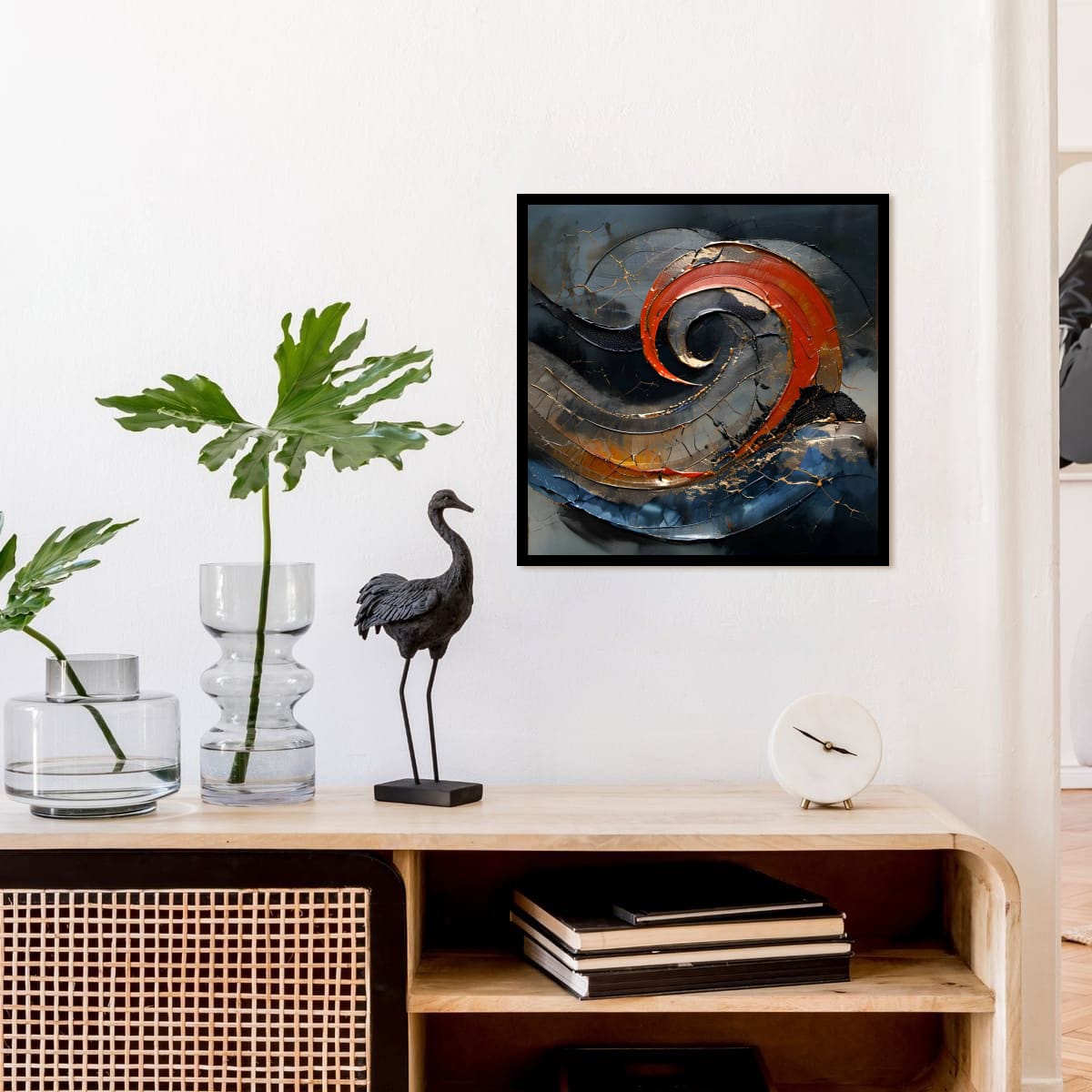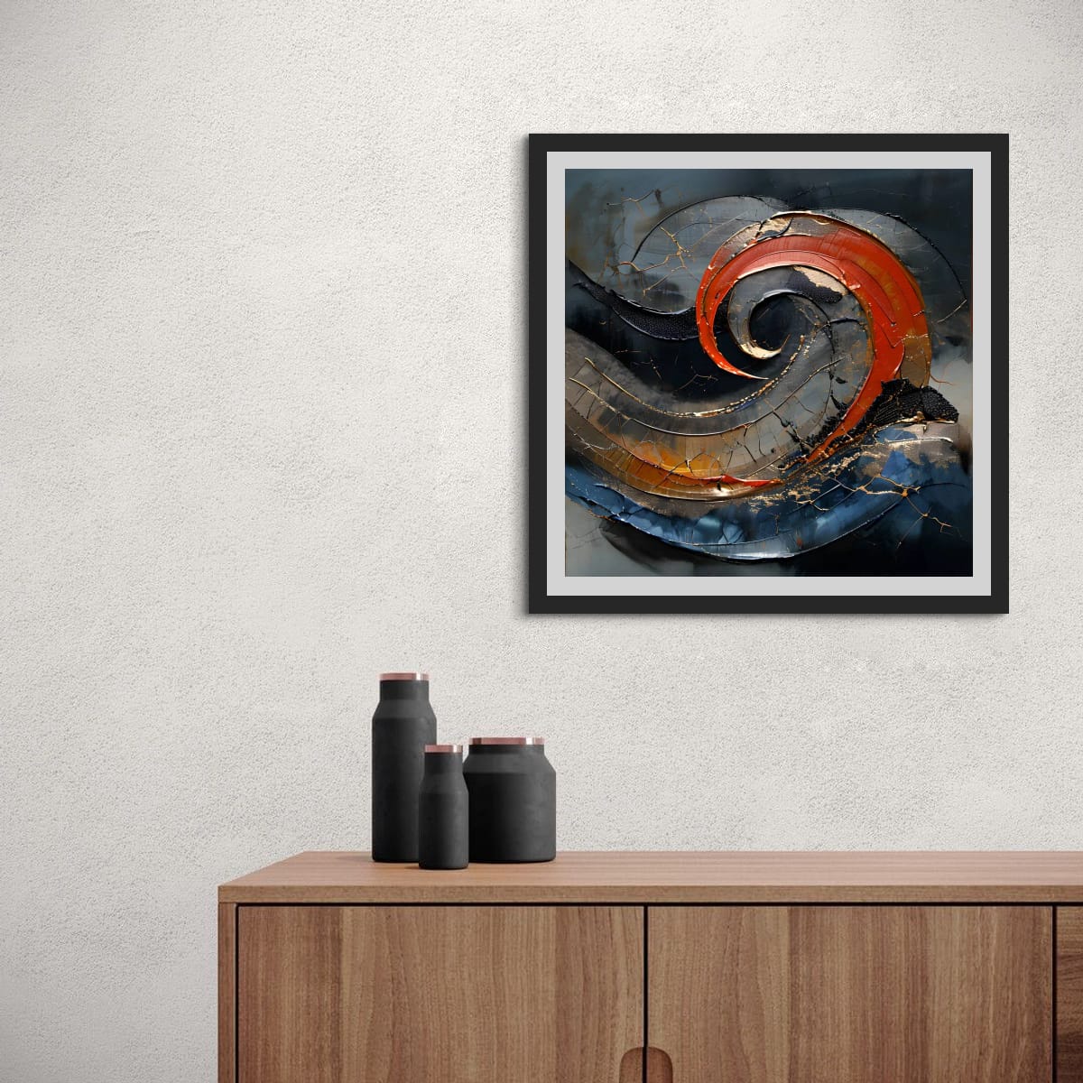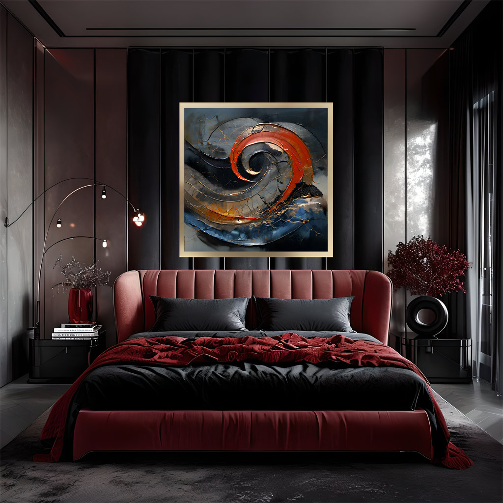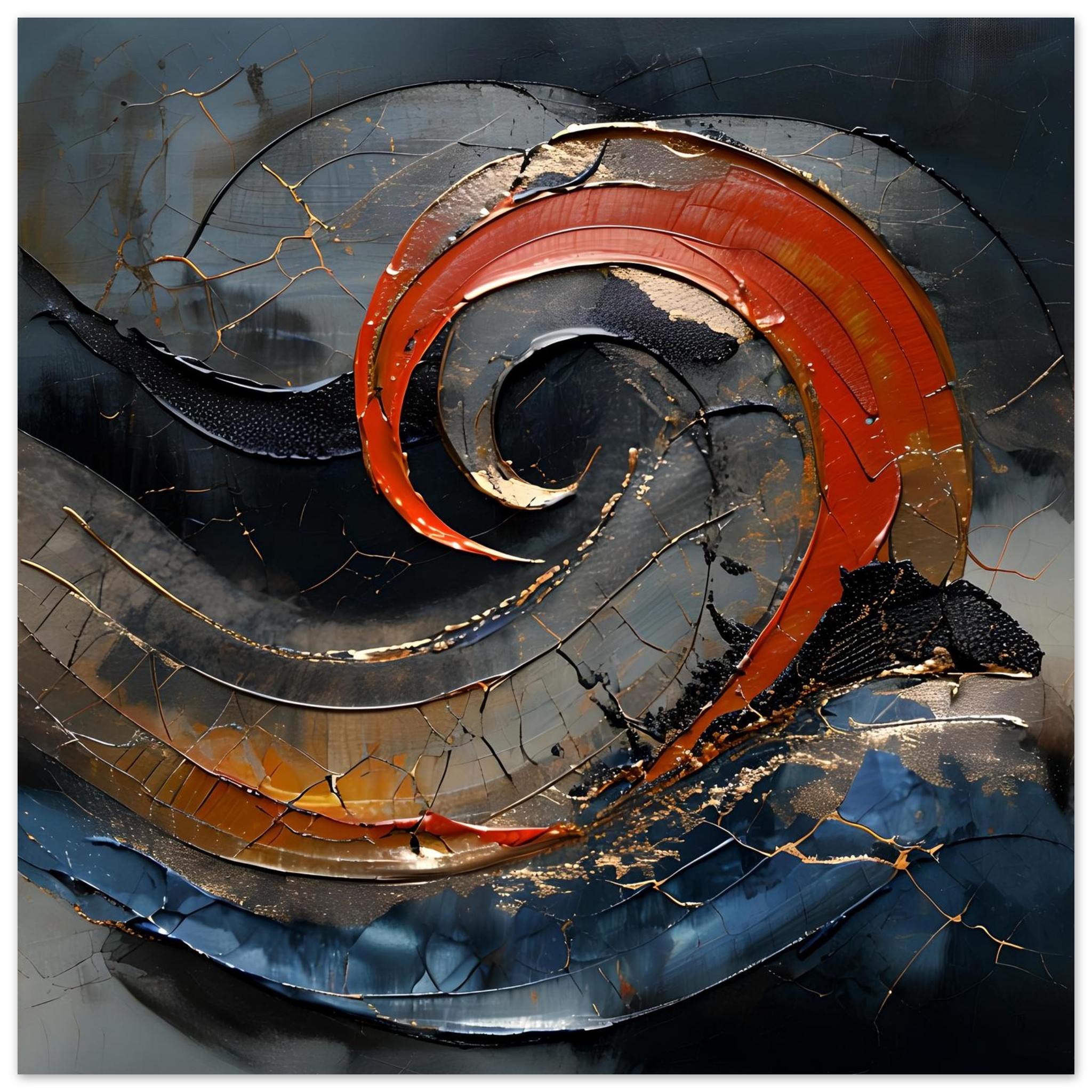 A dominant red arc curves through the centre, thick and deliberate, as though bent into place. Its form is not soft; it reads as engineered and held under tension. Beneath and around it, blackened textures and exposed strata create a sense of weight and resistance. The spiral movement pulls inward, yet the structure resists collapse, creating a controlled friction between motion and containment.