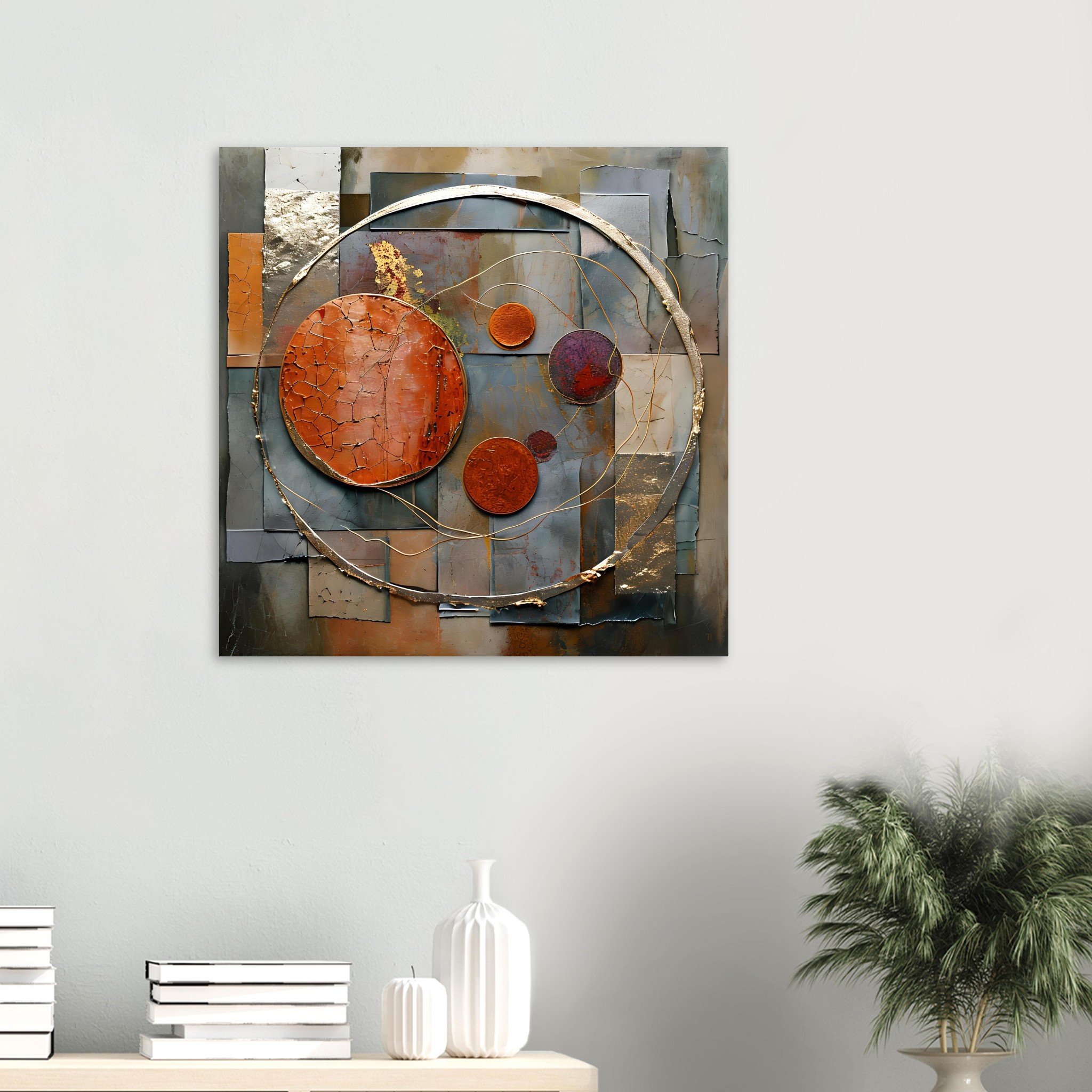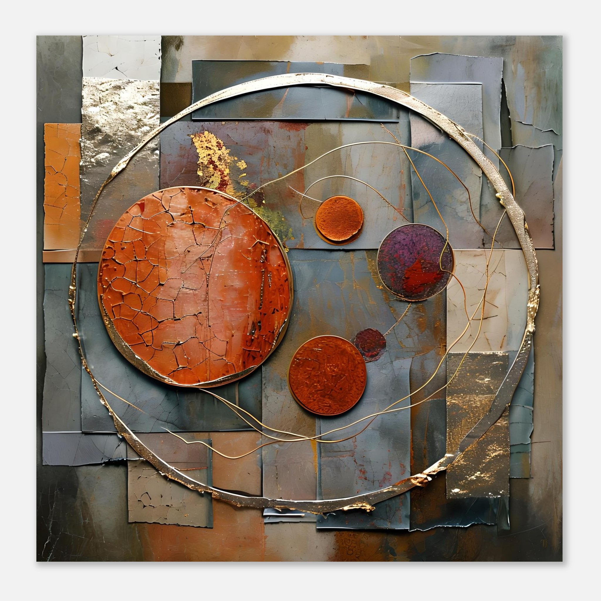 Within this boundary, circular forms accumulate with differing weights and conditions. The largest disc is fractured and weathered, its surface split and stressed, bearing the marks of pressure and time. Smaller circles orbit without symmetry, their placement measured but unsettled, contributing scale and pacing rather than hierarchy. None of the forms resolve into a fixed system.