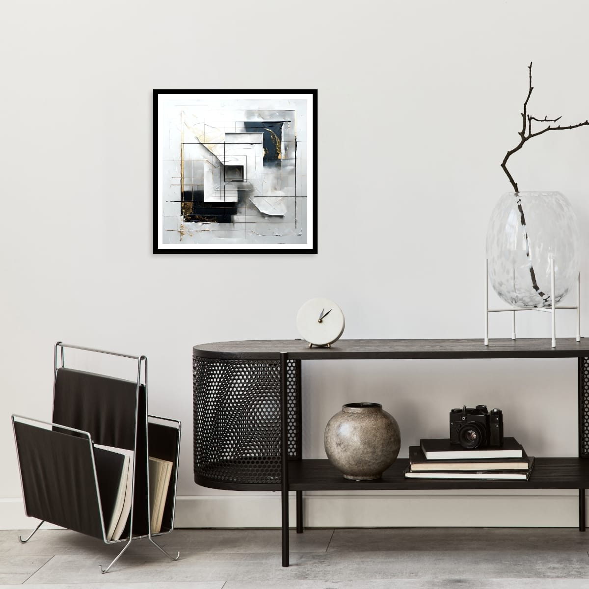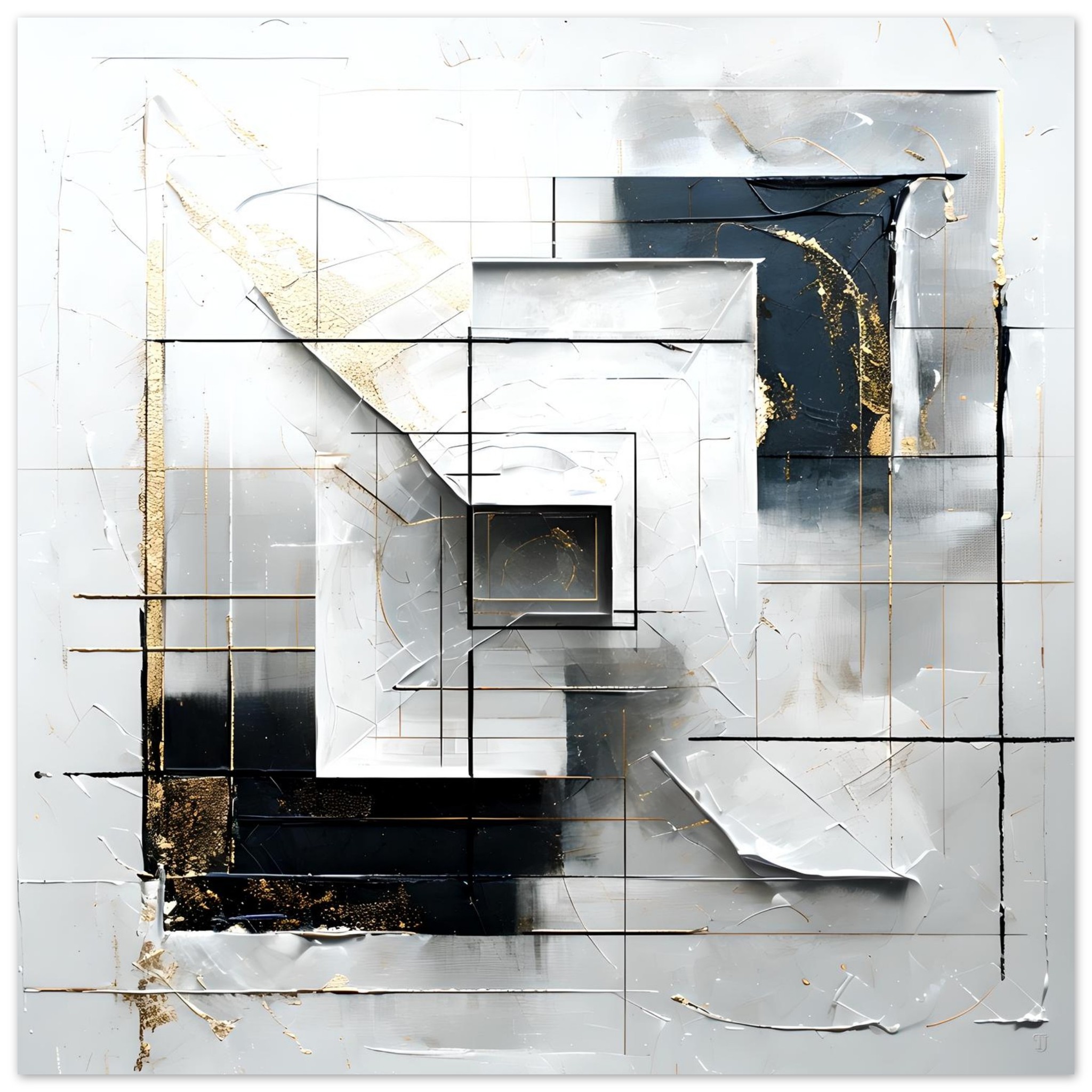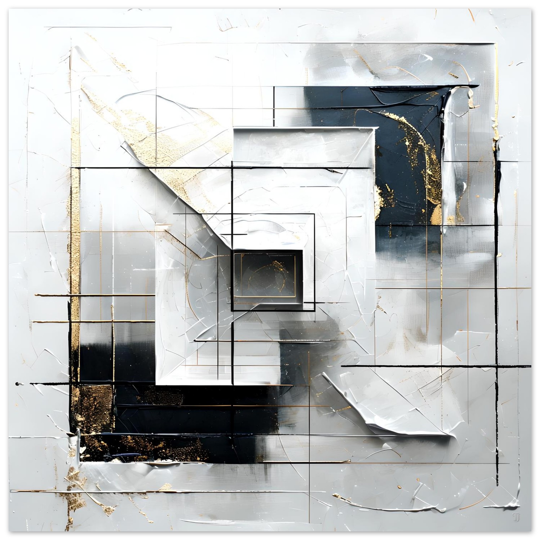 Inner Framework explores the tension between order and disruption through a layered geometric composition. Structured linear grids form an underlying architecture, while fractured planes, softened edges, and subtle distortions interrupt any sense of rigid control. The composition invites the viewer inward, revealing a framework that feels both constructed and unsettled.