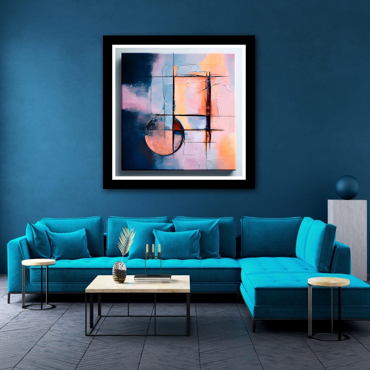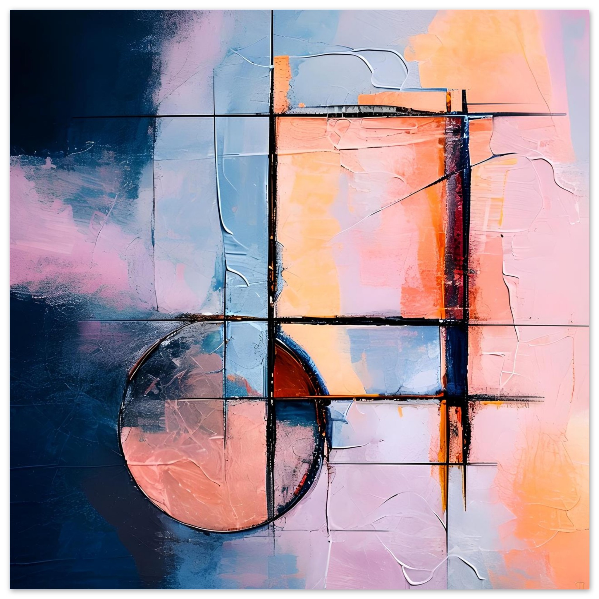 Intersecting Calm brings structured abstraction into a more chromatic register while maintaining compositional discipline. A visible grid anchors the surface, acting as a stabilising framework for layered colour fields and textured transitions. Within this structure, warm and cool tones meet without collision, creating balance through interruption rather than symmetry.