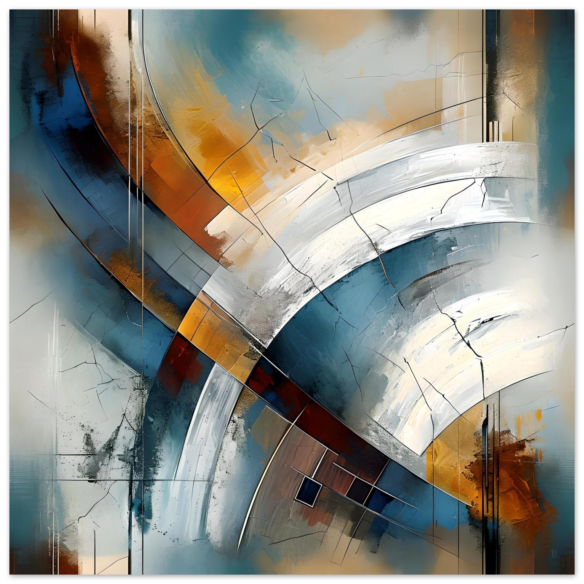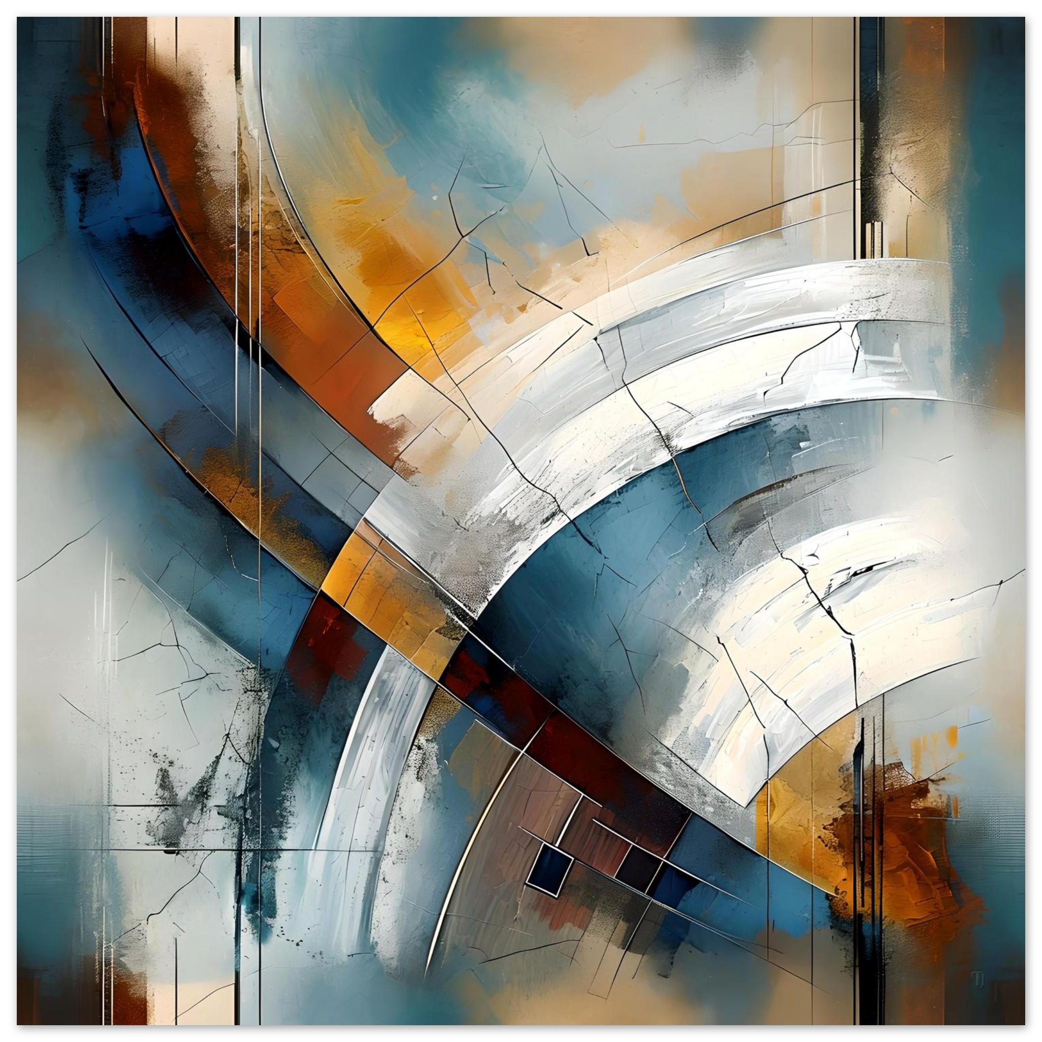 A restrained palette of deep teal, slate blue, soft grey, off-white, and warm ochre accents brings contrast and balance. Fine fissures, linear marks, and layered textures introduce surface tension without disrupting the underlying order, allowing the composition to feel composed rather than chaotic.