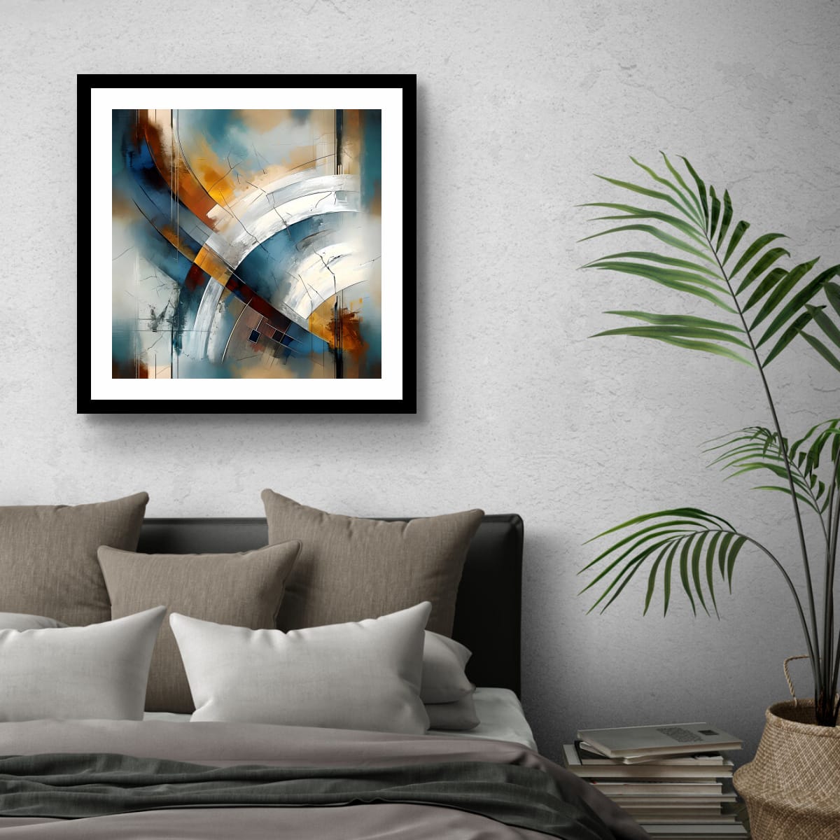 Intersecting Quiet is a contemporary abstract composition built around sweeping curved forms and intersecting architectural bands. Broad arcs cross the surface with intention, creating a sense of structured movement and spatial depth.