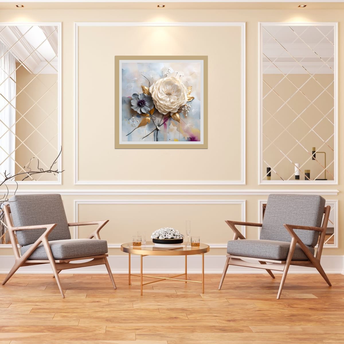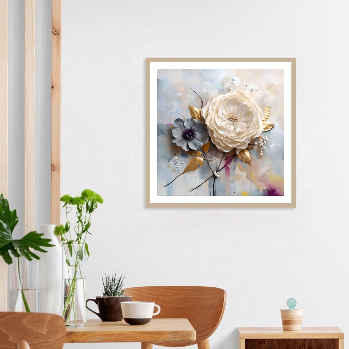 Gold leaves flank the composition like structural brackets. They are not decorative accents; they reinforce the framework of the arrangement. Their metallic surfaces mark the points of tension between organic form and constructed space.