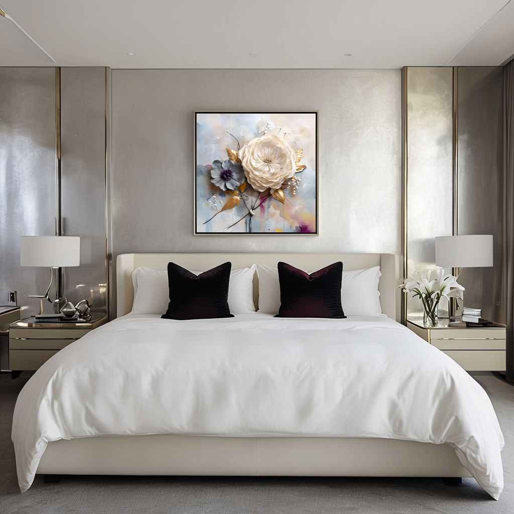 “Ivory Dominion” presents the floral form as architectural rather than delicate. The petals are assembled, the leaves positioned with intent, and the space around them remains active but contained. It is a study in layered construction, where organic subject matter is handled with deliberate control.