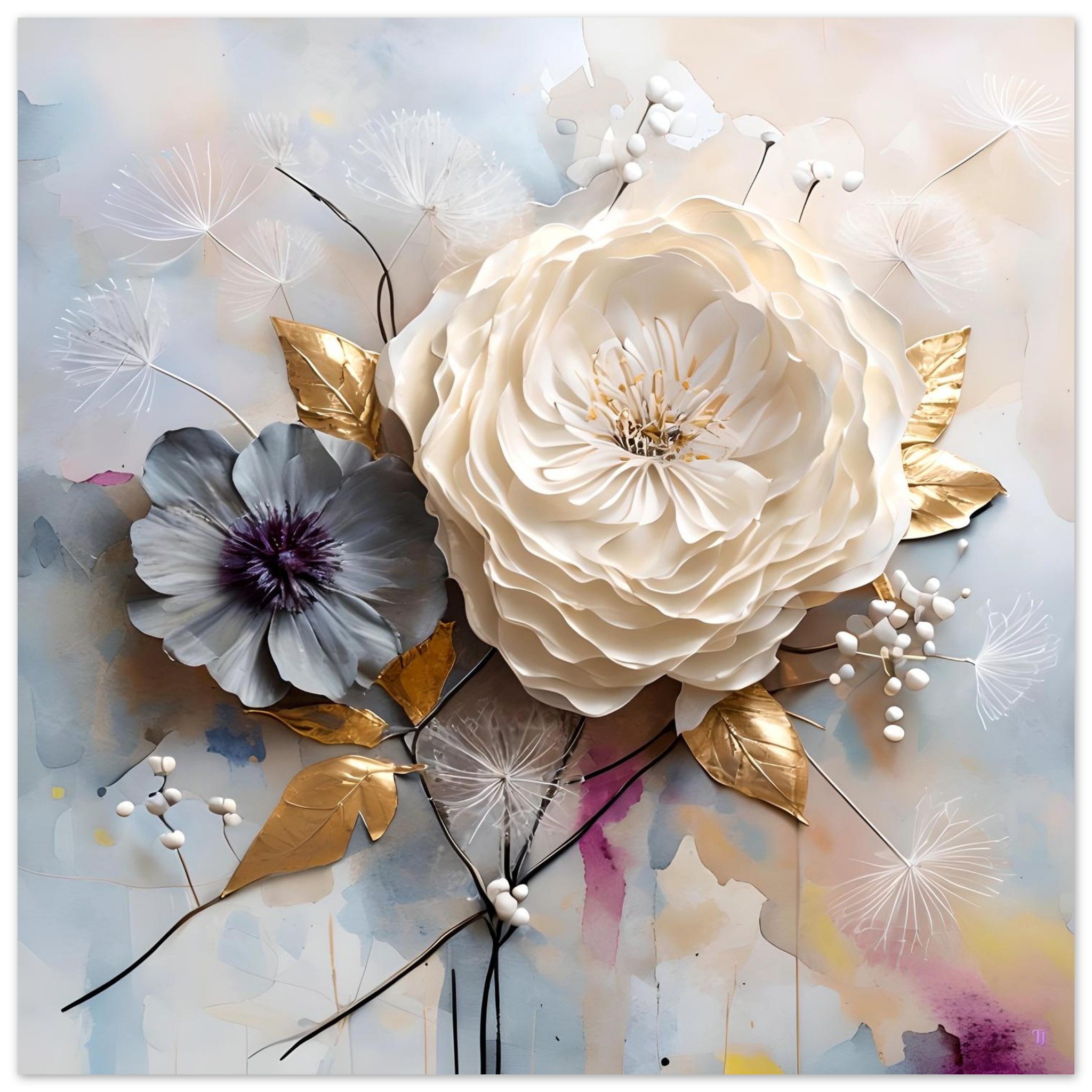 A secondary bloom in muted grey introduces weight and contrast. Its darker centre stabilises the composition and prevents the ivory from drifting into fragility. Fine stems and seed heads extend outward in thin, deliberate lines, providing counterbalance to the layered mass of the central rose.