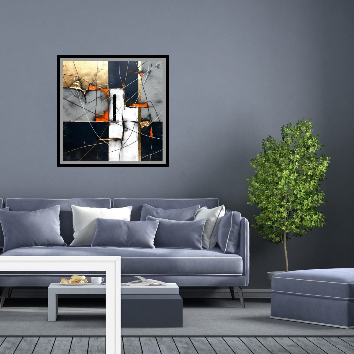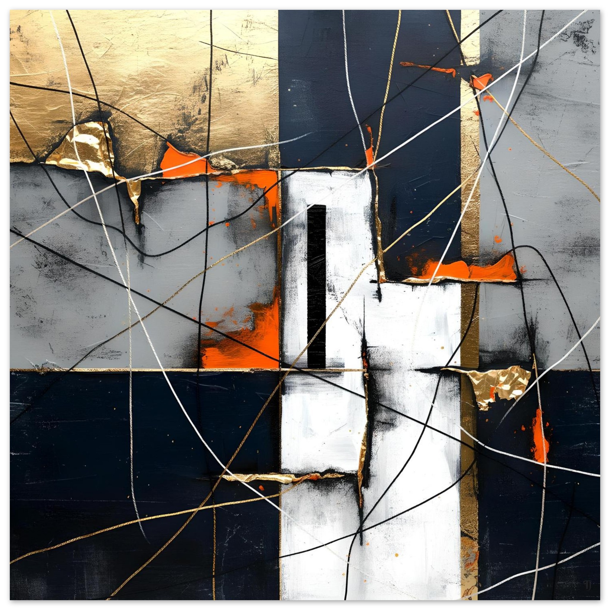 A modern abstract composition constructed from intersecting geometric blocks and linear gestures. The artwork combines deep navy, slate grey, soft white, and warm neutral tones, punctuated by restrained accents of gold and burnt orange.