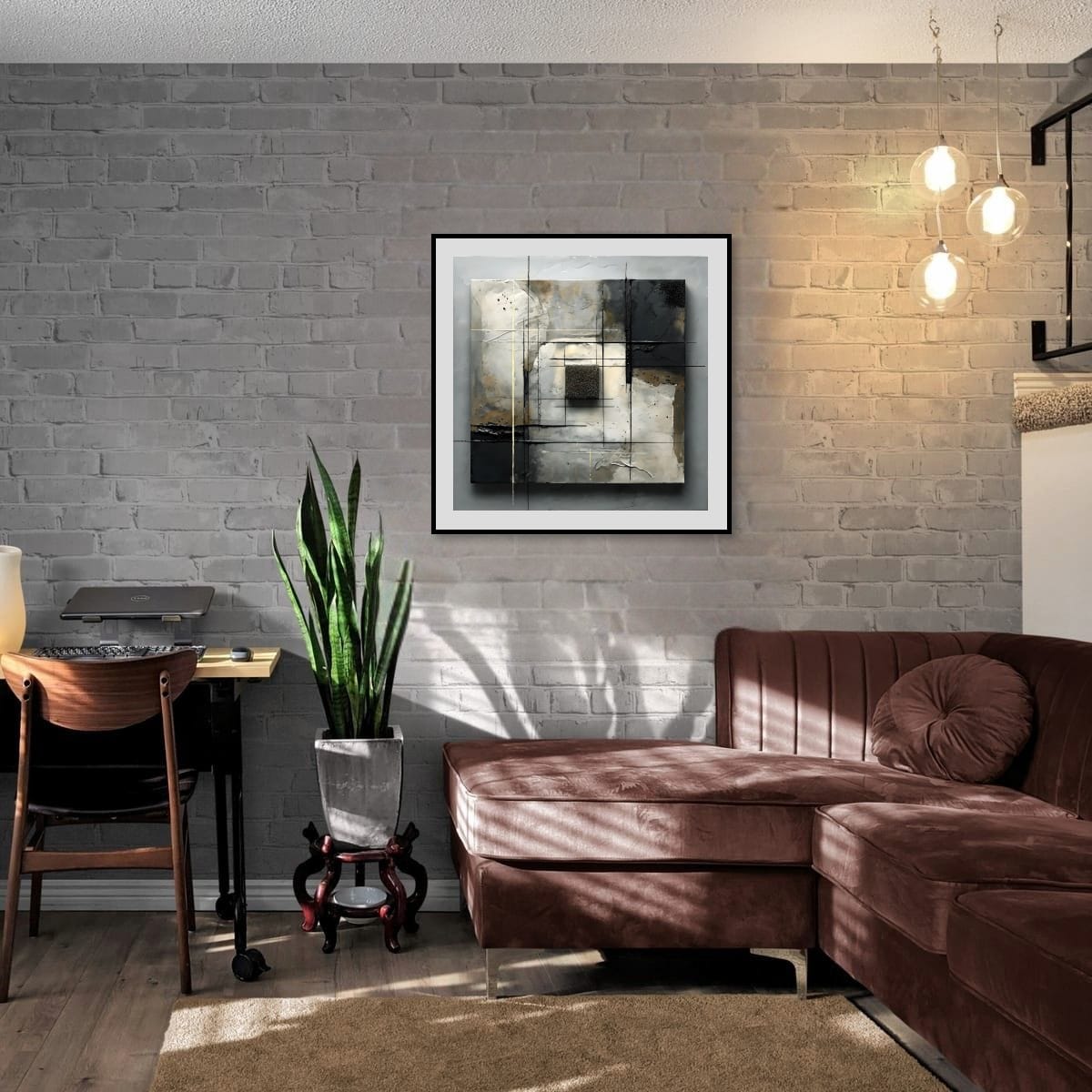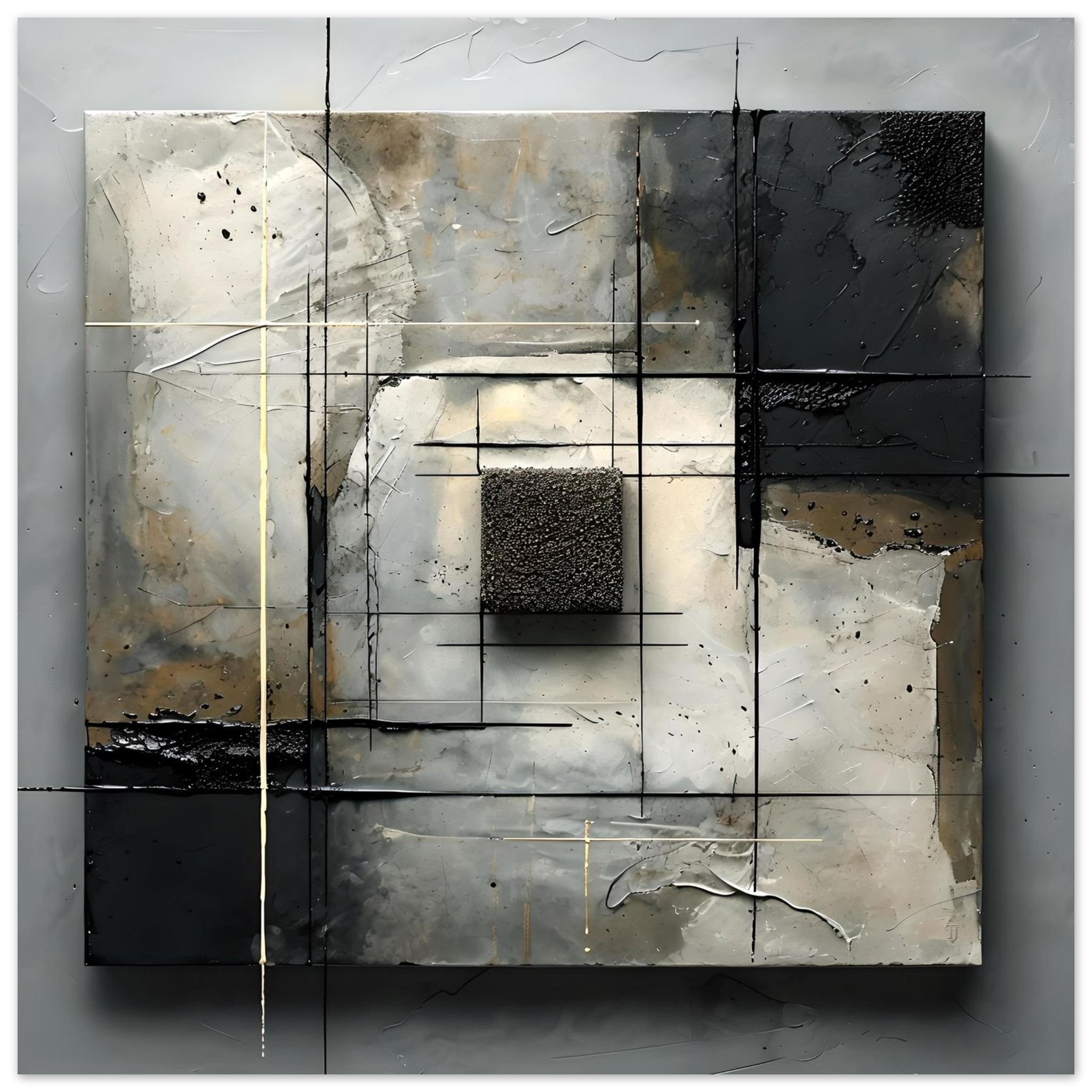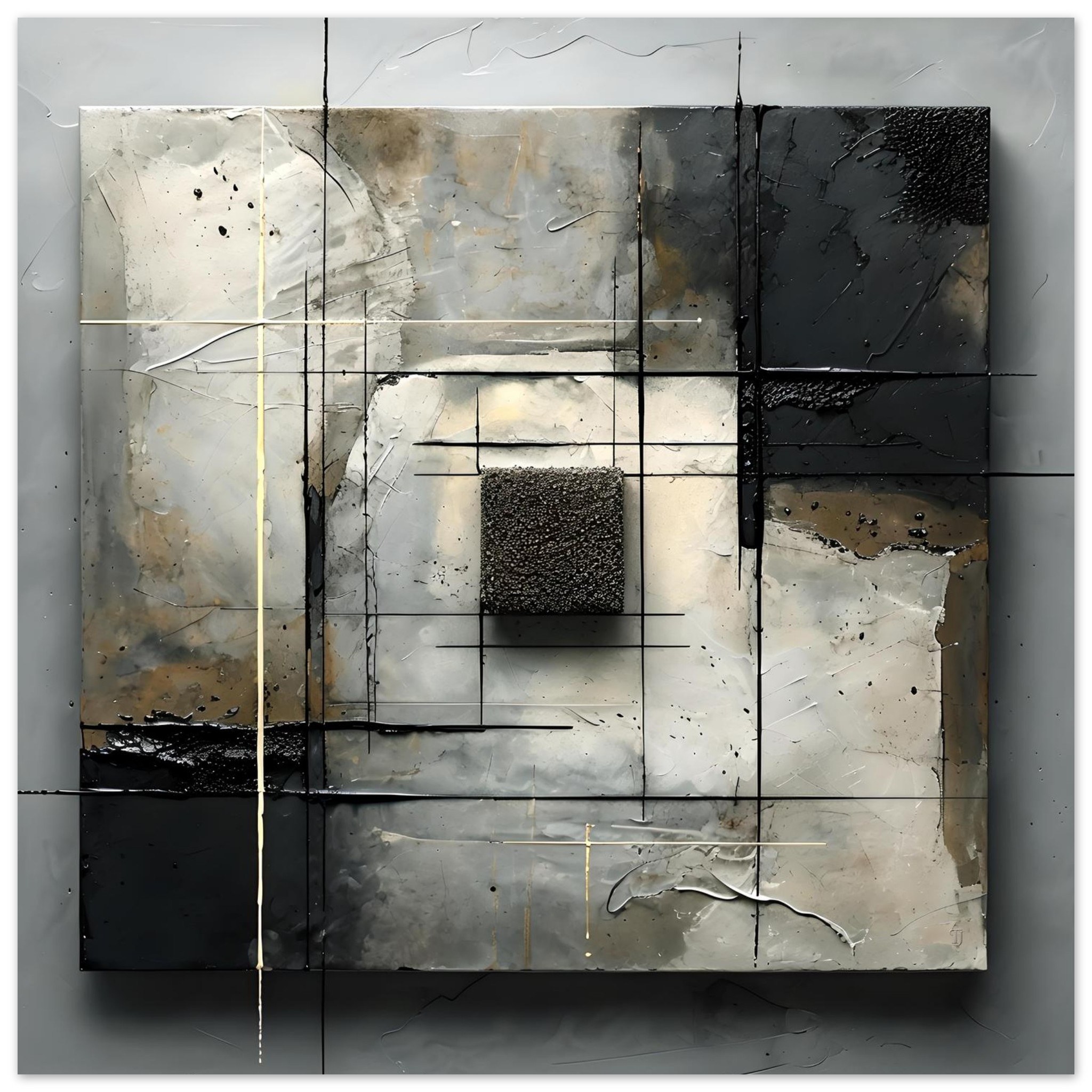 A muted palette of stone, ash, charcoal, and warm neutral tones reinforces the architectural character of the work. Subtle metallic lines and layered textures create quiet points of tension, balancing precision with imperfection.