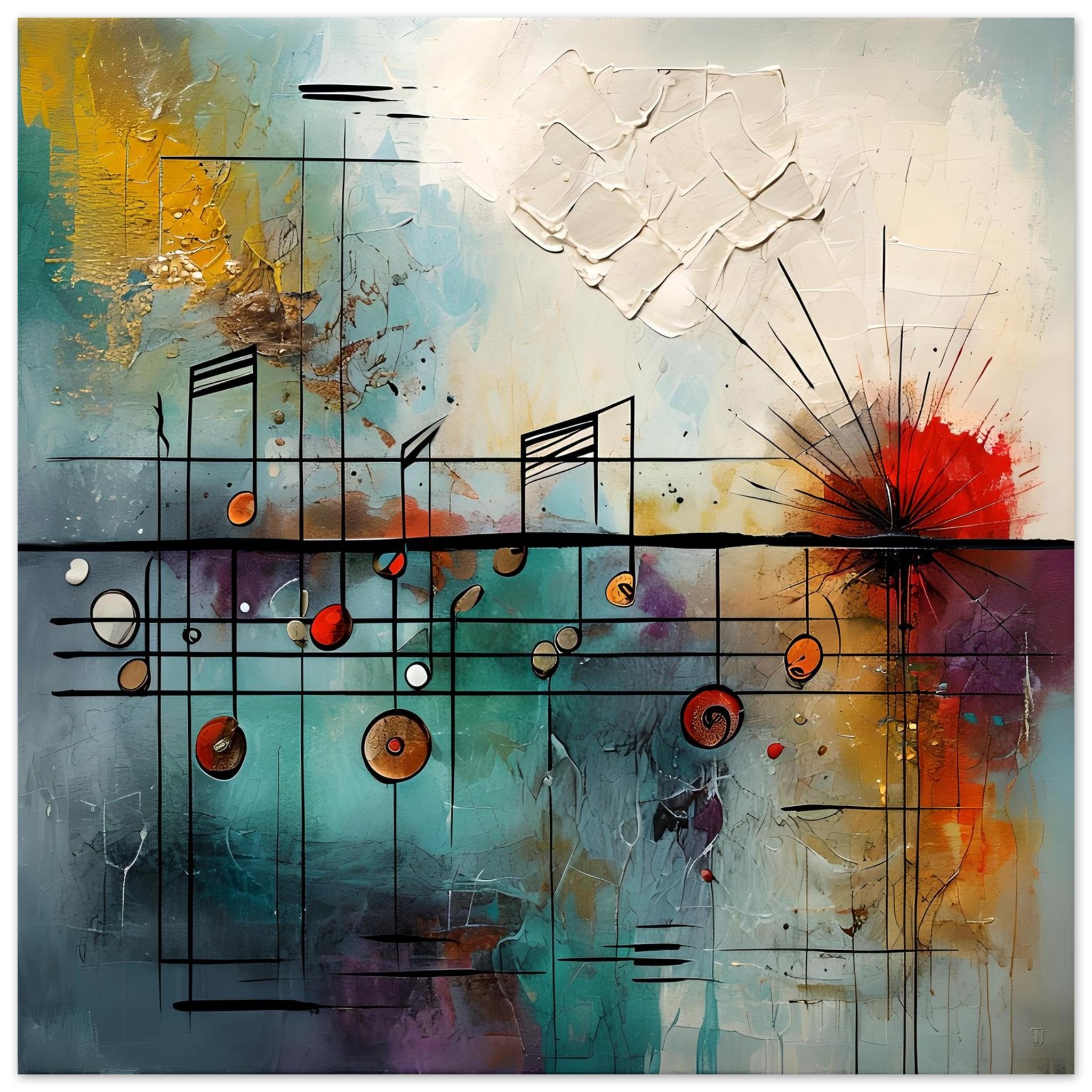 This abstract composition draws on the language of music, weaving rhythmic linework and symbolic notes through layered colour fields to create a sense of visual cadence and flow. The structure feels composed rather than chaotic, with movement emerging through contrast, repetition, and controlled disruption.