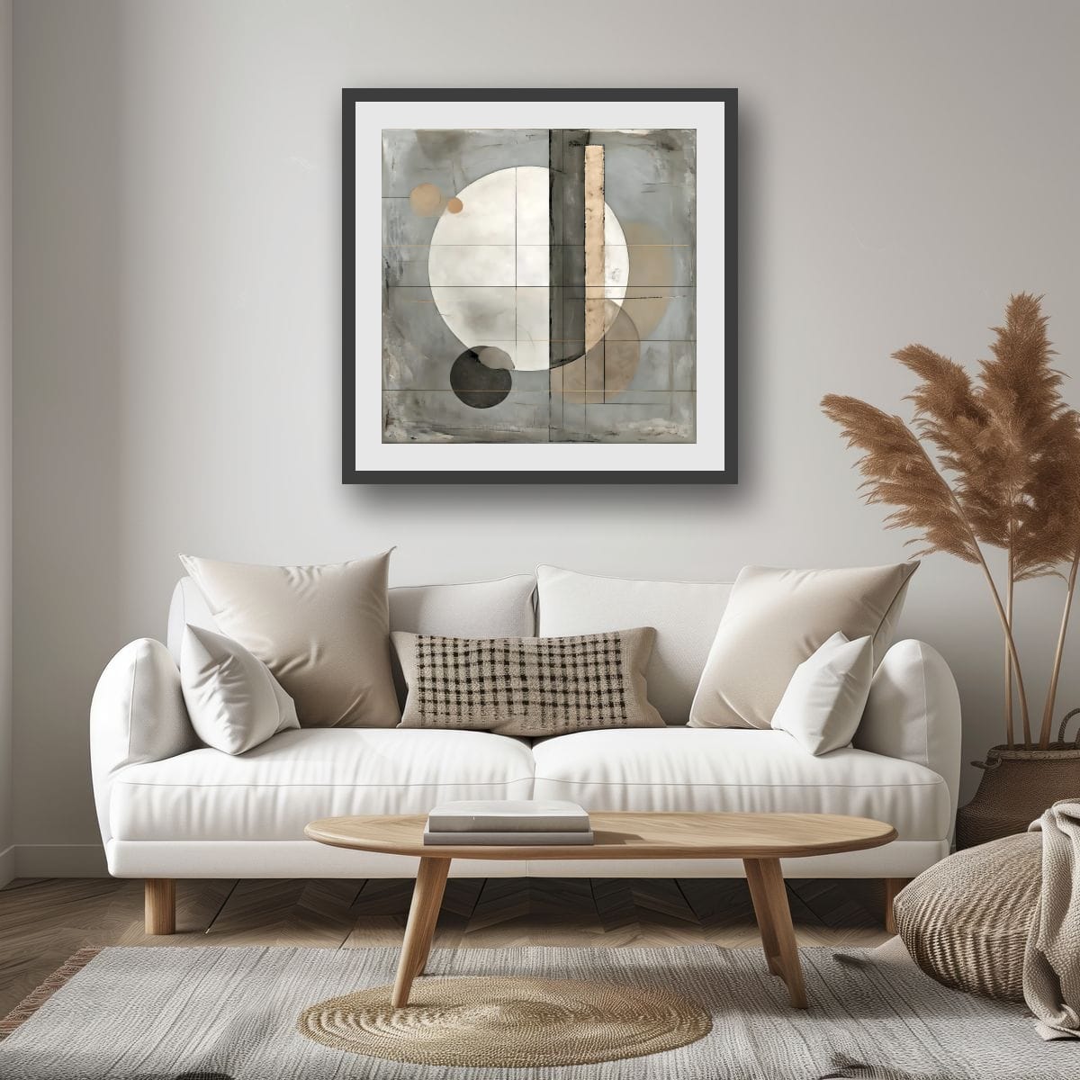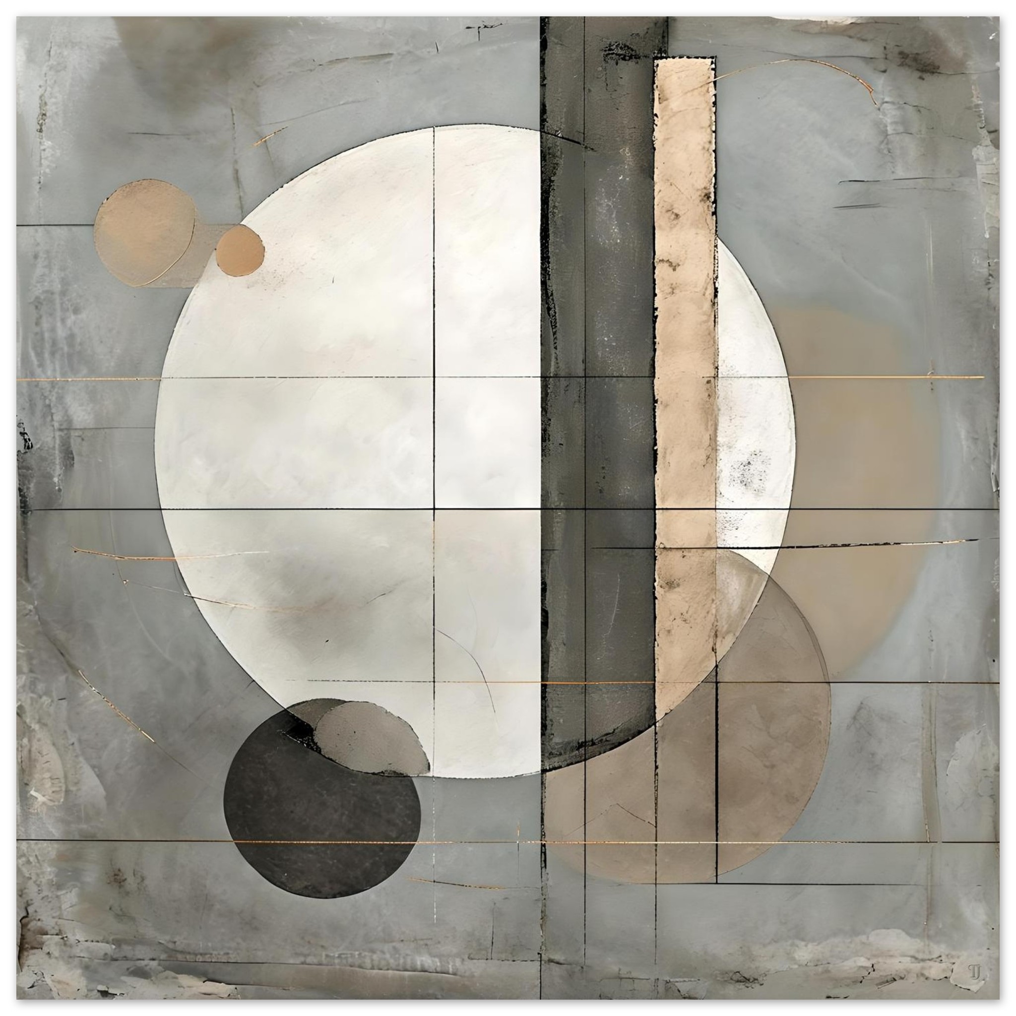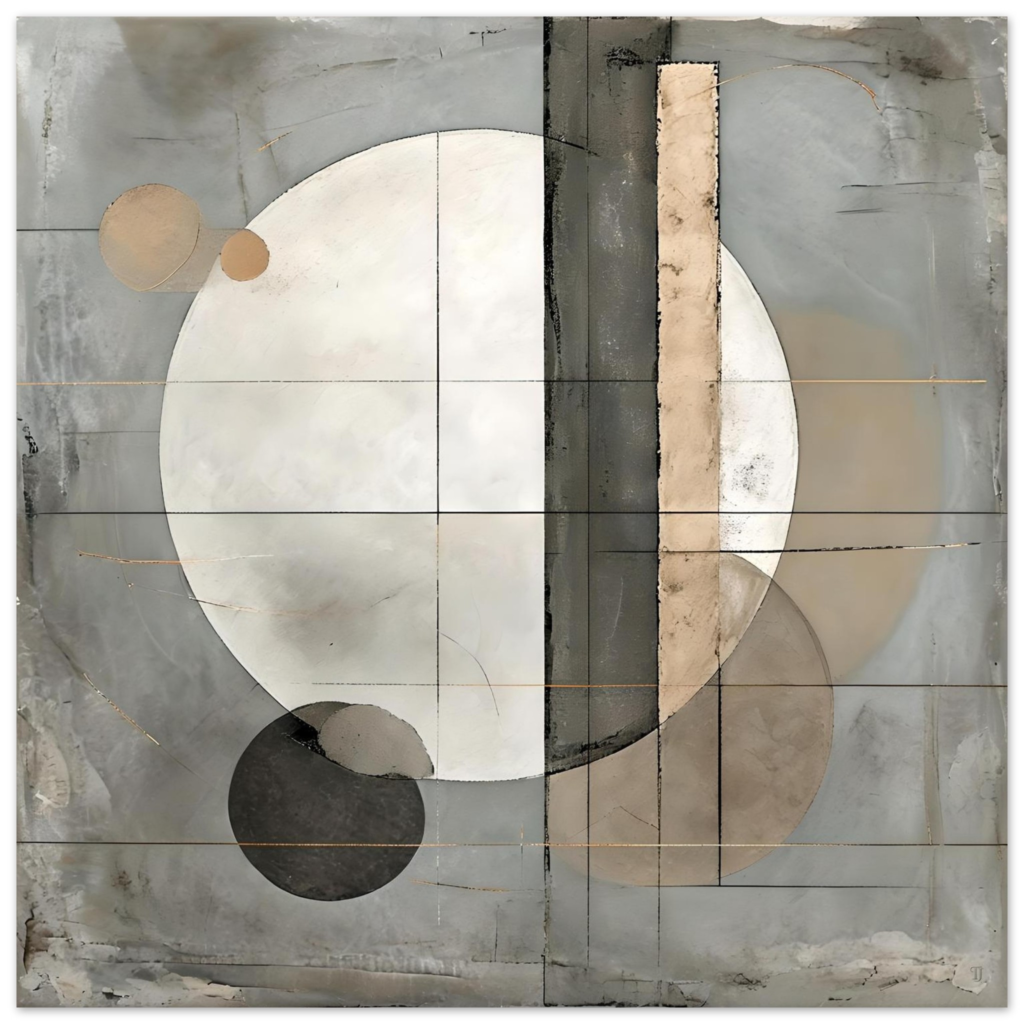 Measured Stillness is a restrained geometric abstraction built around balance, proportion, and quiet tension. A dominant pale circular form anchors the composition, intersected by vertical and horizontal divisions that introduce structure without rigidity. The geometry feels deliberate and calibrated, allowing space and form to coexist without hierarchy.