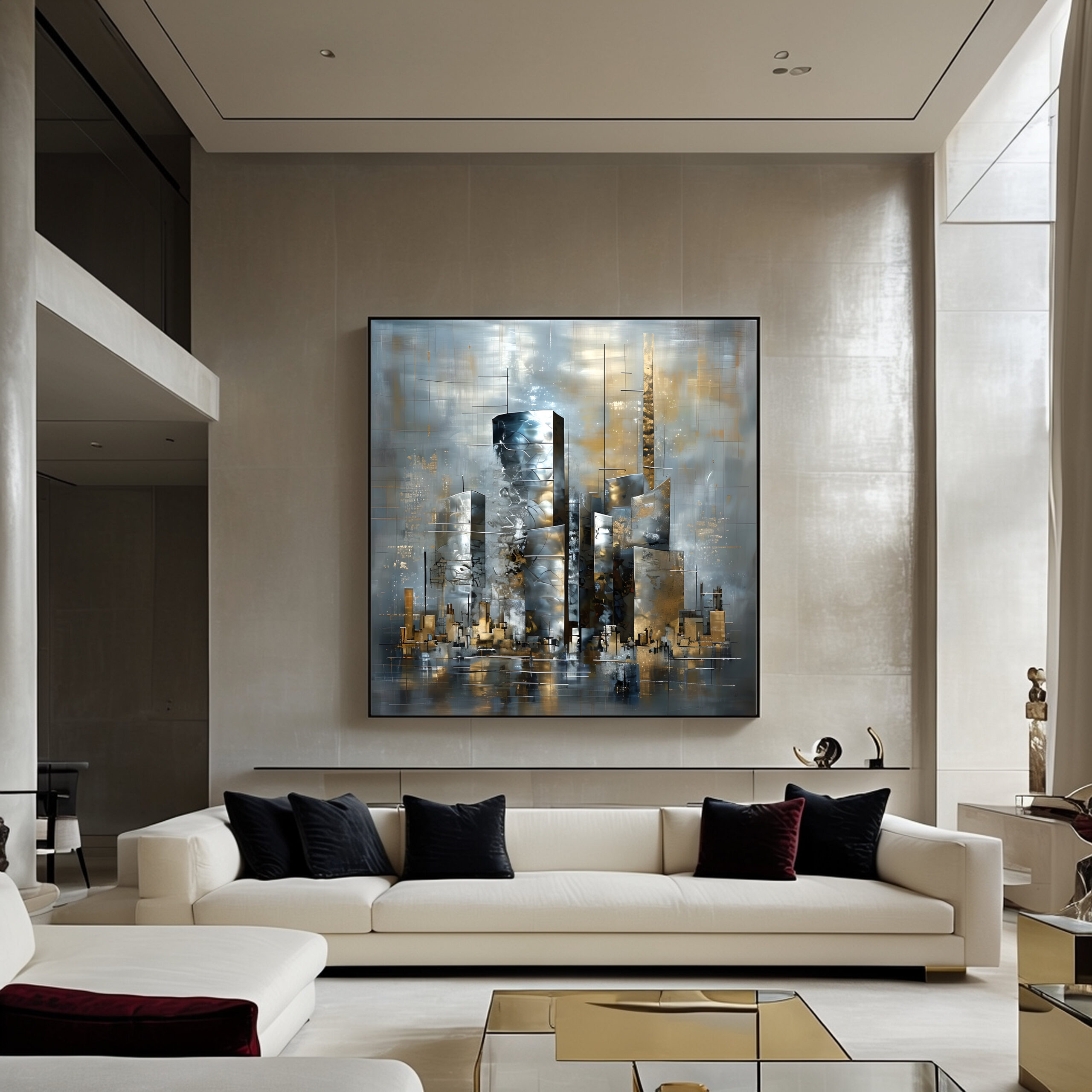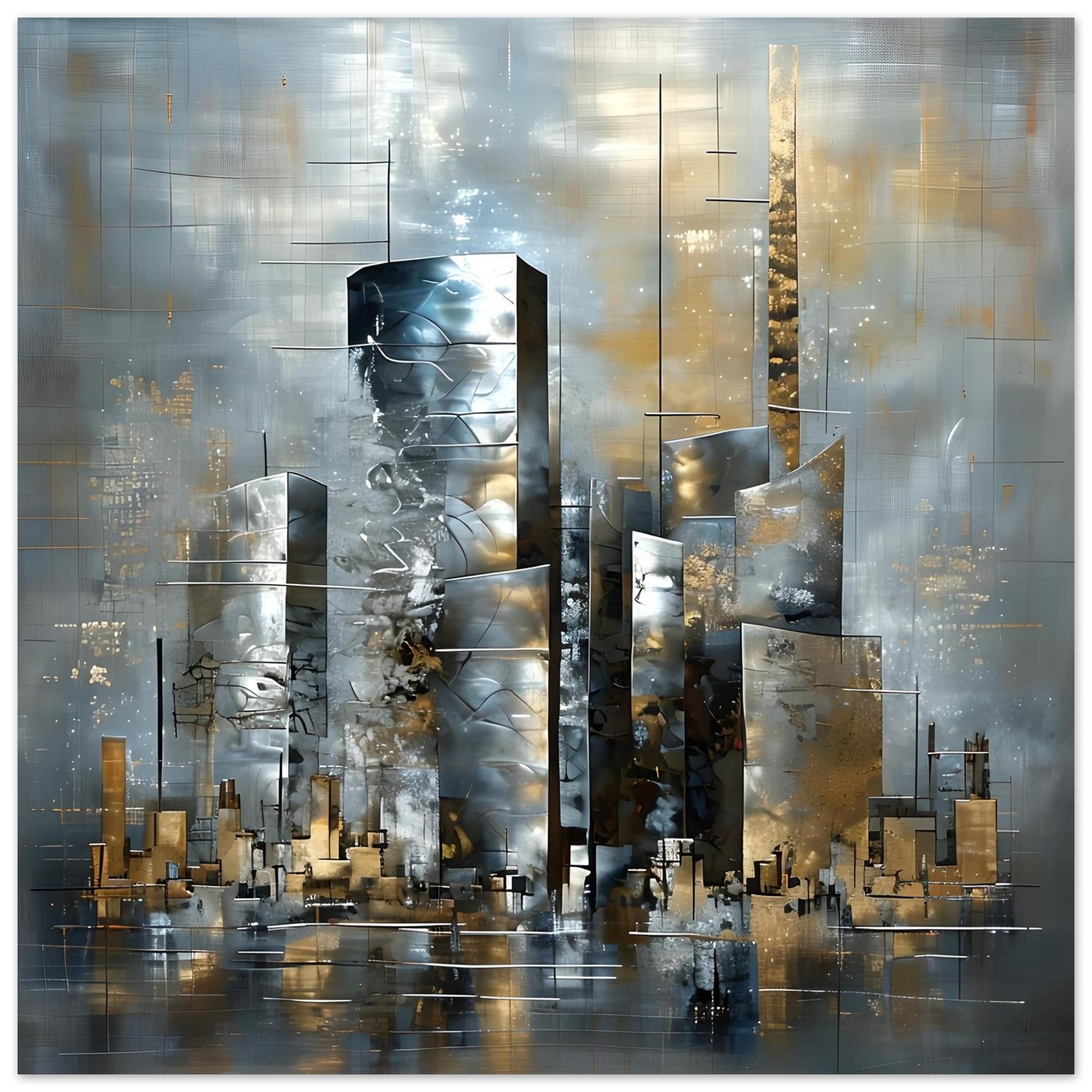 Light flickers across muted greys and silvers, while gold-toned deposits appear as residue — traces of compression, weight, and time rather than ornament. Lower forms feel grounded and burdened, while upper sections loom with a sense of unresolved load. The space remains austere and flinty, stripped of narrative comfort.