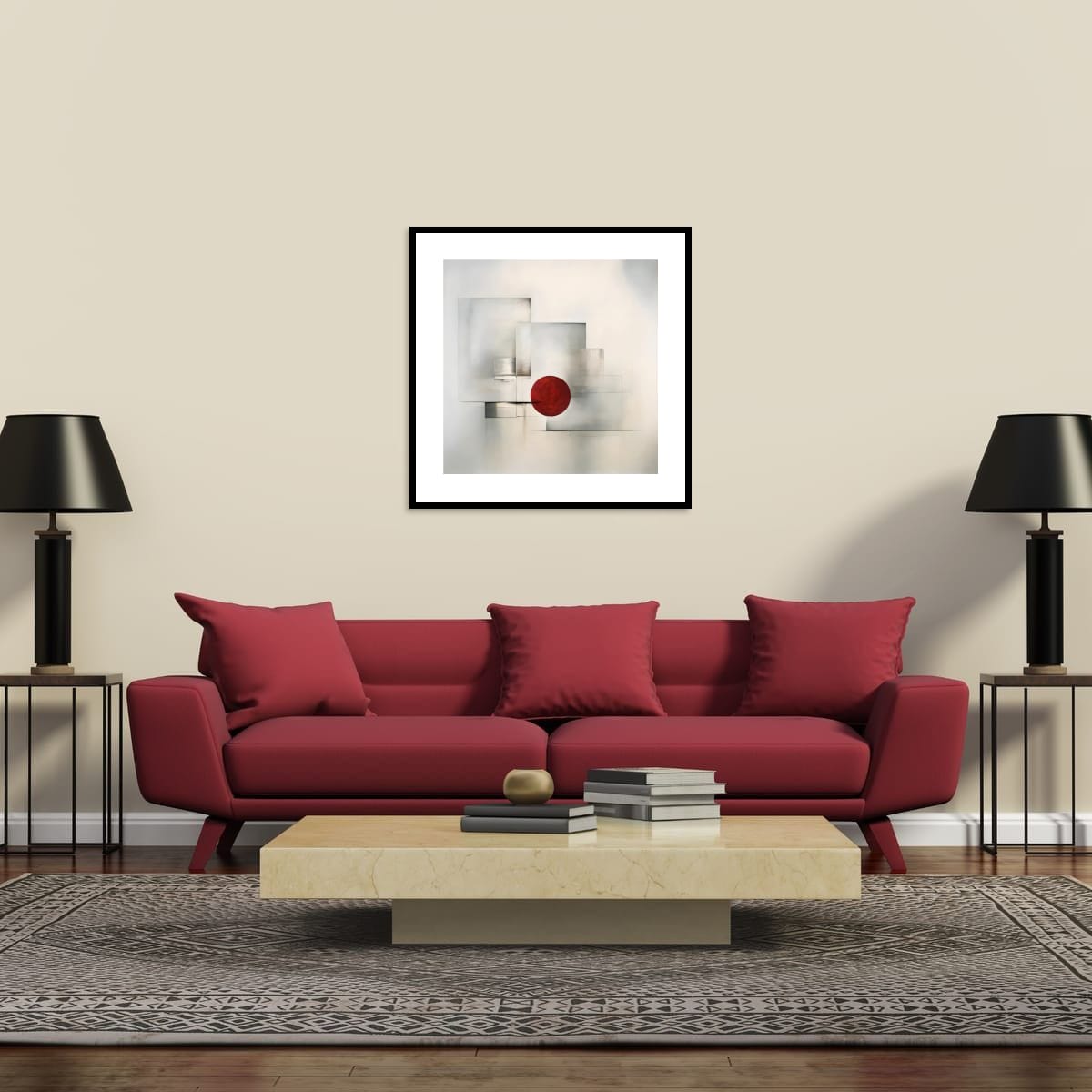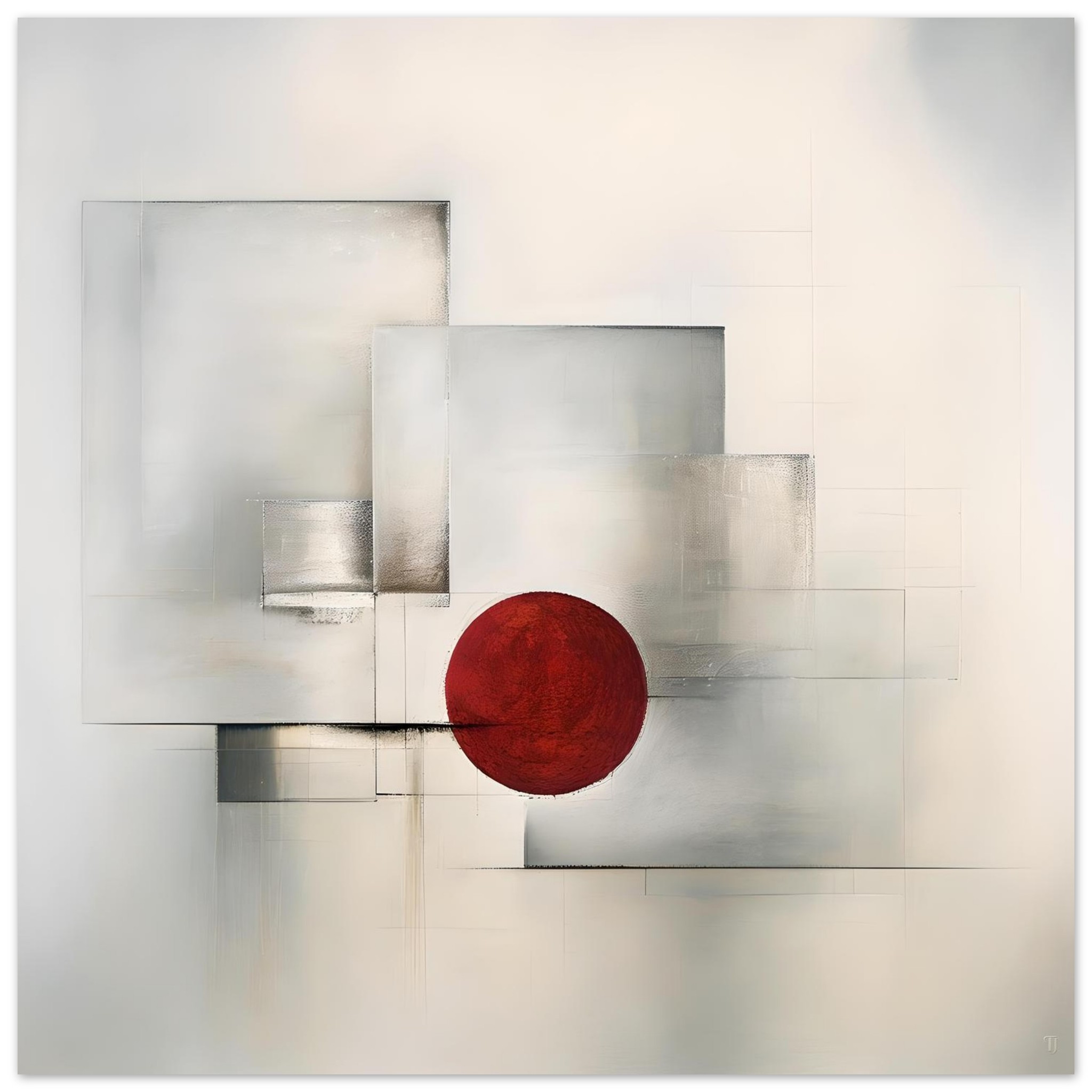 This work explores controlled tension through contrast and restraint. A single red circular form is held in balance against layered, translucent geometric planes, creating a quiet confrontation between focus and diffusion, weight and suspension.