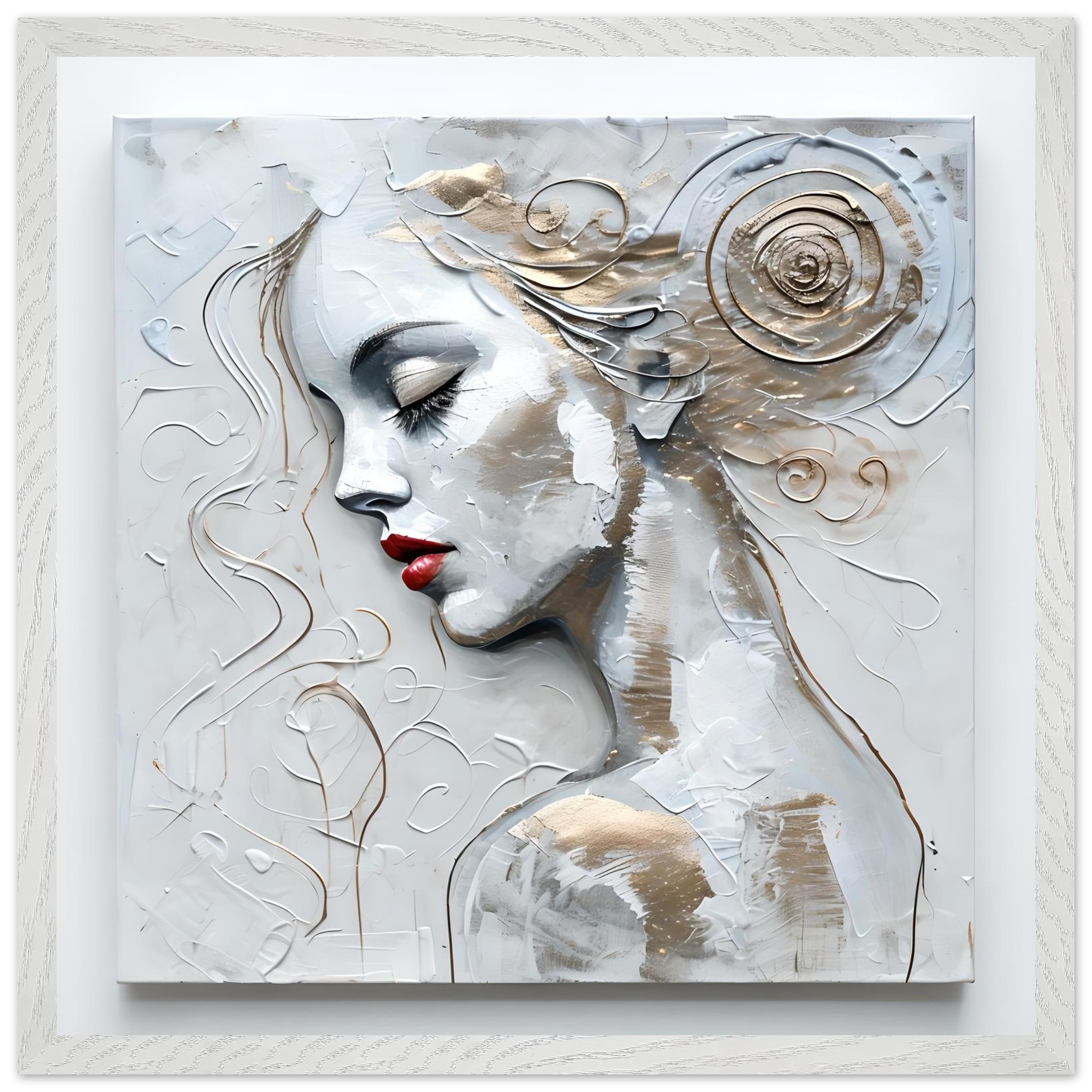 This work is defined by its tactile, sculptural presence. The surface is a landscape of intentional disruption—scored by digital “palette knives” and etched with fine, wire-like gold filigree that cuts through the heavy, matte white impasto. There is a palpable weight to the negative space; the background is not an empty void but a pressurized mass of textured plaster and weathered sediment.