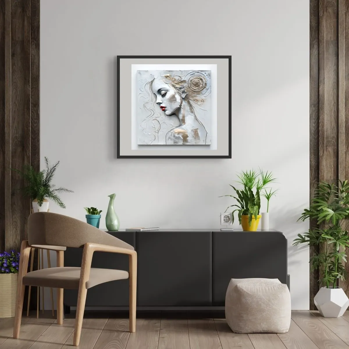 The composition explores a “discordant harmony” between the organic softness of the profile and the fractured geometry of the surrounding atmosphere. Every mark is a record of a decision—scrapes, scuffs, and built-up layers that refuse to be smoothed over. This is a study of presence and absence, where the history of the making is left exposed, demanding to be seen rather than merely liked. It is a modern relic, unvarnished and unapologetic in its structural complexity.
