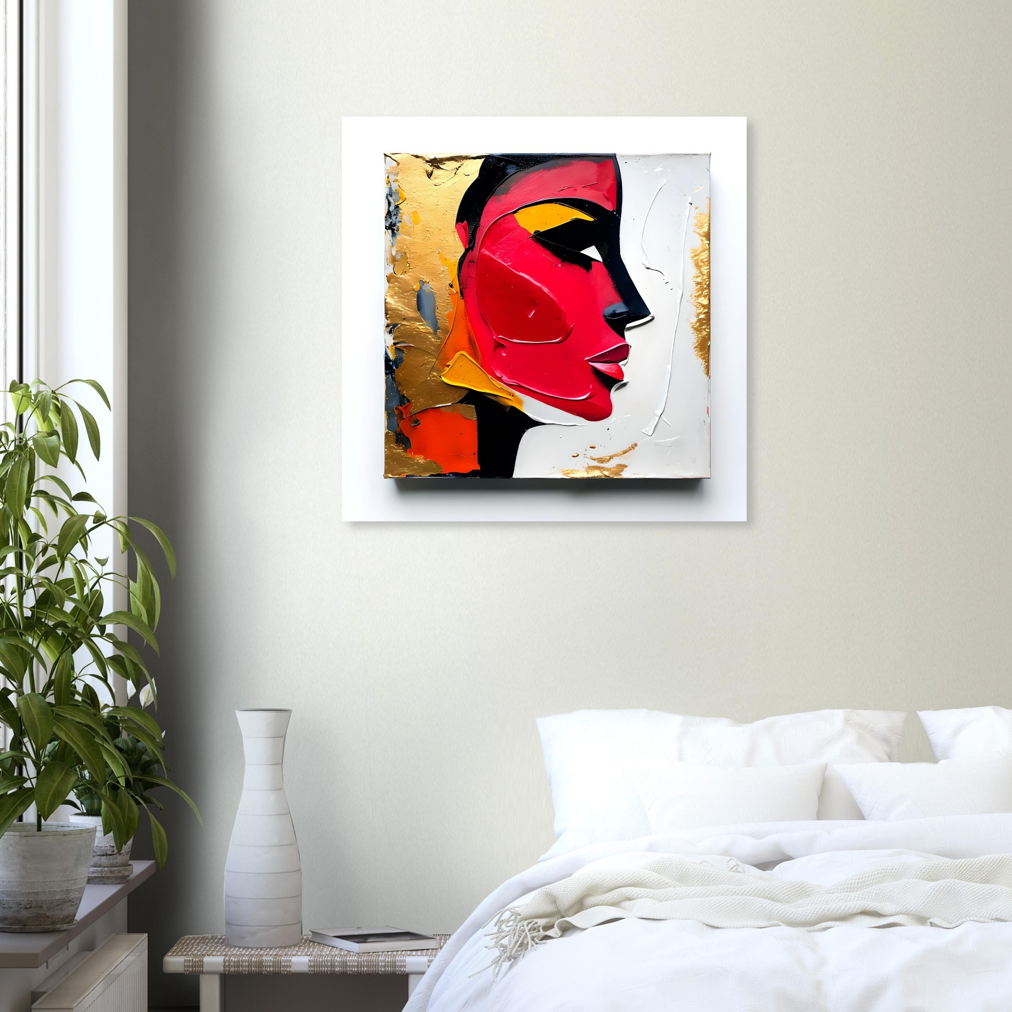 The figure emerges as a force rather than a likeness. A dense red mass presses forward, shaped by sharp black interruptions that read as voids or removals rather than outlines. These cuts define motion through absence, giving the profile its momentum and compression. Identity remains secondary to movement.