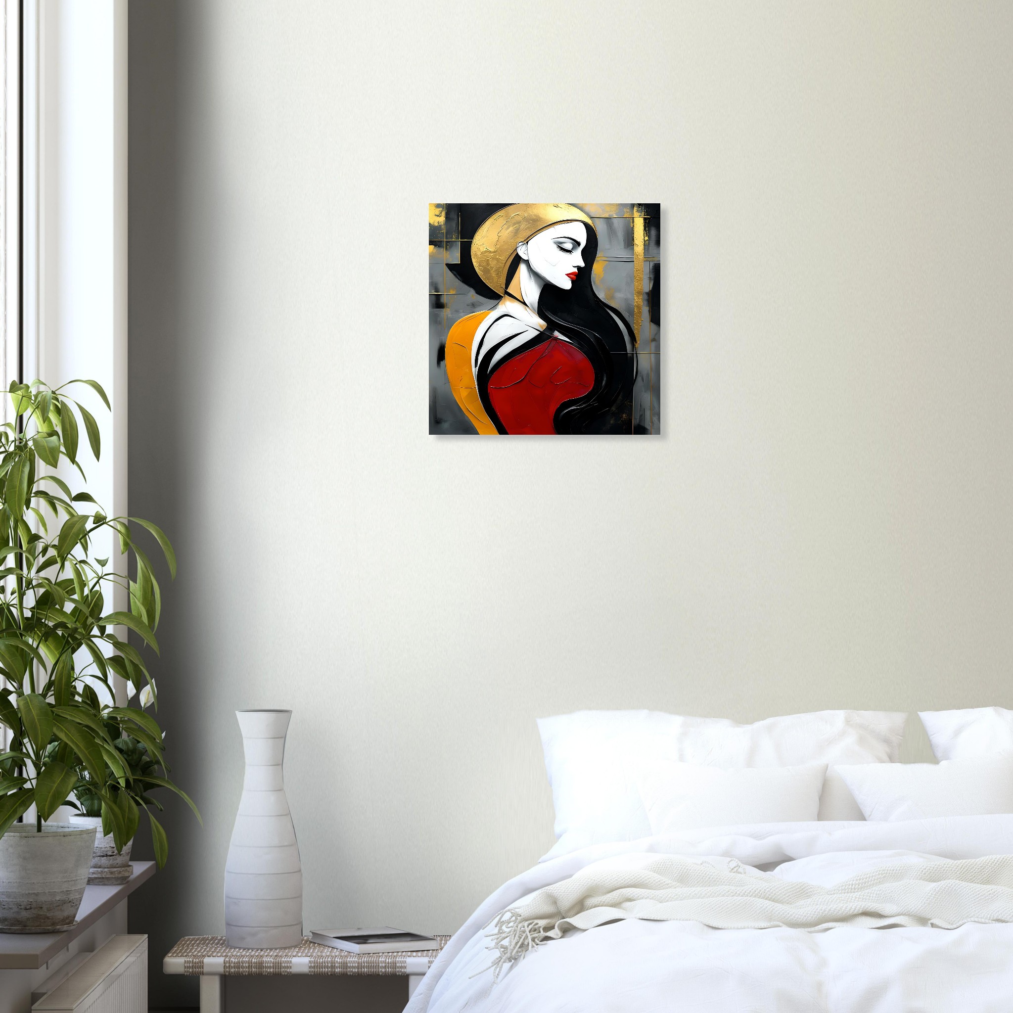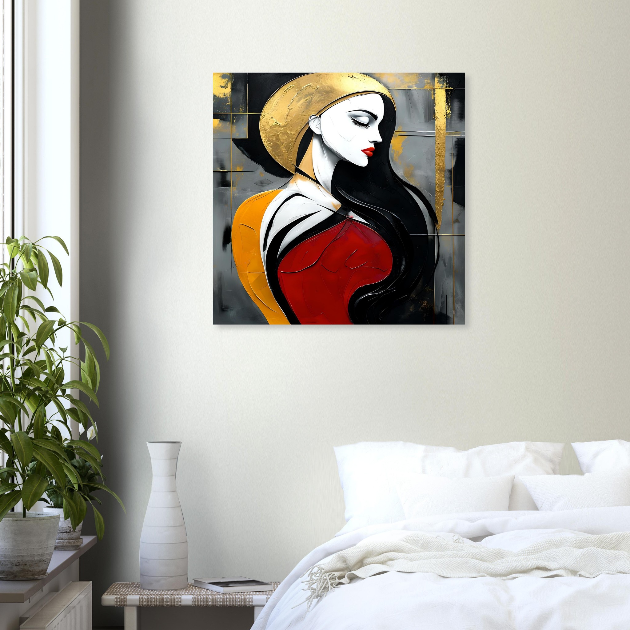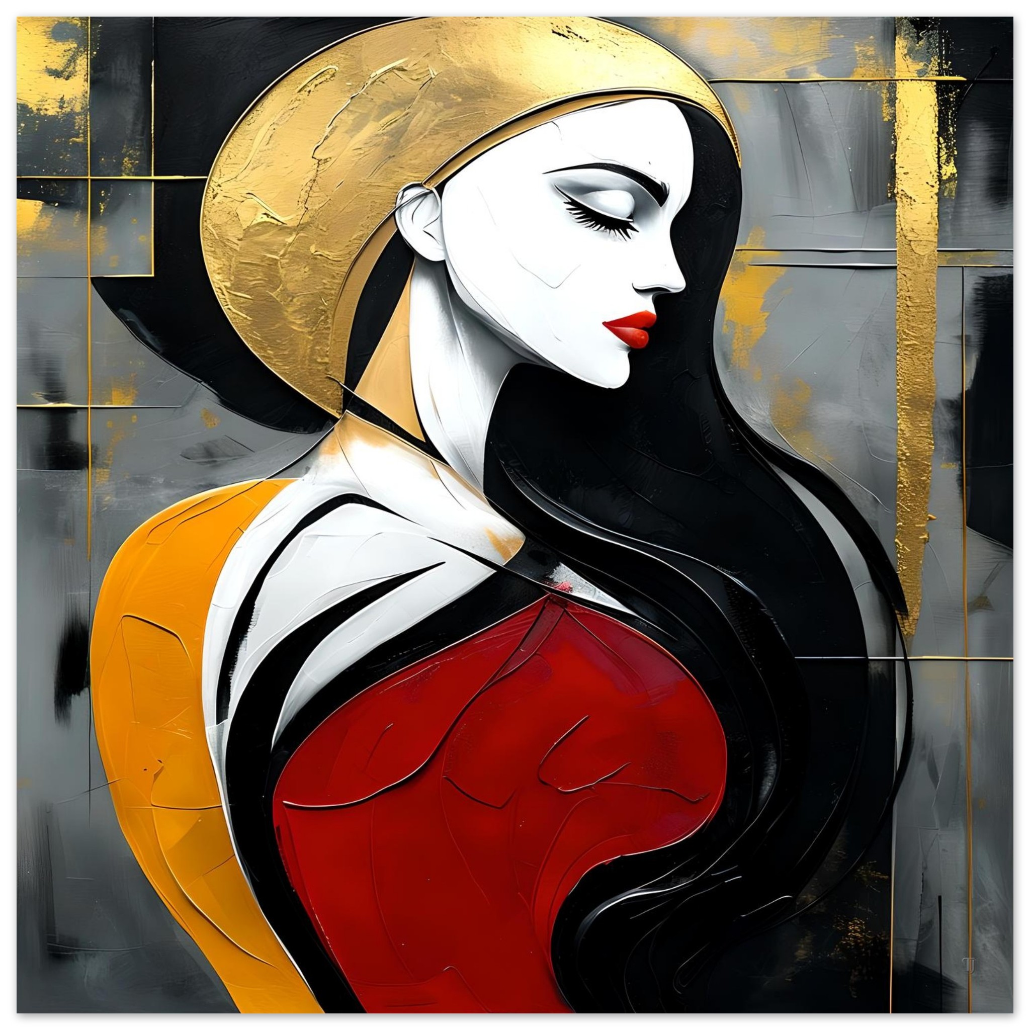 Gold elements operate structurally rather than symbolically. They frame and counterbalance the figure, adding weight and containment instead of ornament. Subtle grid lines in the background introduce restraint, preventing the work from tipping into glamour or illustration. The composition remains disciplined, controlled, and intentional.