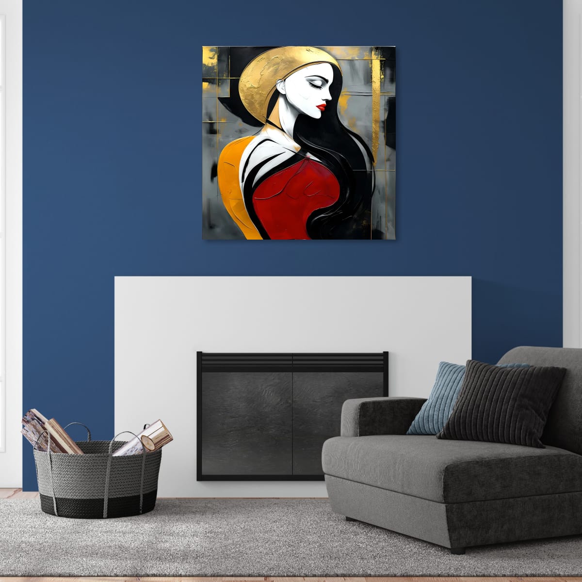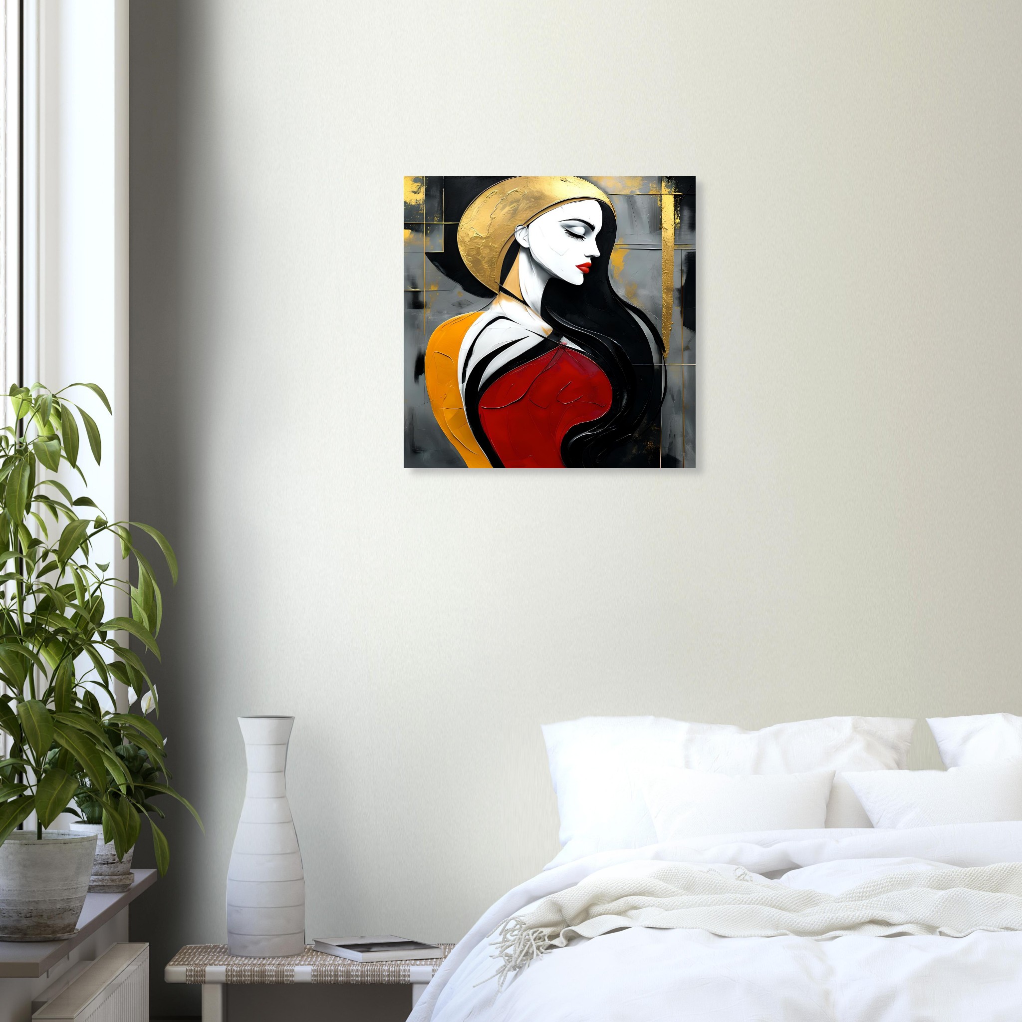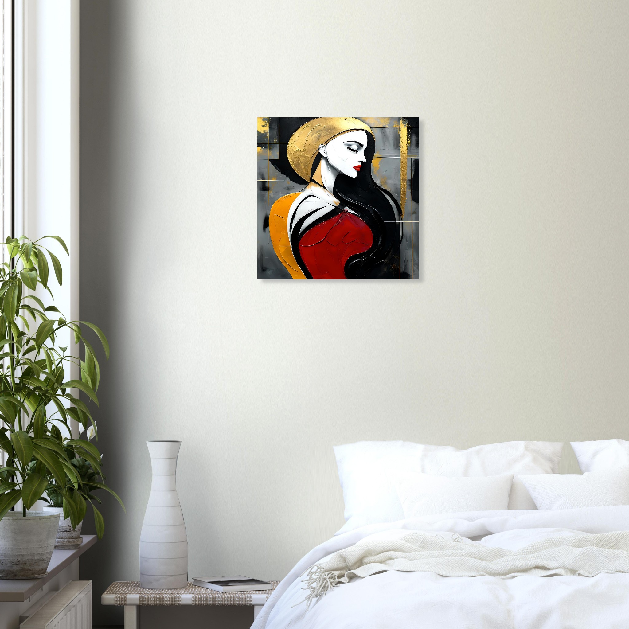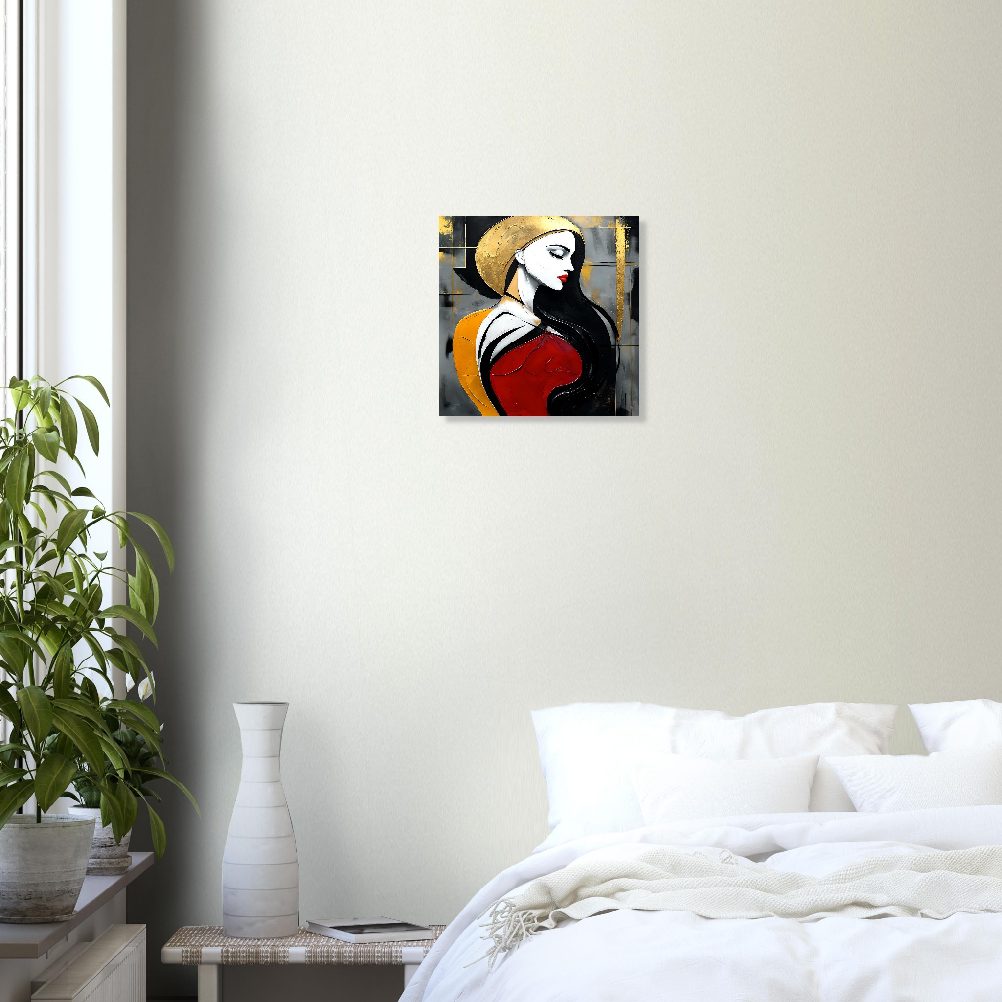 Gold elements operate structurally rather than symbolically. They frame and counterbalance the figure, adding weight and containment instead of ornament. Subtle grid lines in the background introduce restraint, preventing the work from tipping into glamour or illustration. The composition remains disciplined, controlled, and intentional.