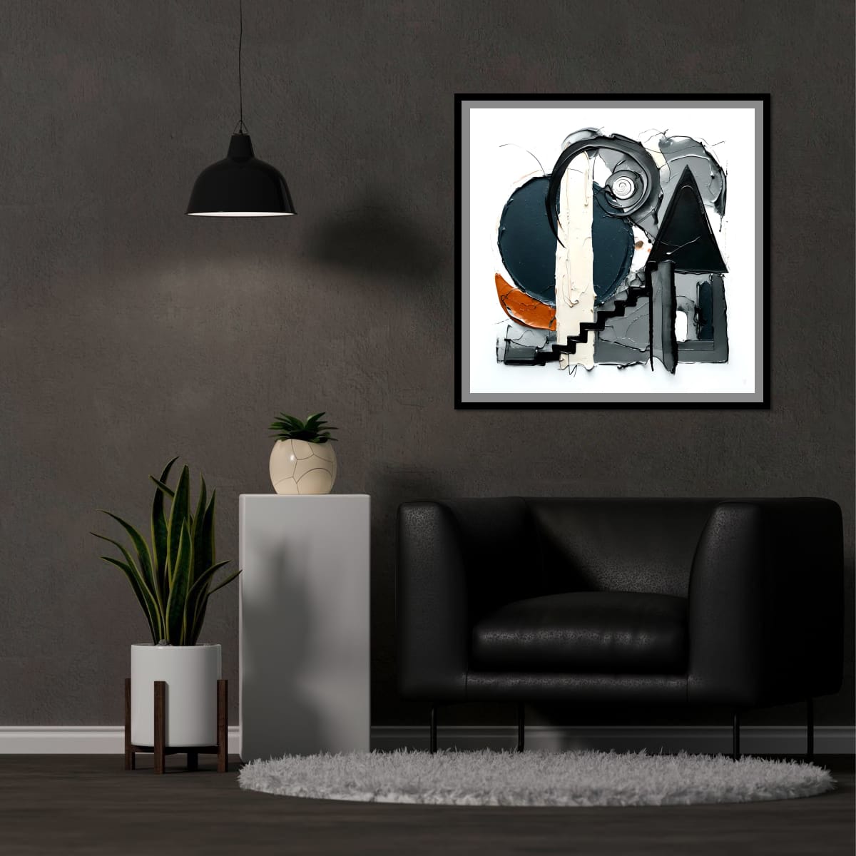 The colour palette is restrained and deliberate, combining deep blue, charcoal, and soft grey with a central bone-white vertical element and a muted burnt orange accent. These colours are distributed to maintain balance and hierarchy, allowing contrast without visual disruption. Varied surface textures—ranging from smooth to heavily worked—add depth and material presence while preserving clarity of form. The overall composition feels controlled, measured, and resolved through structure rather than symmetry.