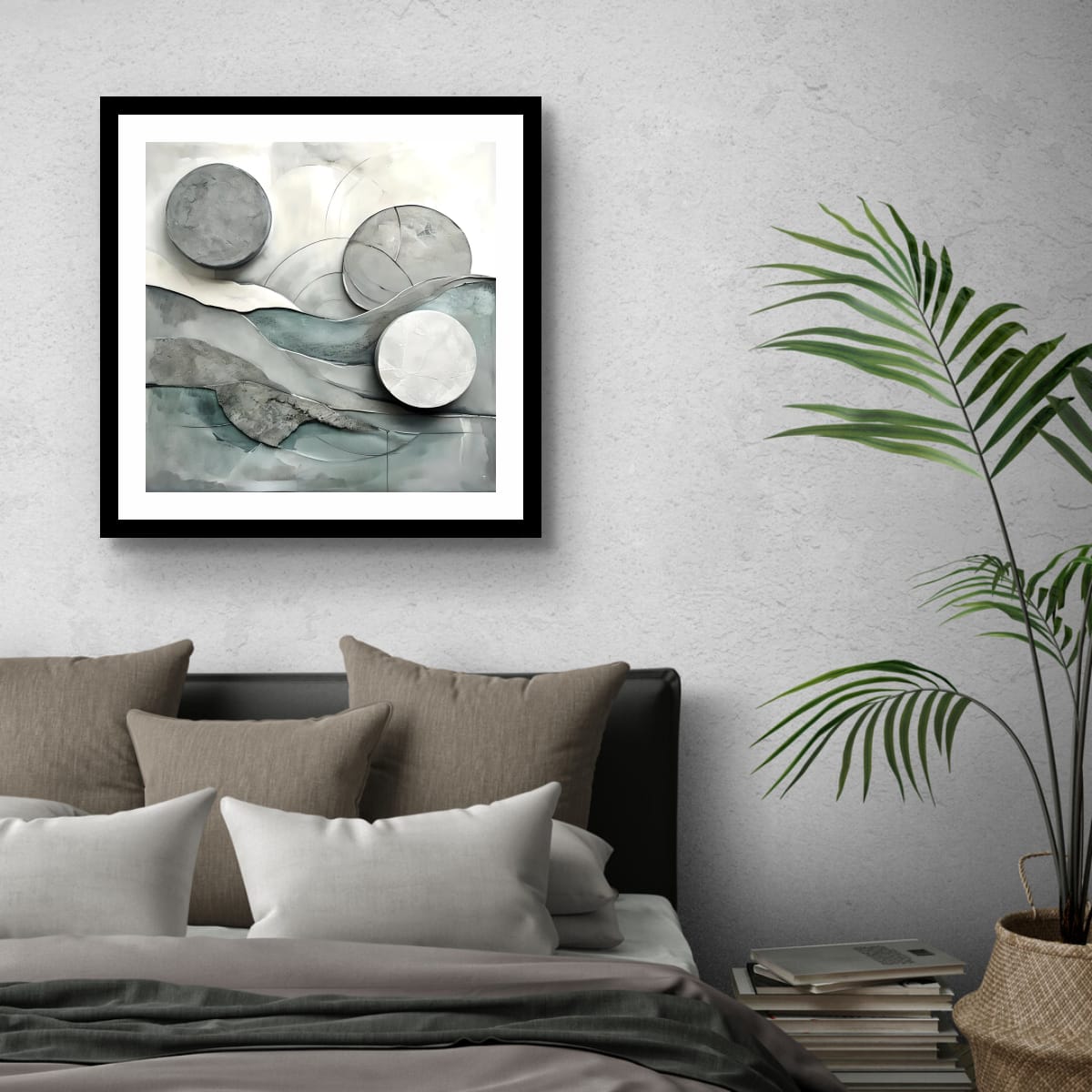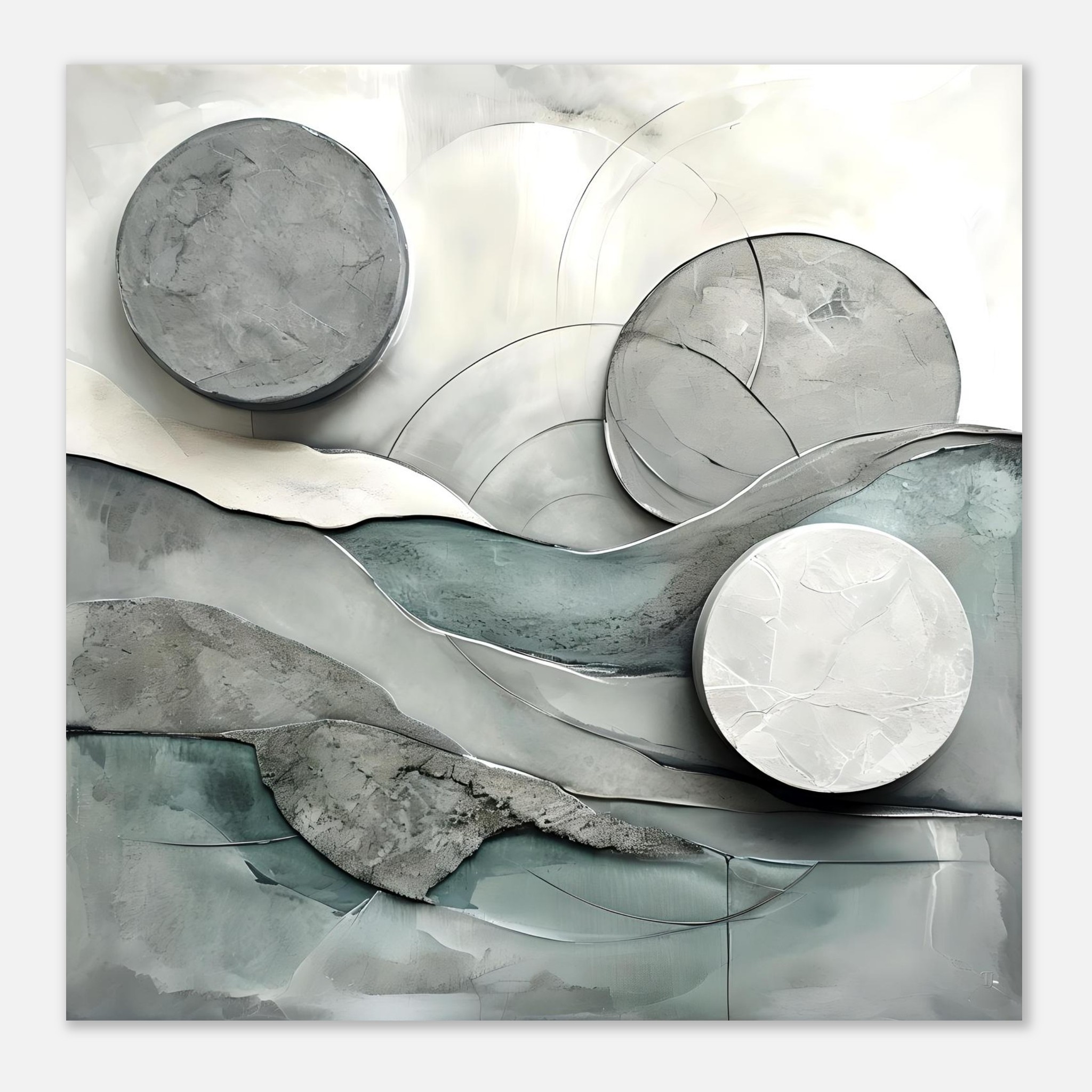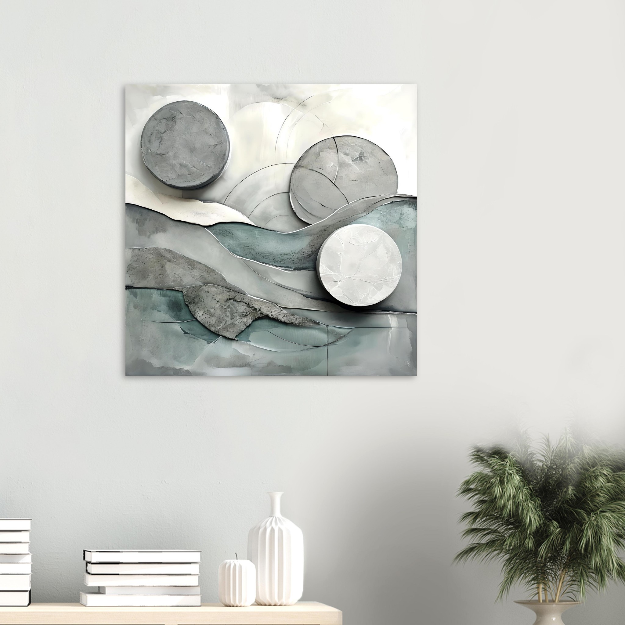 Still Forms, Moving Ground is an abstract composition built around balance, restraint, and subtle movement. Layered circular forms rest within soft, flowing bands, creating a dialogue between structure and fluidity. The geometry provides weight and stability, while the gentle shifts in tone and texture introduce a sense of quiet motion across the surface.