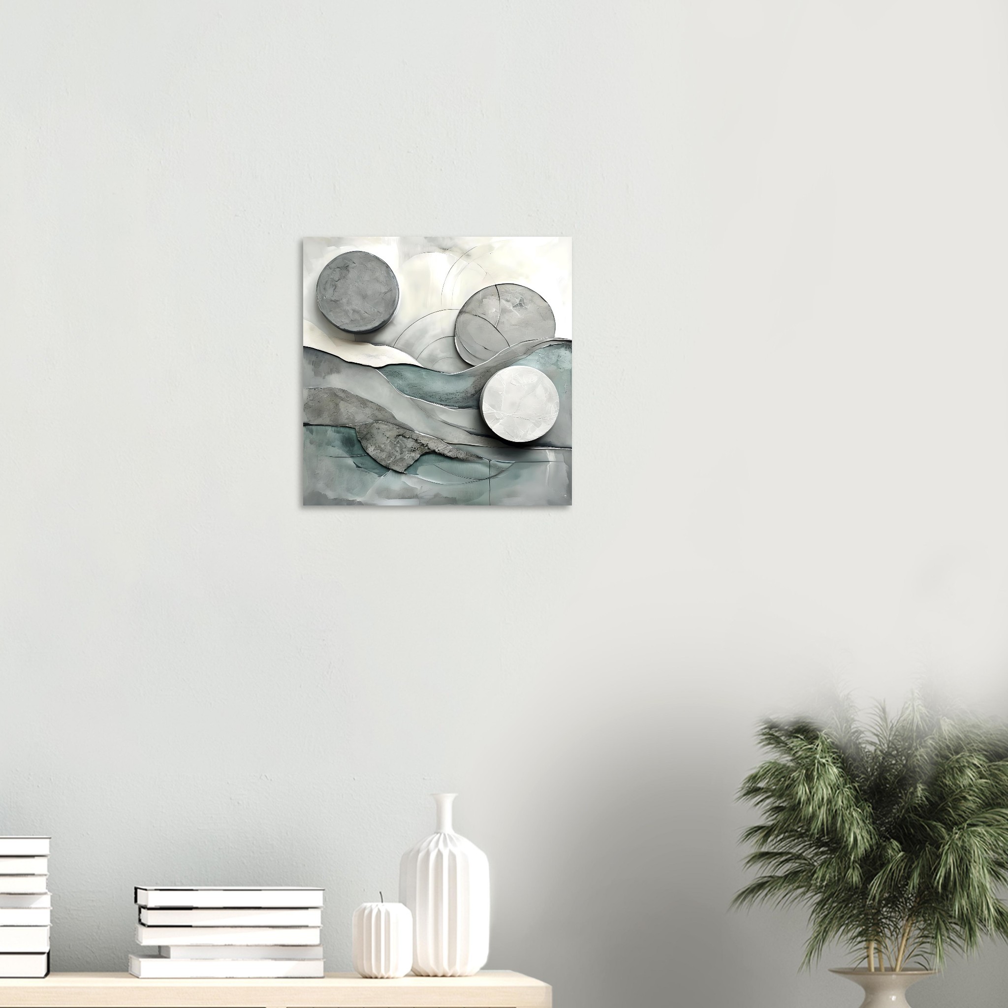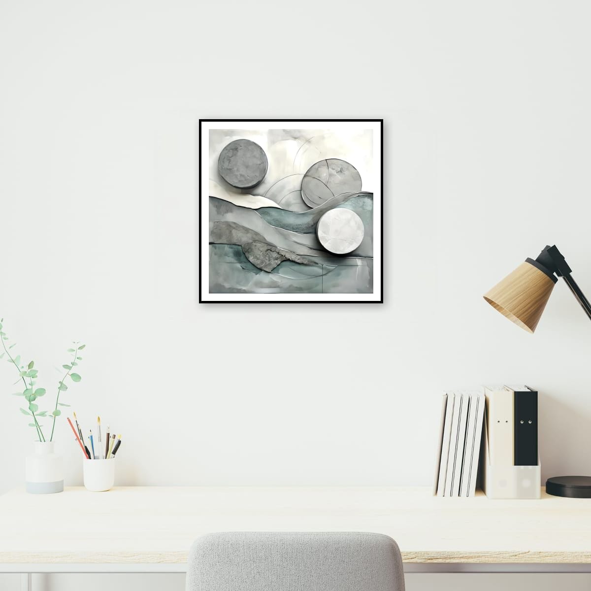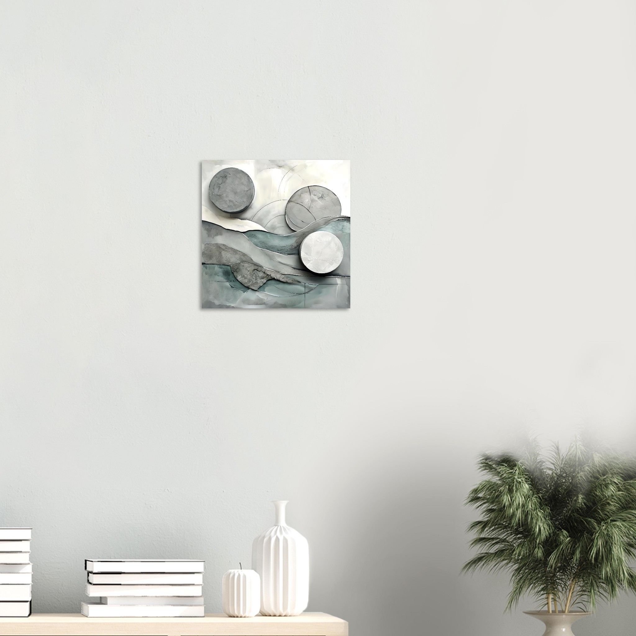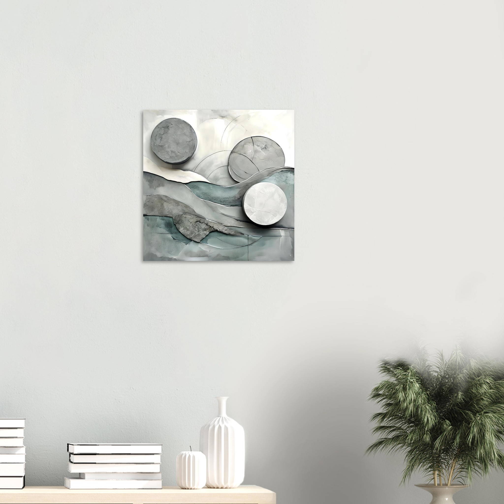 Still Forms, Moving Ground is an abstract composition built around balance, restraint, and subtle movement. Layered circular forms rest within soft, flowing bands, creating a dialogue between structure and fluidity. The geometry provides weight and stability, while the gentle shifts in tone and texture introduce a sense of quiet motion across the surface.