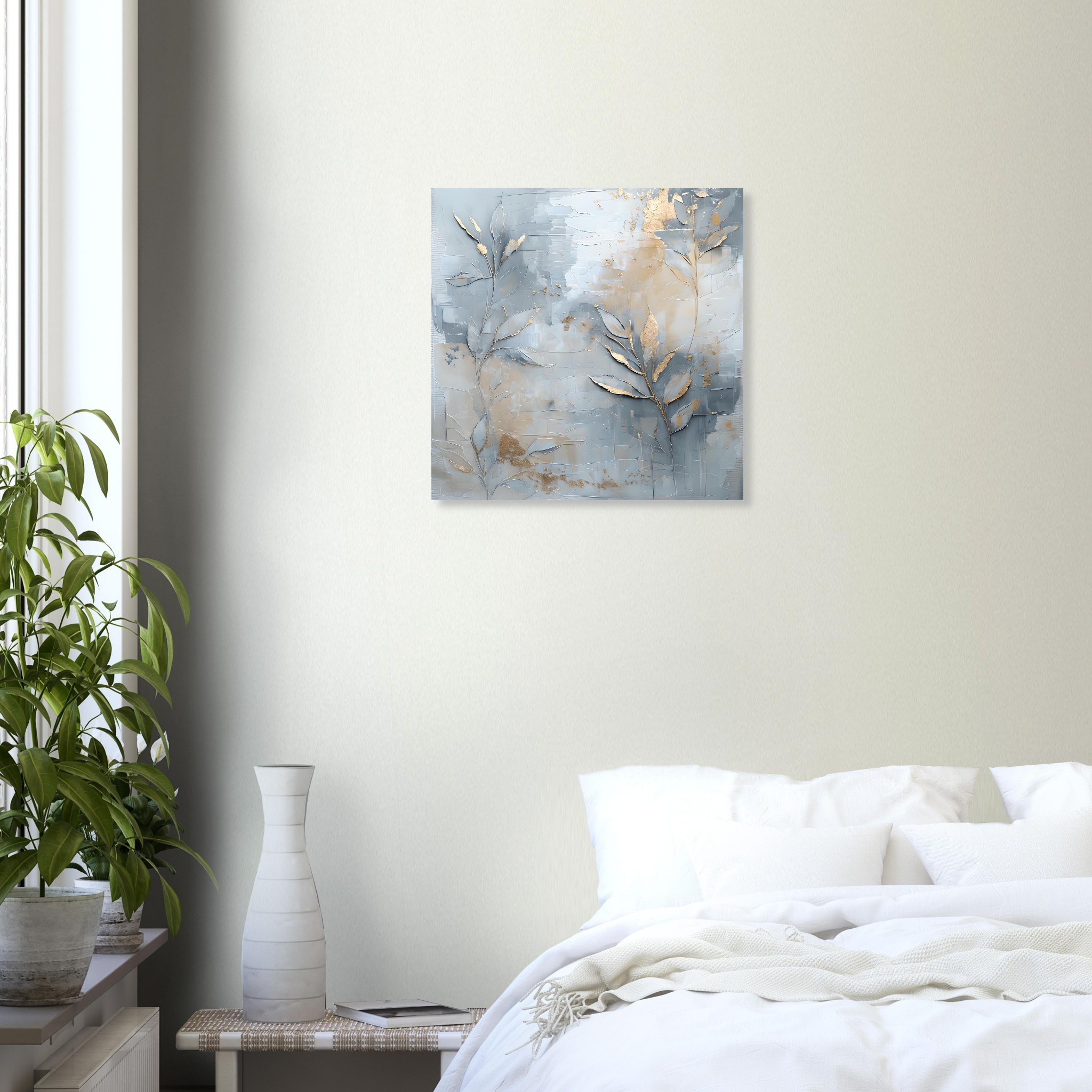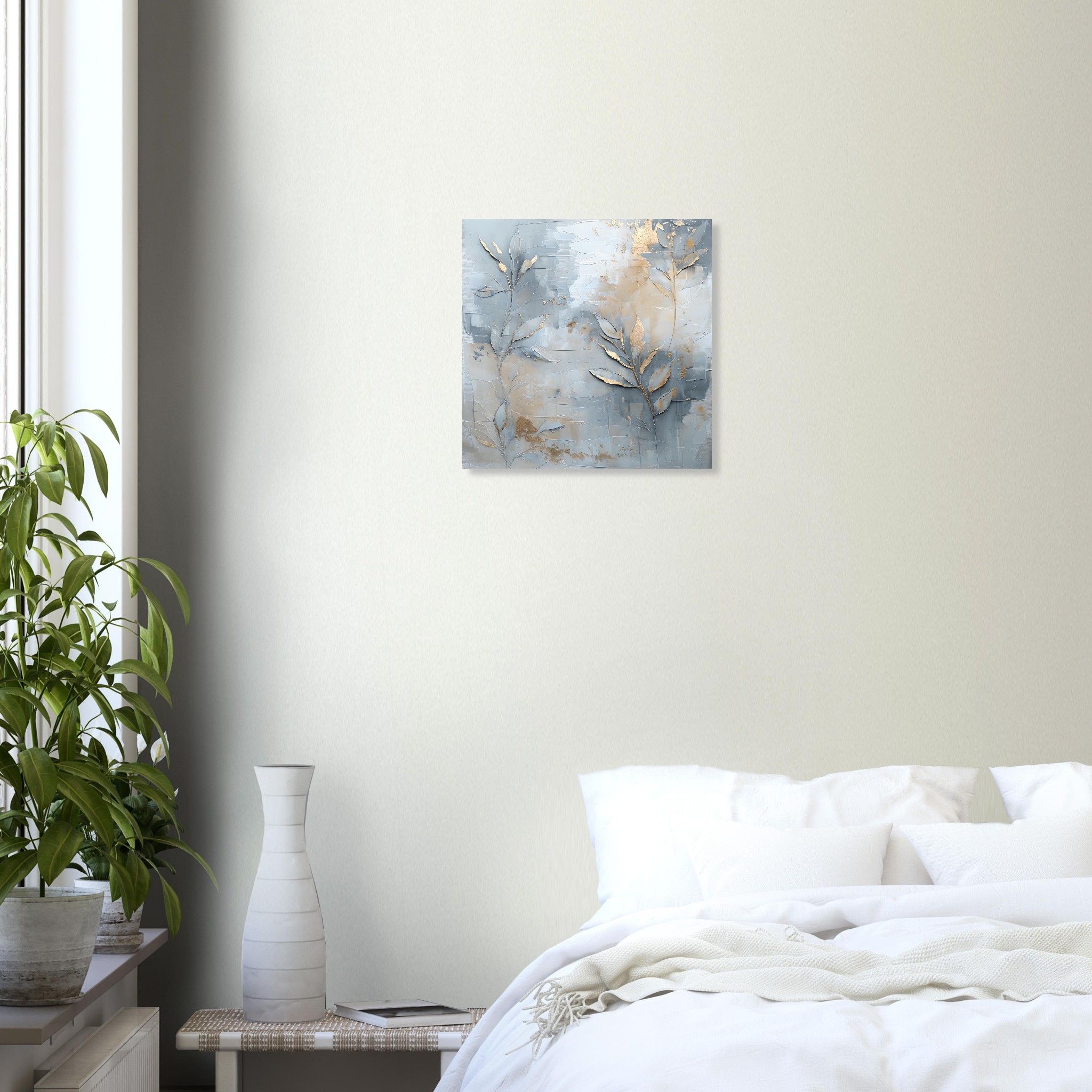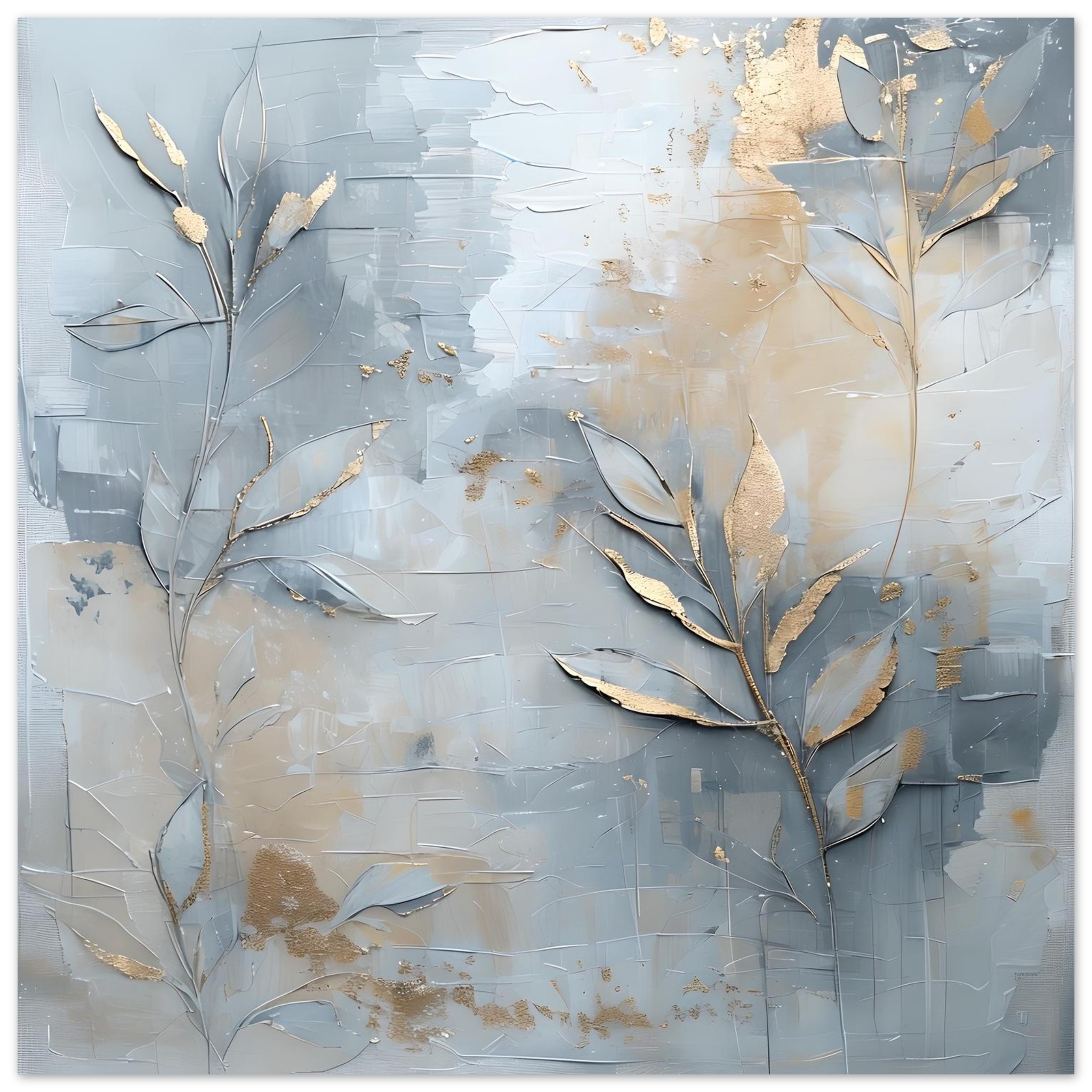 Botanical forms rise through the field without flourish. Their stems and leaves appear pressed into the surface rather than placed upon it, as if recorded after growth rather than celebrated during it. Gold appears sparingly, not as embellishment, but as interruption—small traces that catch against the muted ground and then recede again.
