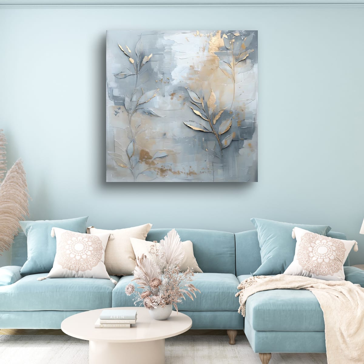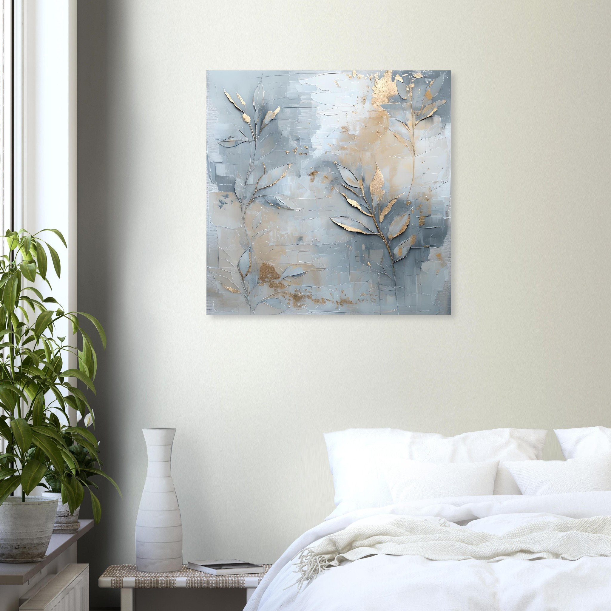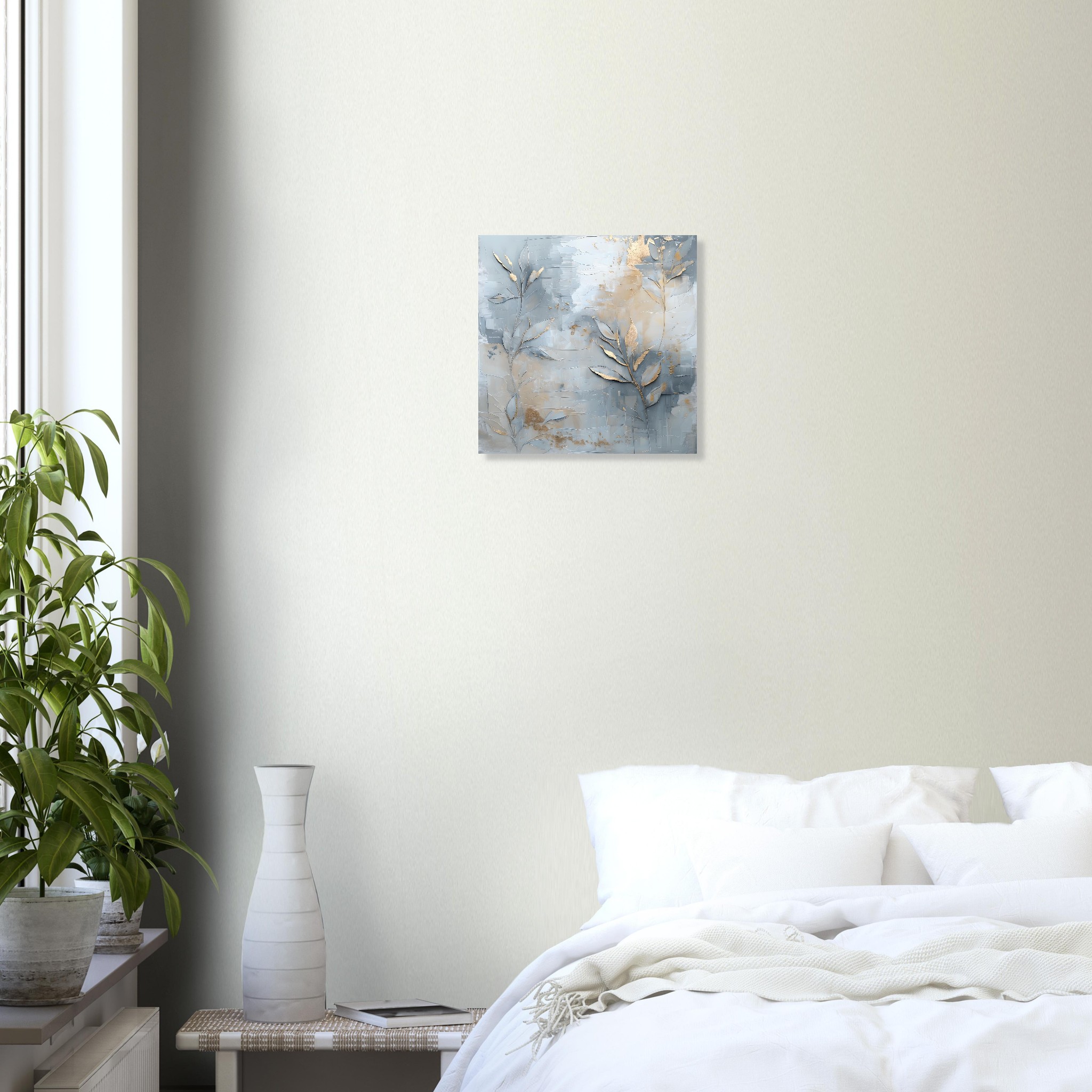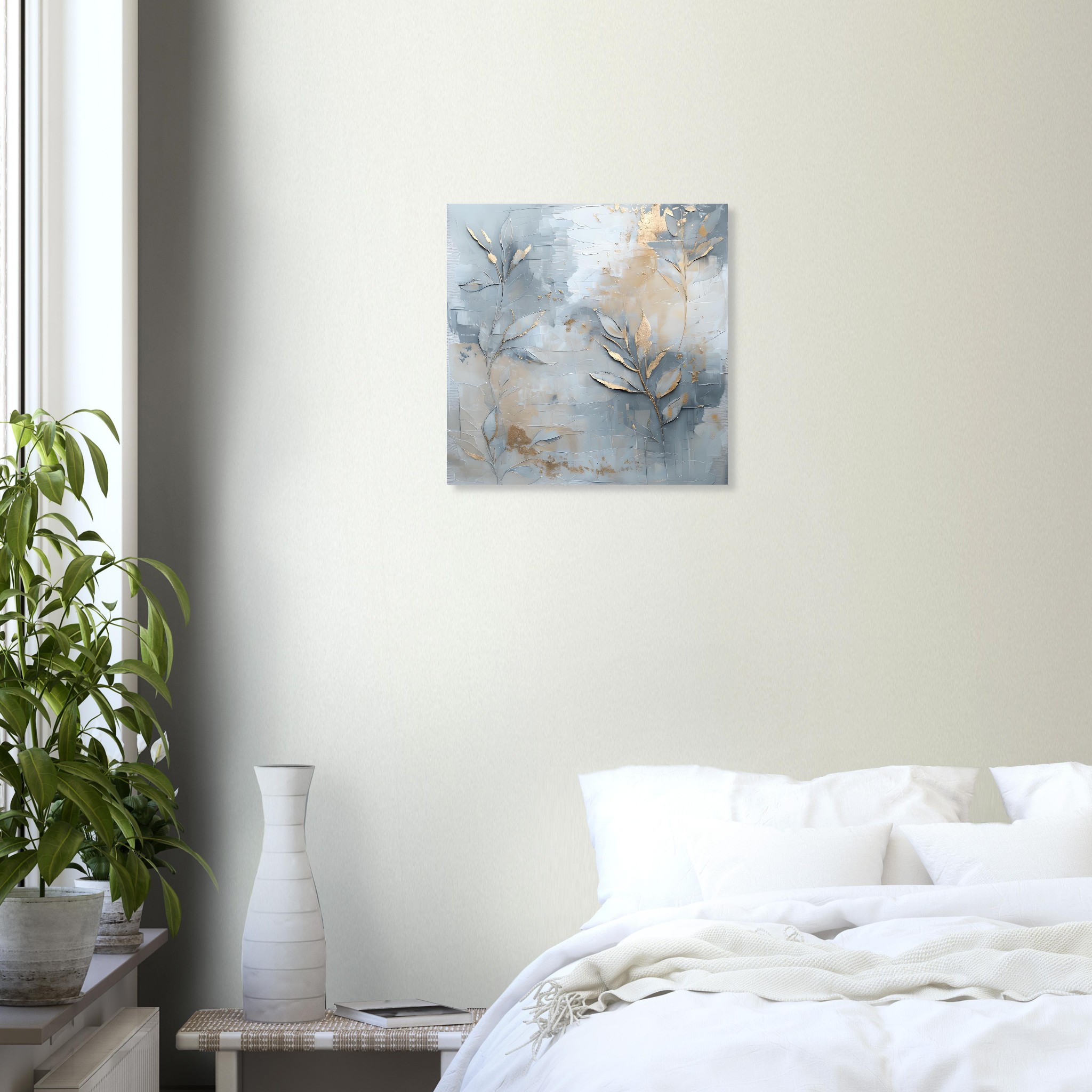 Botanical forms rise through the field without flourish. Their stems and leaves appear pressed into the surface rather than placed upon it, as if recorded after growth rather than celebrated during it. Gold appears sparingly, not as embellishment, but as interruption—small traces that catch against the muted ground and then recede again.