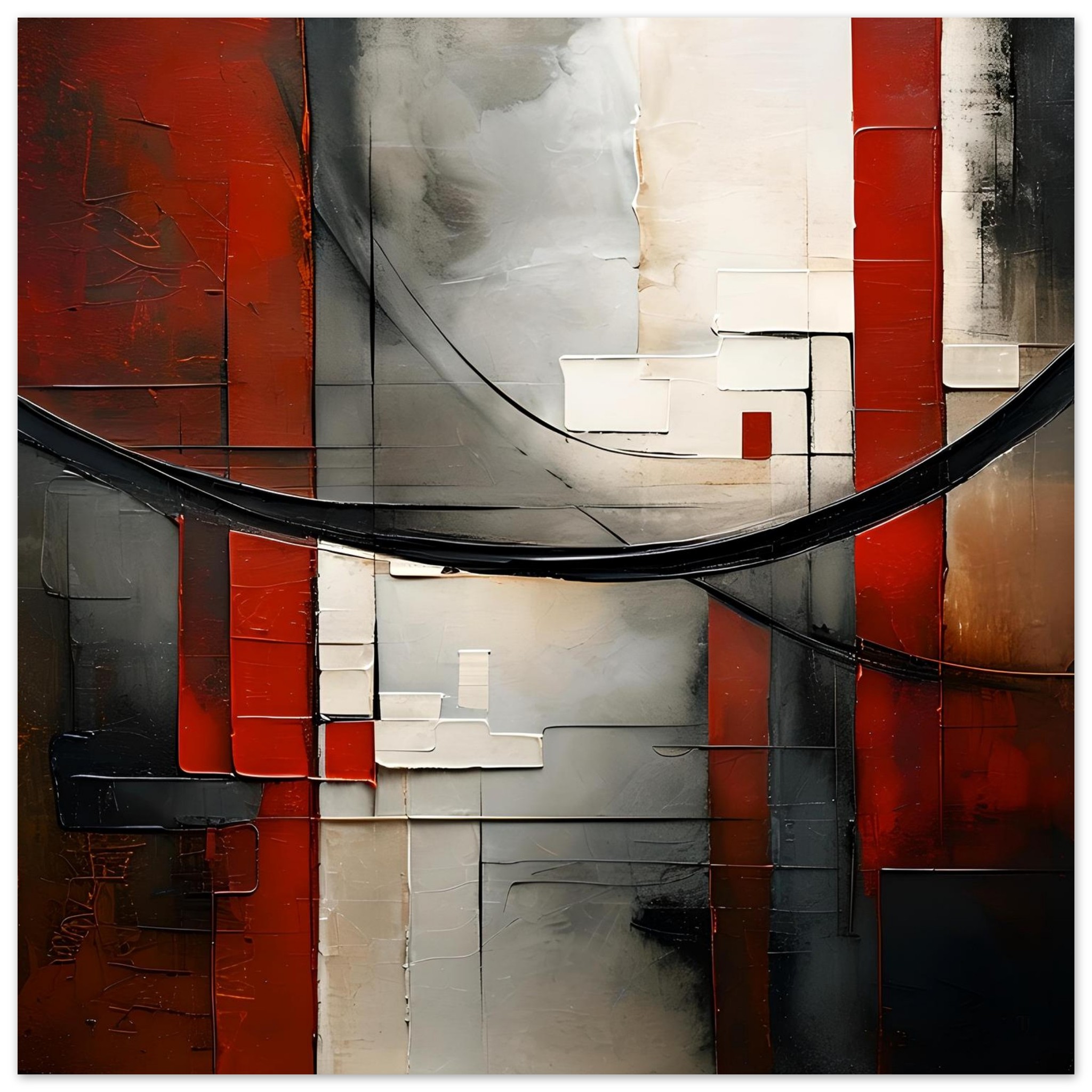 This work is built from rigid vertical structures interrupted by a heavy, suspended arc that cuts across the surface under visible strain. Red pillars stand as load-bearing elements, compressed between scraped greys, off-whites, and darker fields that show clear signs of abrasion and revision. The surface feels constructed, stressed, and held in place rather than resolved.