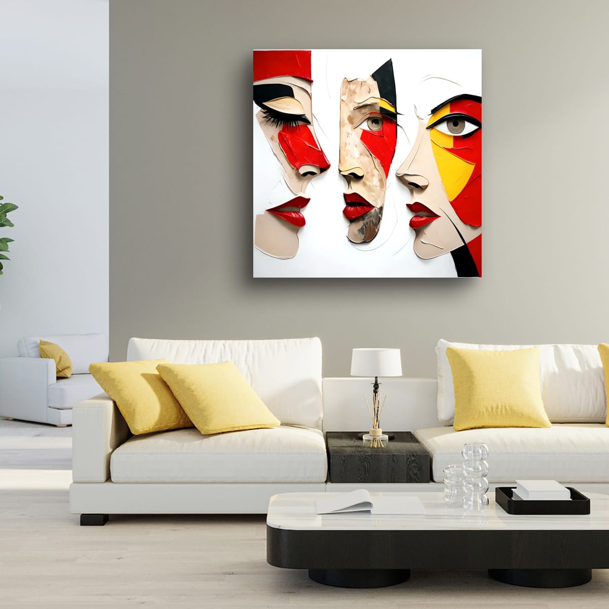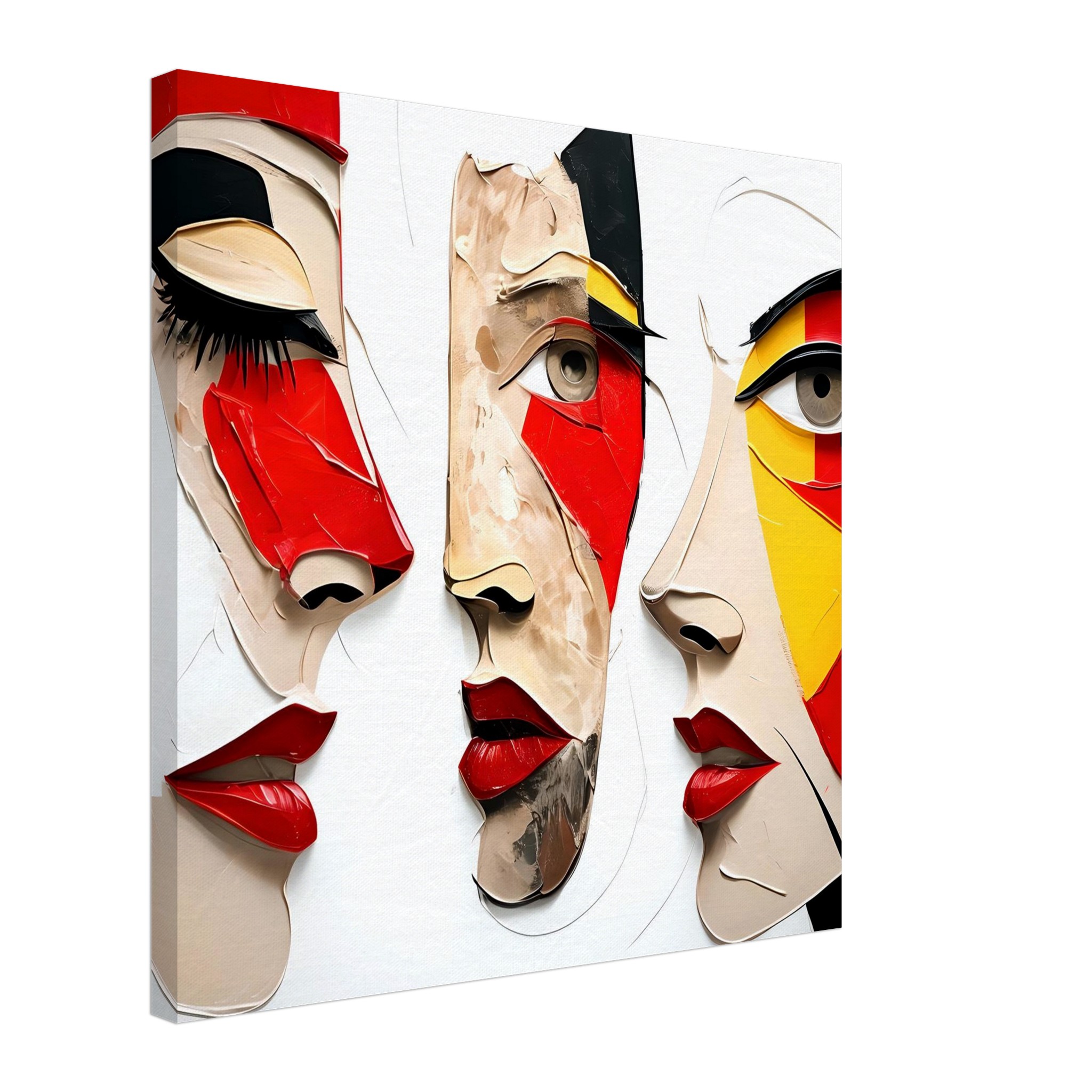 Three faces are held in close proximity, each formed through fractured planes, scraped surfaces, and compressed colour blocks. The figures do not meet evenly; they press against one another through misalignment, overlap, and visual tension rather than contact. Red, ochre, black, and pale flesh tones are cut sharply into the faces, exposing seams, distortions, and areas of abrasion that remain deliberately unresolved.