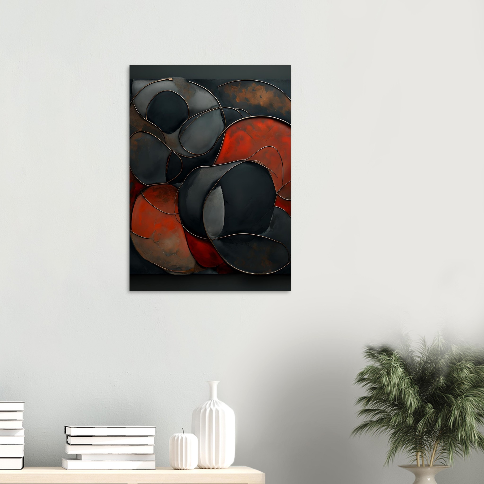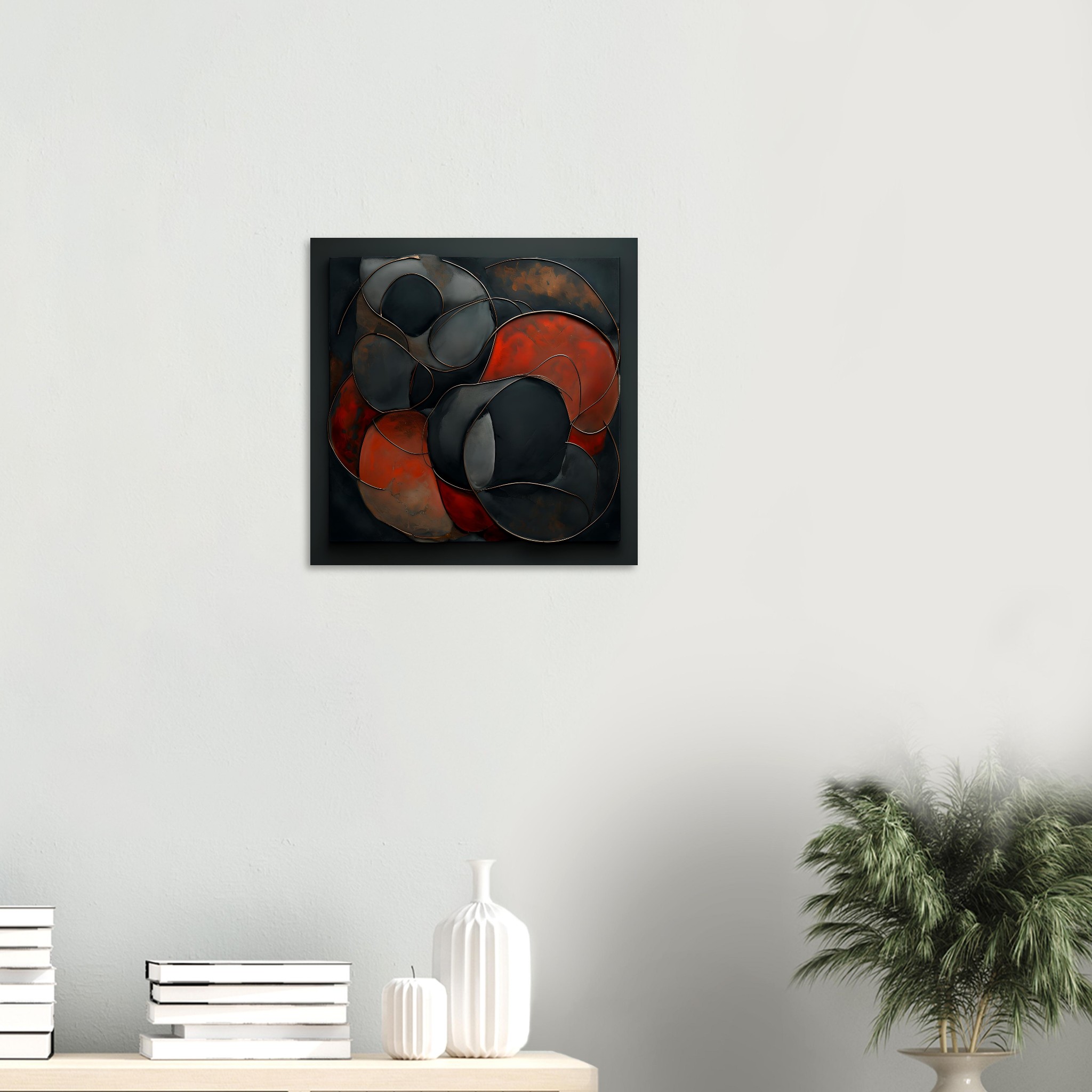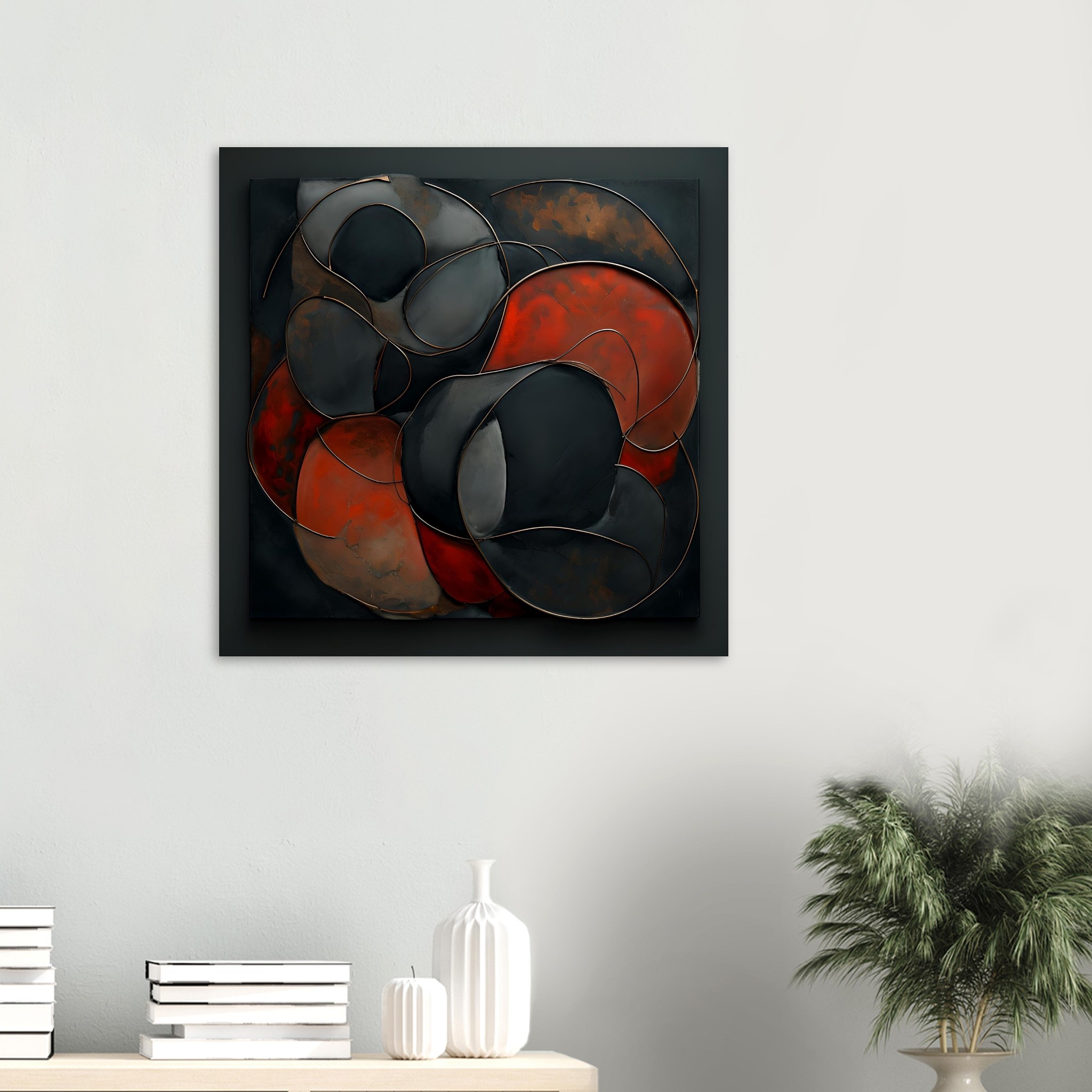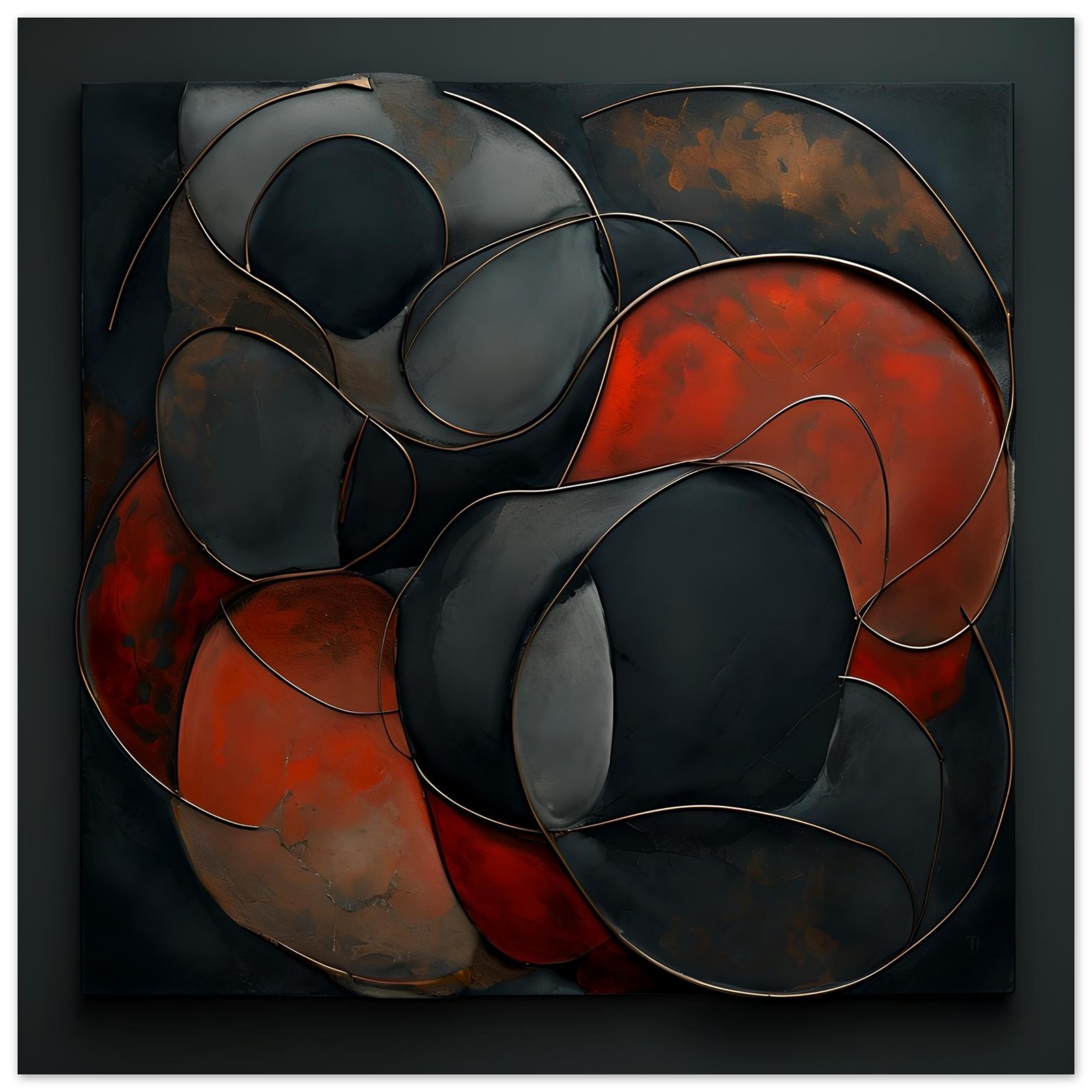 The surface is dense and compressed, built from darkened fields that feel pressed together rather than layered gently. Blacks and deep charcoals dominate, carrying scuffs, abrasions, and dull fractures beneath the skin. These areas absorb light instead of reflecting it, giving the work a weighted, inward pull. Reds emerge in restrained but forceful passages, reading as exposed pressure rather than decorative colour.