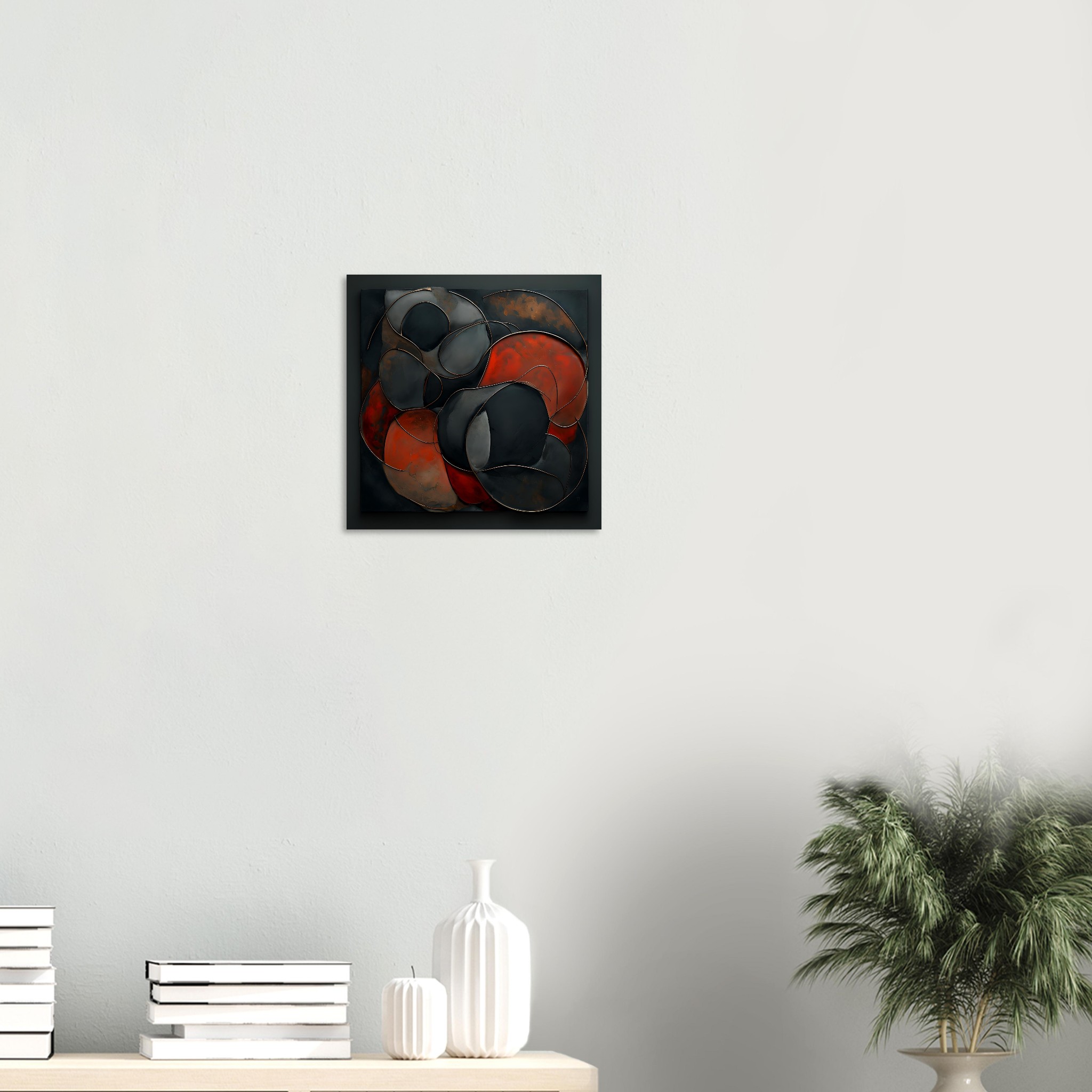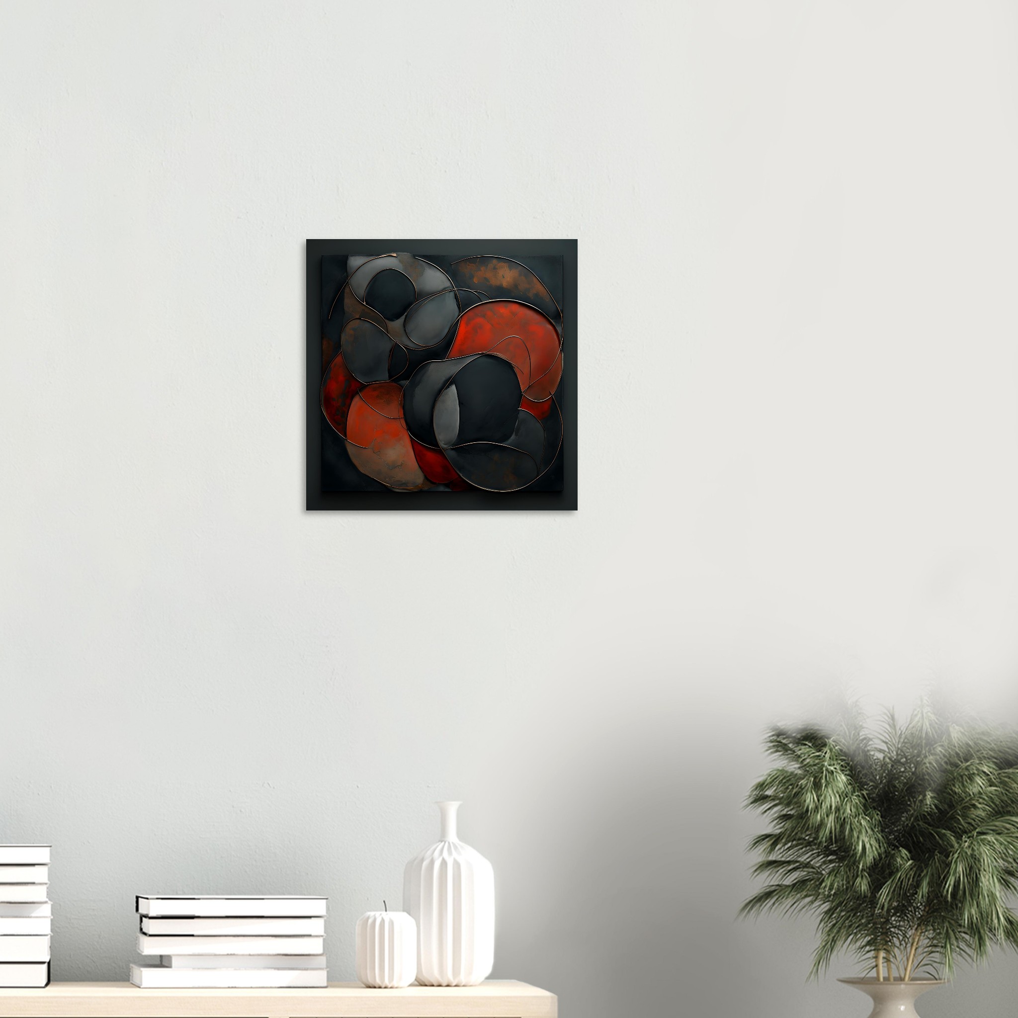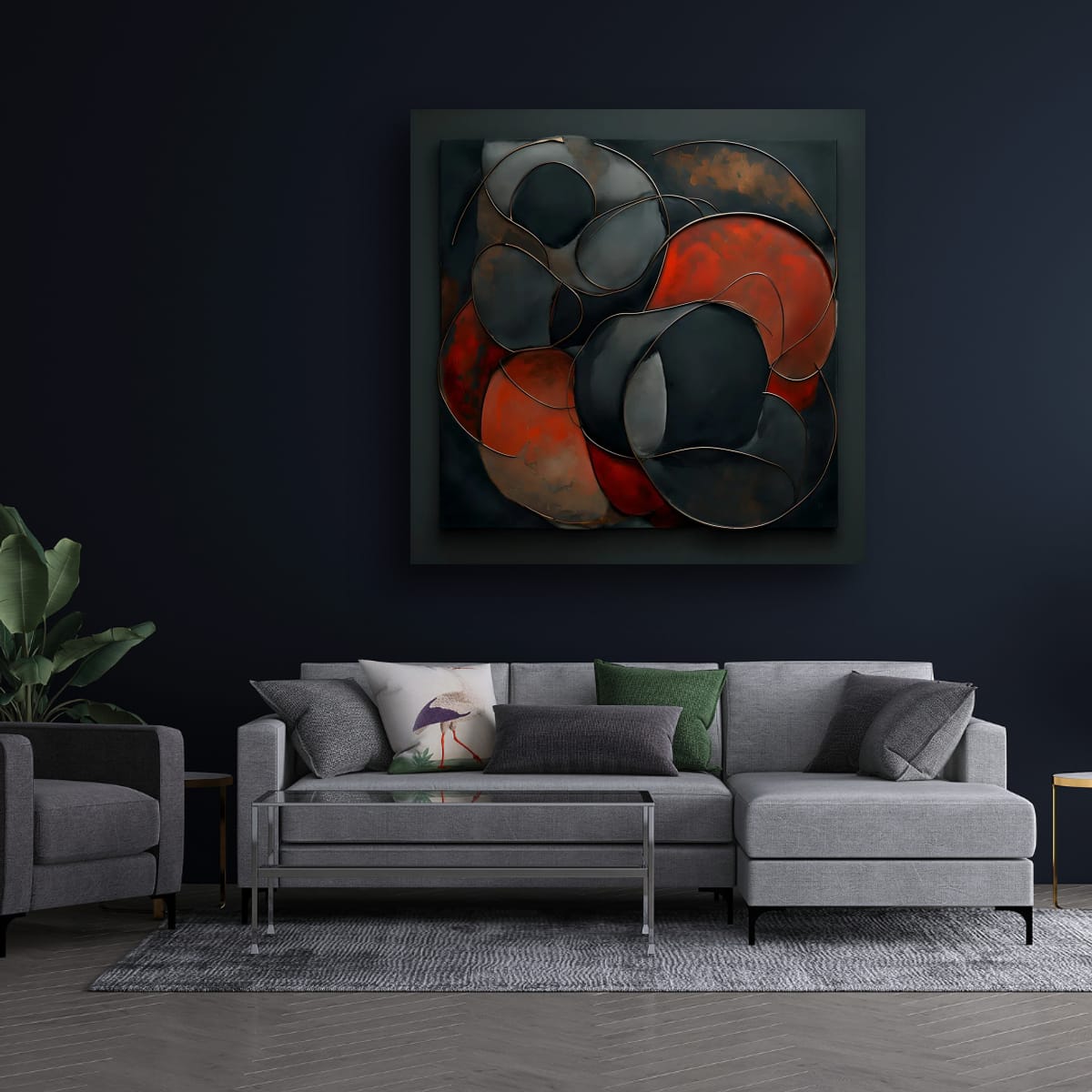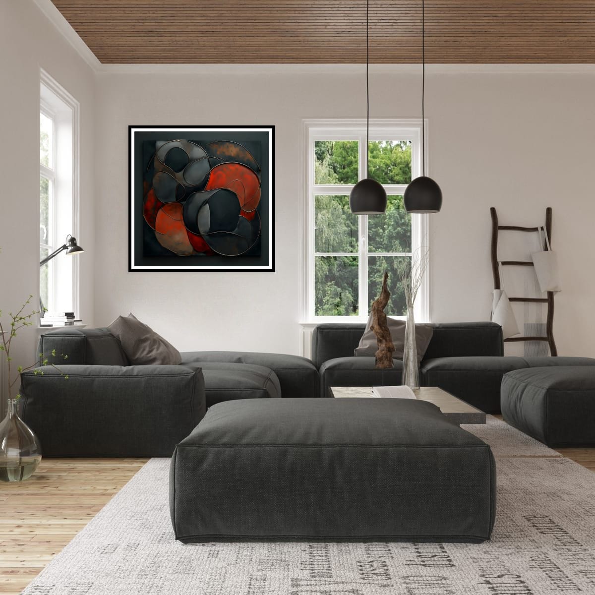 The surface is dense and compressed, built from darkened fields that feel pressed together rather than layered gently. Blacks and deep charcoals dominate, carrying scuffs, abrasions, and dull fractures beneath the skin. These areas absorb light instead of reflecting it, giving the work a weighted, inward pull. Reds emerge in restrained but forceful passages, reading as exposed pressure rather than decorative colour.