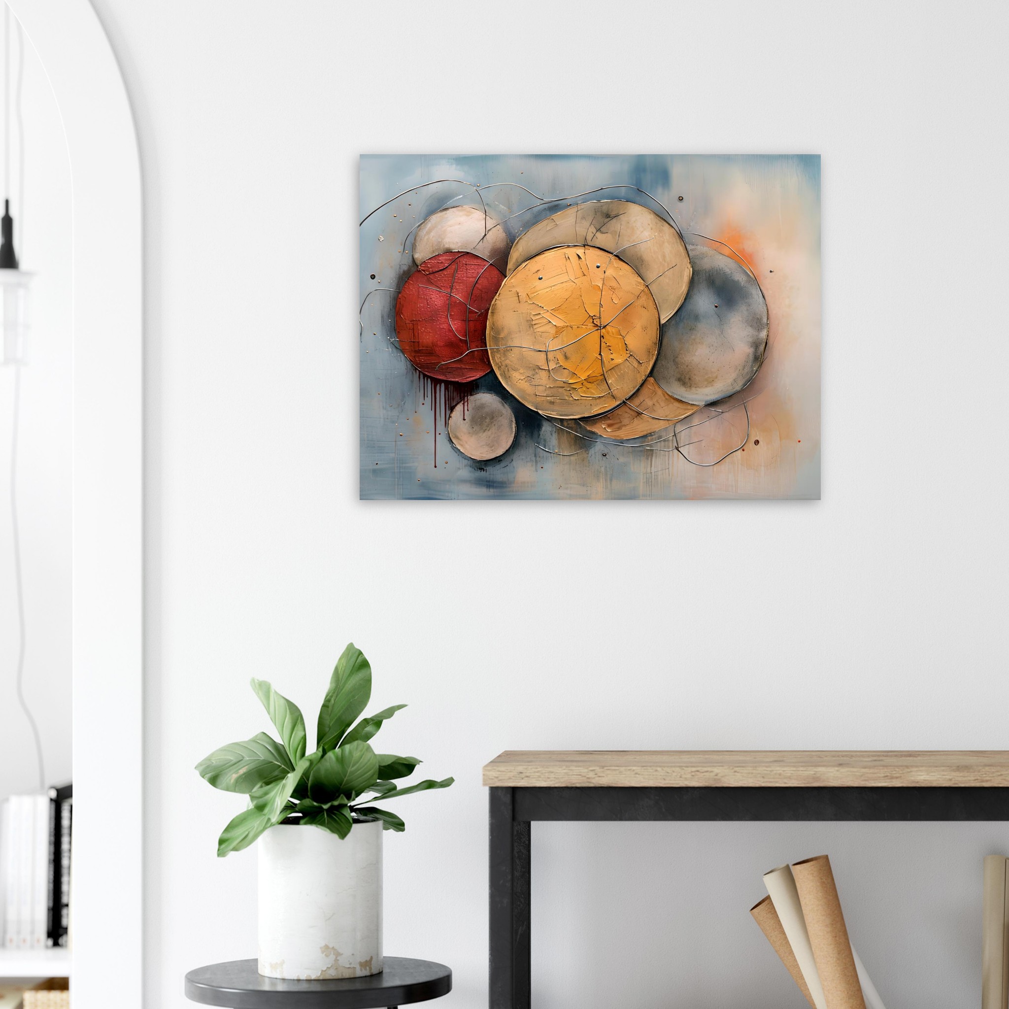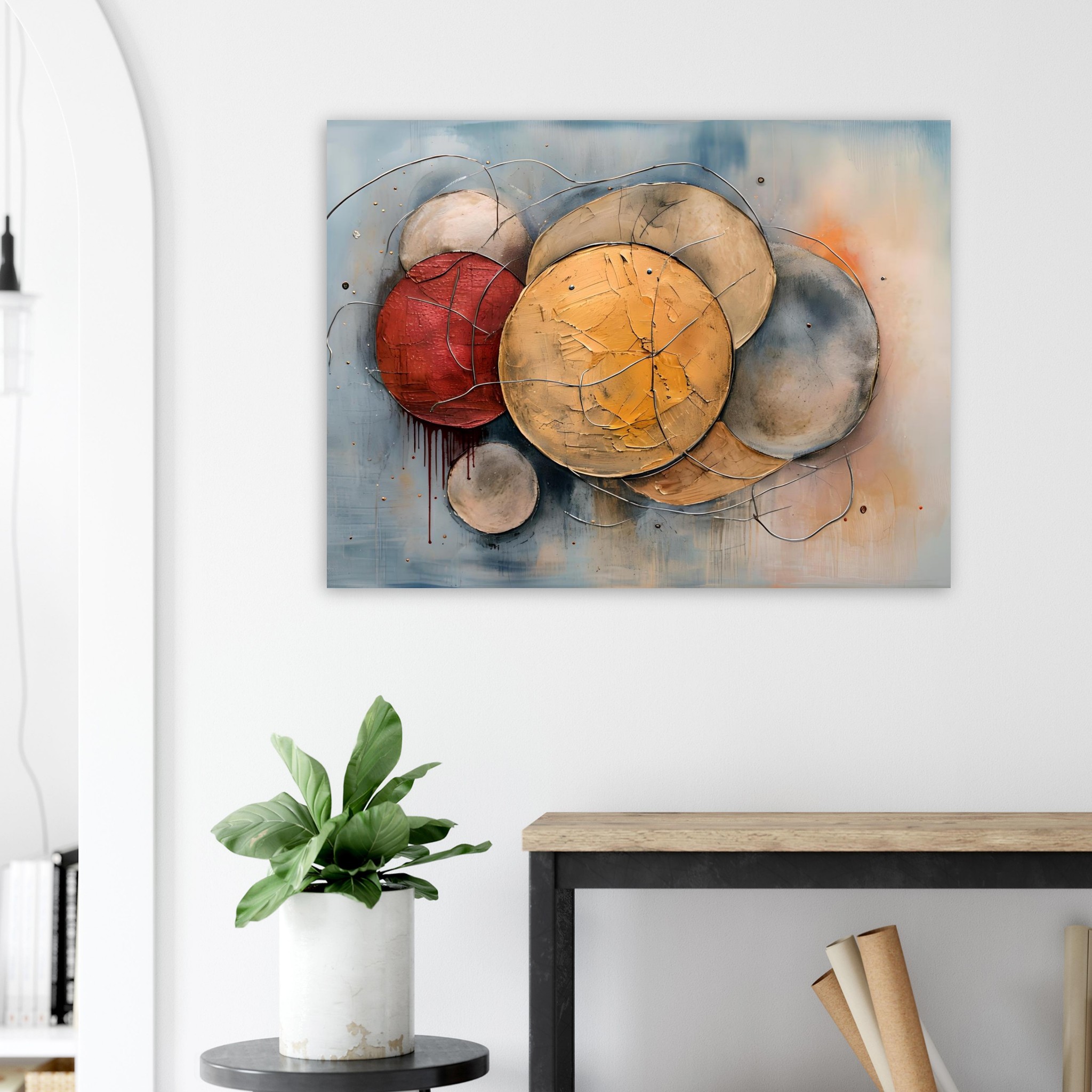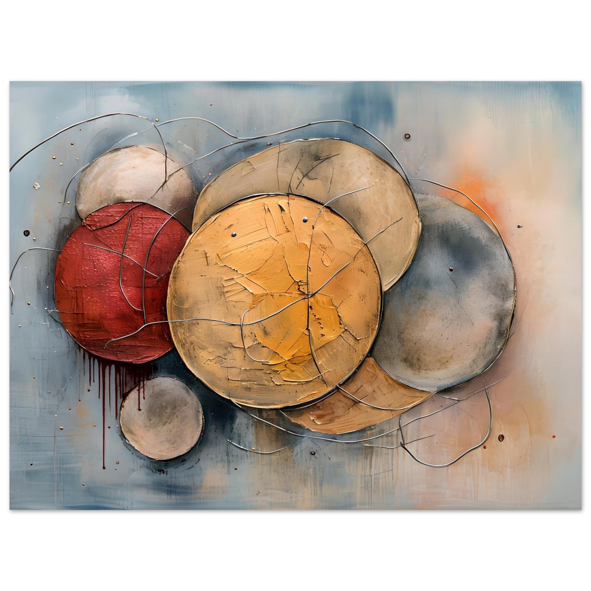 Muted blues and greys establish a steady ground, interrupted by ochre and rust tones that introduce warmth without destabilising the composition. A restrained red mark bleeds downward at the left edge, subtle but deliberate, suggesting strain rather than rupture. Fine metallic wires trace across and between the forms, acting as connective lines that bind the structure together. They read less as gesture and more as restraint — holding the elements in alignment.