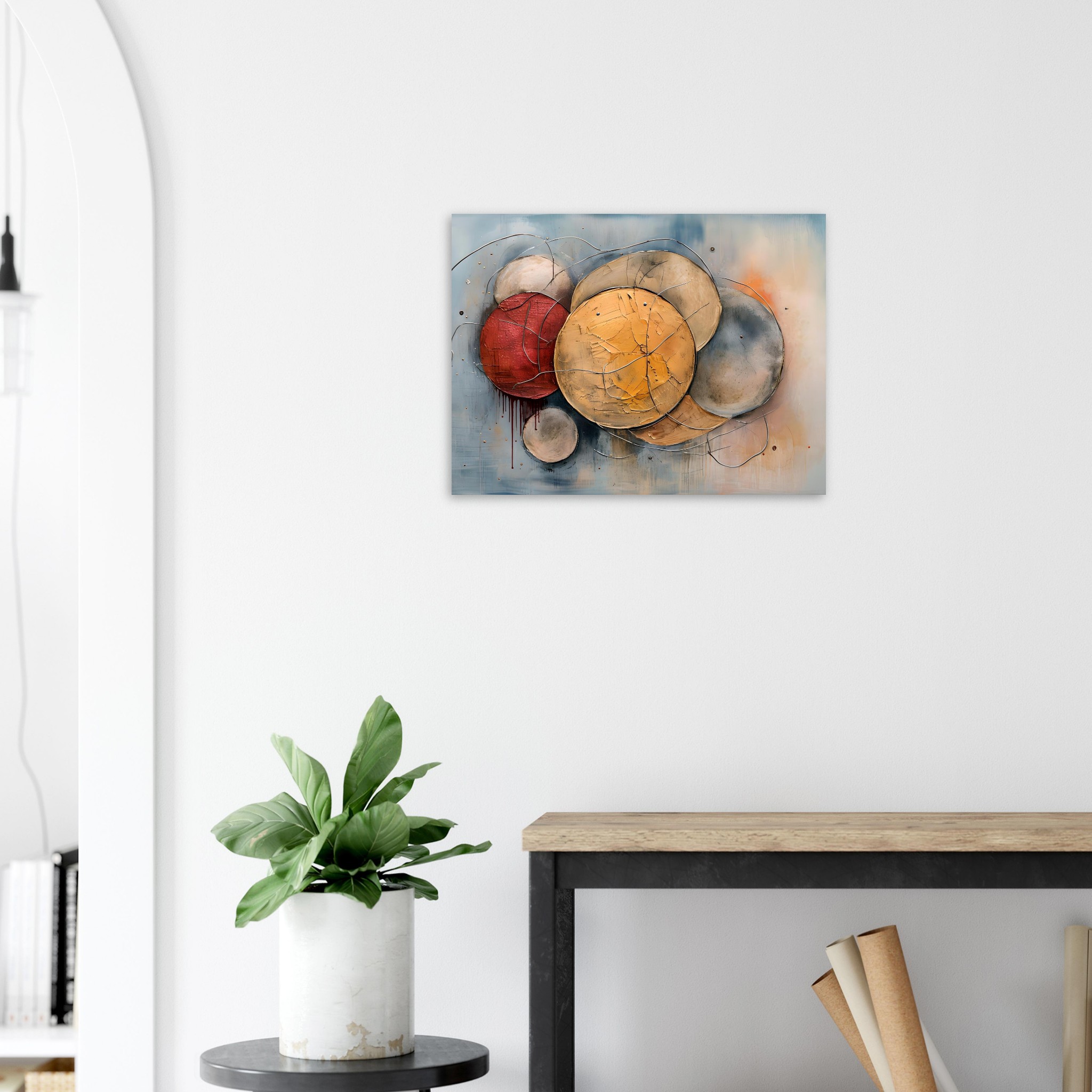This work is built around compression and balance. Overlapping circular forms press into one another, their edges softened by abrasion, cracking, and layered paint that shows clear evidence of handling and revision. The surface feels compacted rather than expansive, as if each element has settled into place through gradual pressure rather than force.