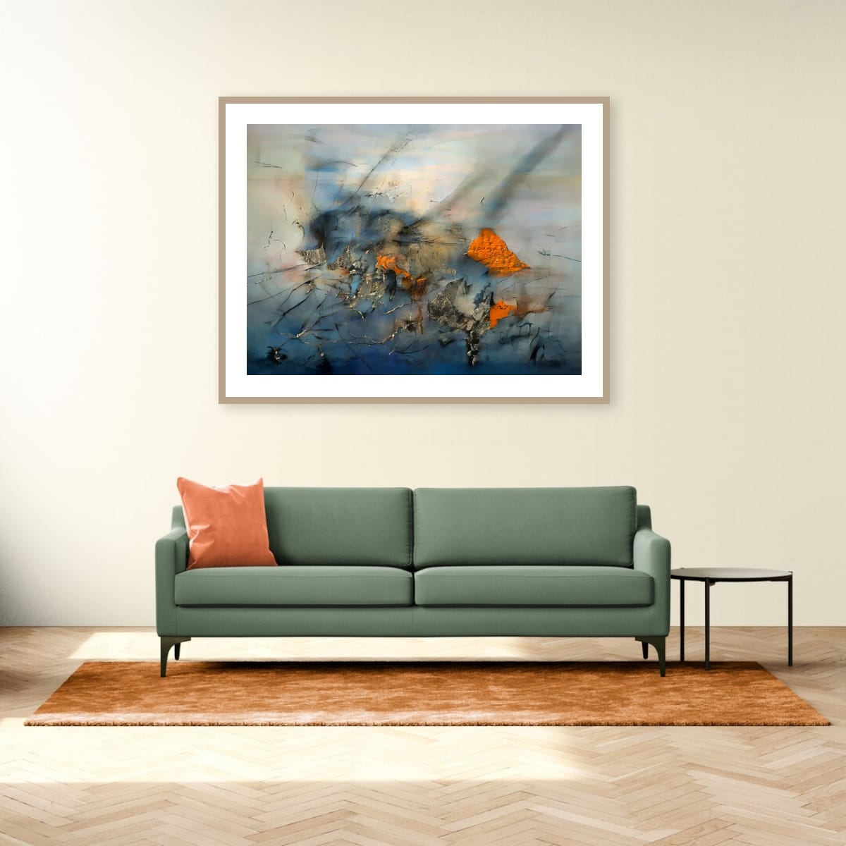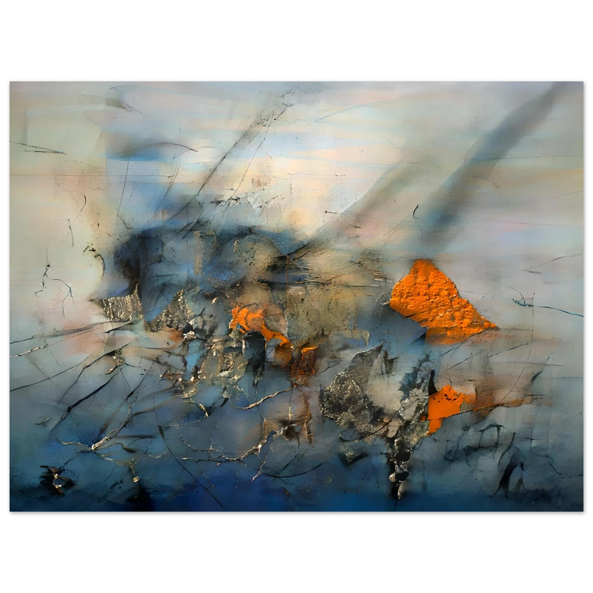Against the muted field, ochre-orange forms emerge like exposed deposits. They interrupt the flow rather than accent it, pressing through the surrounding layers as if uncovered by erosion or impact. Metallic traces and scraped edges reinforce the sense of abrasion, where the surface records pressure rather than calm movement.