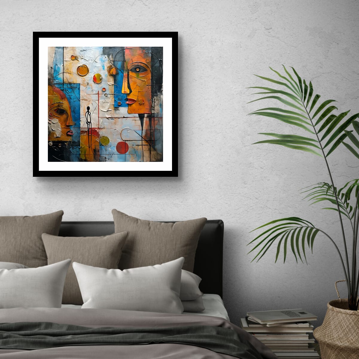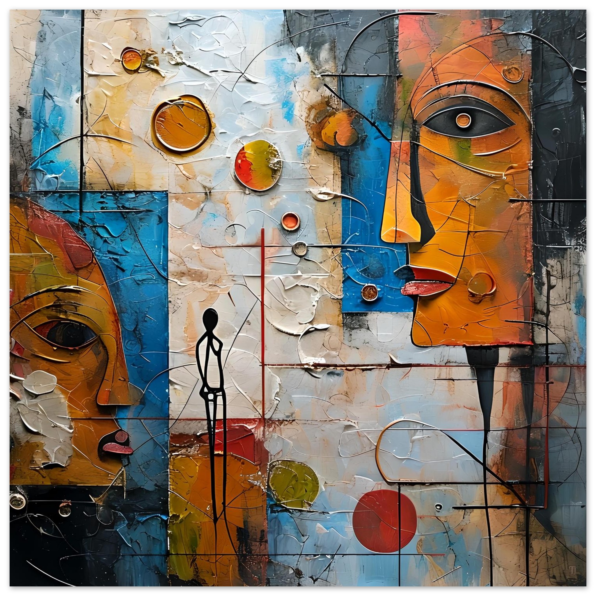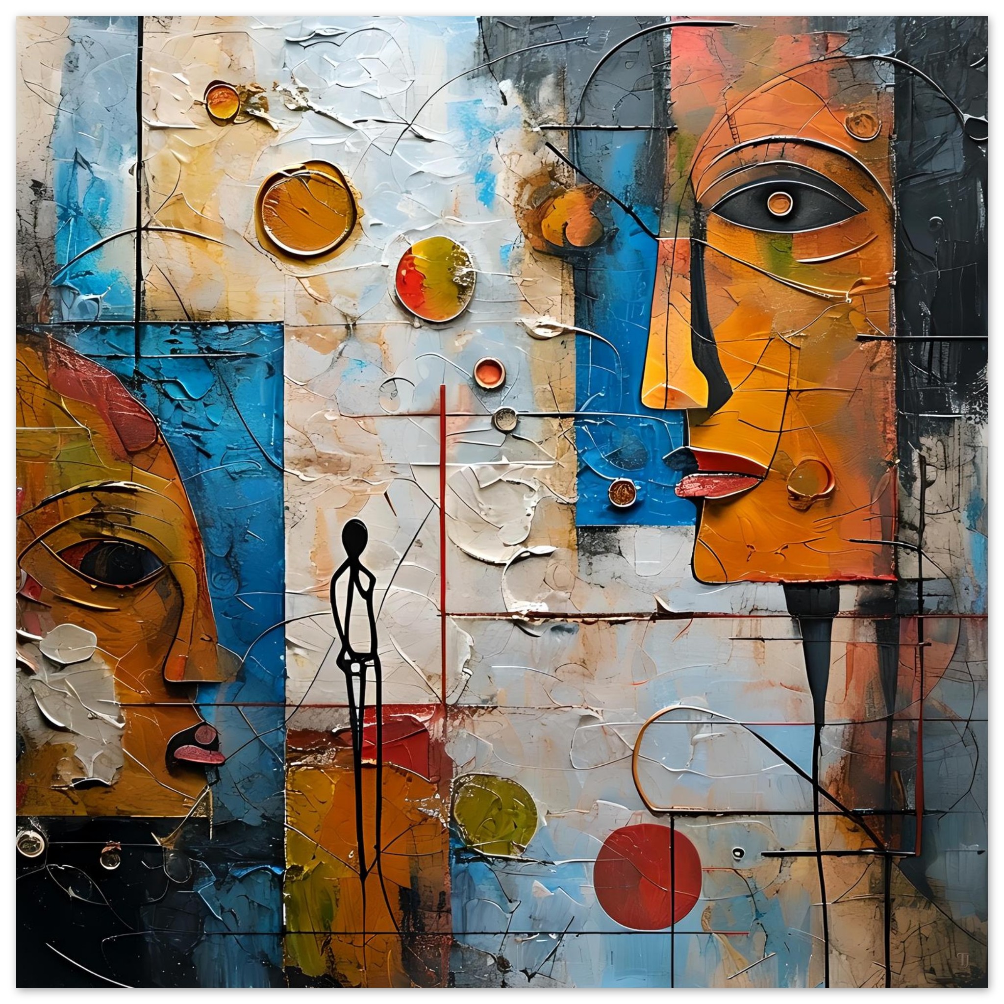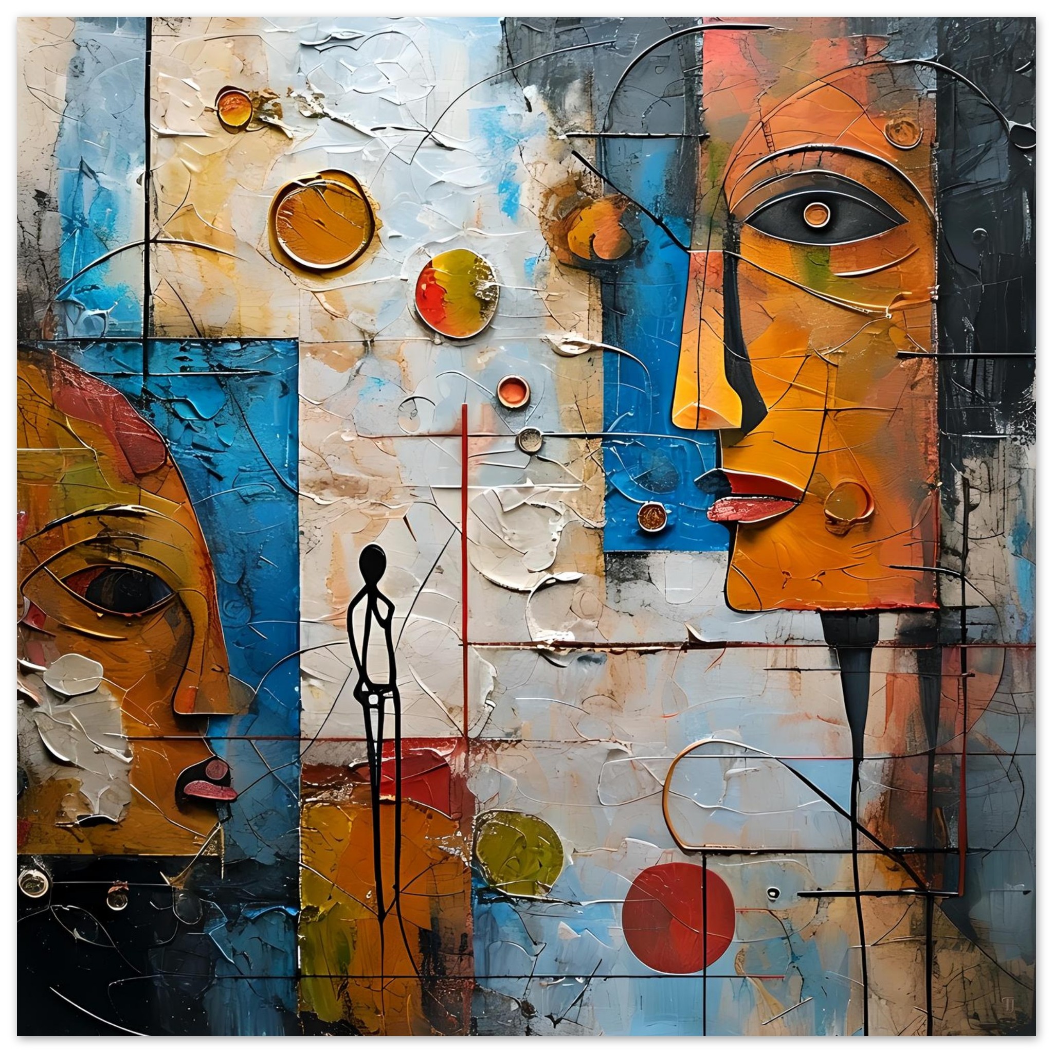 Multiple faces occupy the composition, embedded within a grid of intersecting lines and geometric divisions. These figures do not dominate the space; instead, they appear integrated into a broader system of structure, colour, and interruption. The grid functions as a framework rather than a constraint, allowing elements to coexist without resolving into hierarchy.